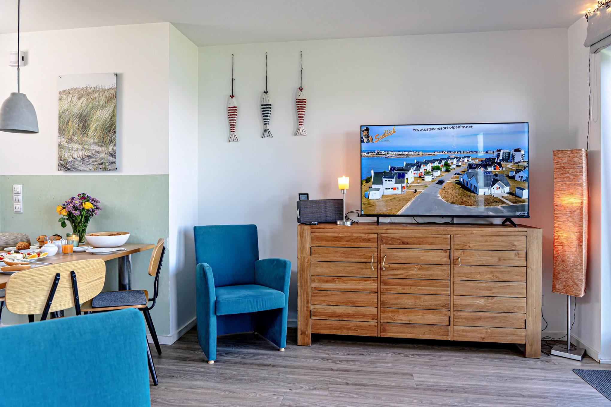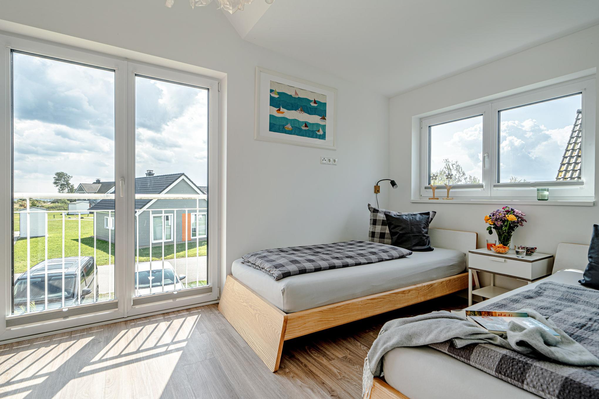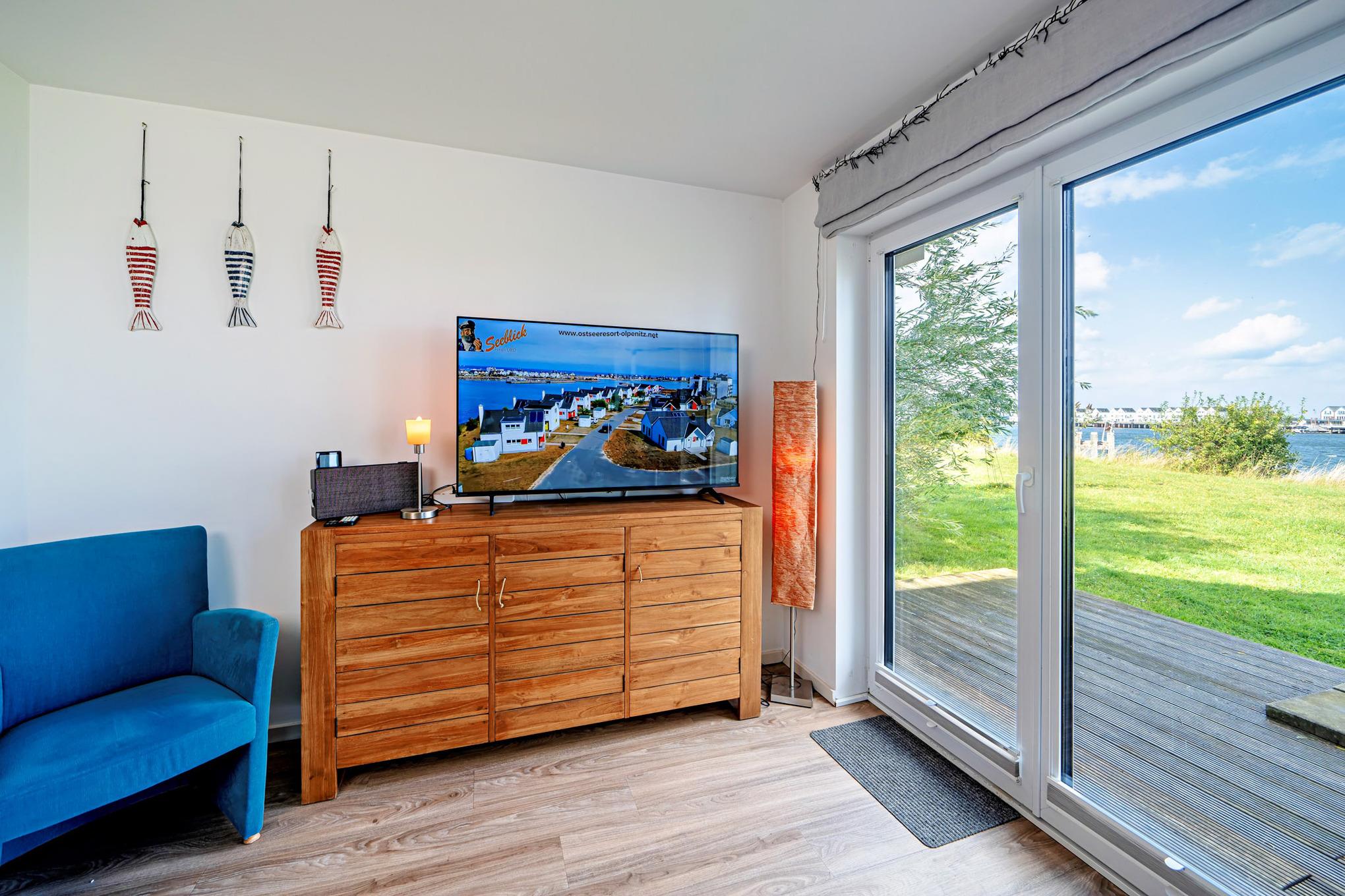 Der offene Wohnbereich im Erdgeschoss ist der perfekte Ort, um den Blick auf das glitzernde Wasser zu genießen. Ob beim gemeinsamen Essen oder bei einem gemütlichen Kaminabend im Wohnzimmer - hier erleben Sie Ostsee-Feeling pur.
