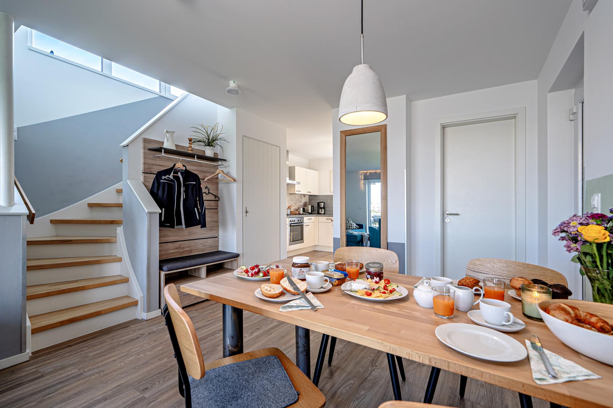 Der Einrichtungsstil des Hauses vereint moderne Eleganz mit maritimem Flair. Natürliche Materialien und harmonische Farbakzente schaffen eine einladende Atmosphäre.