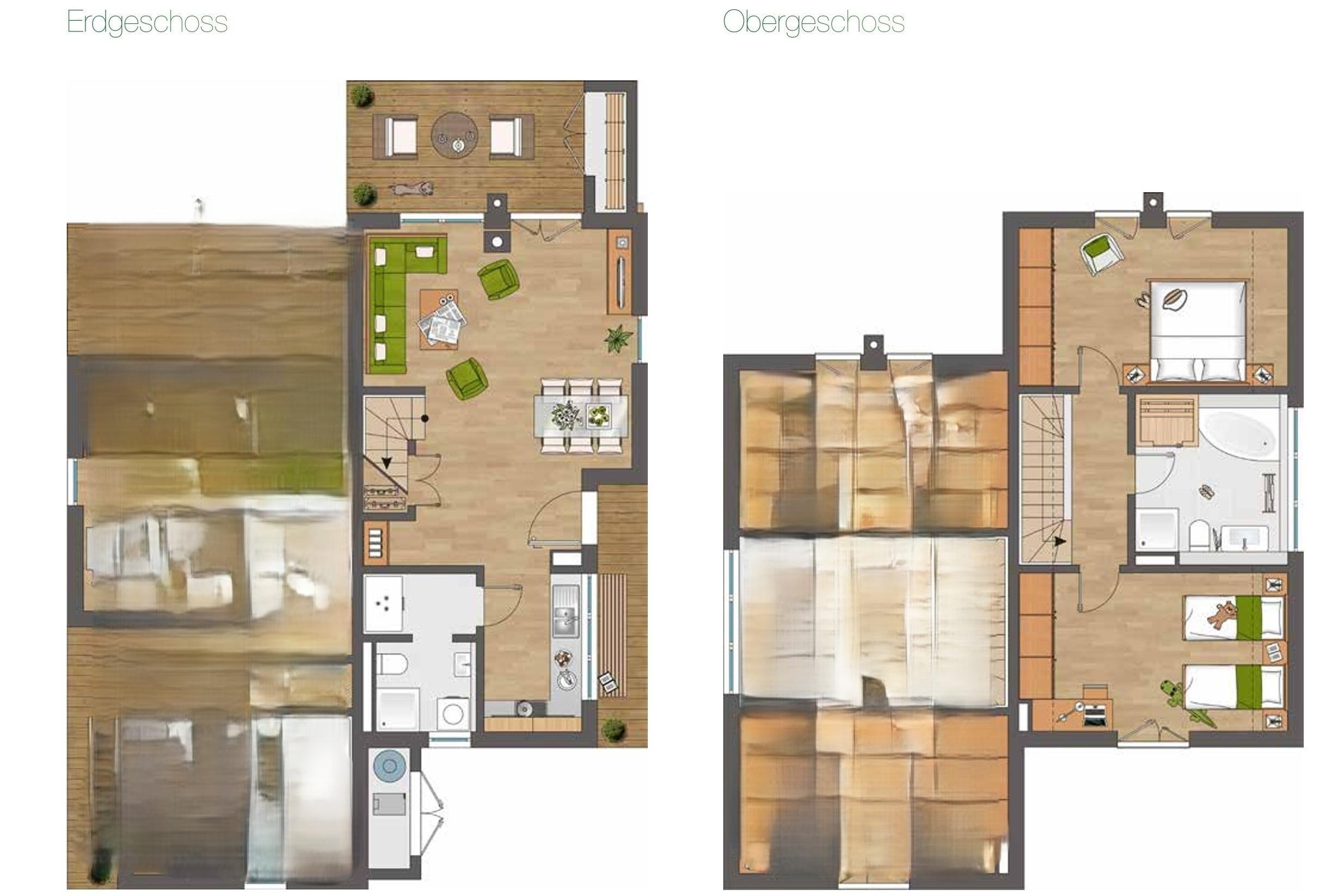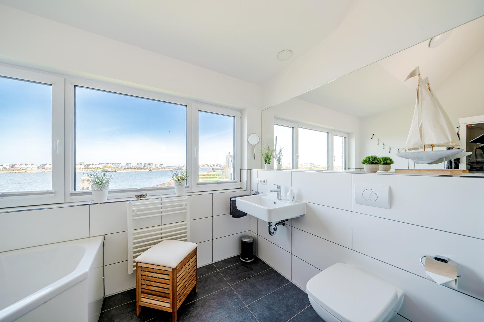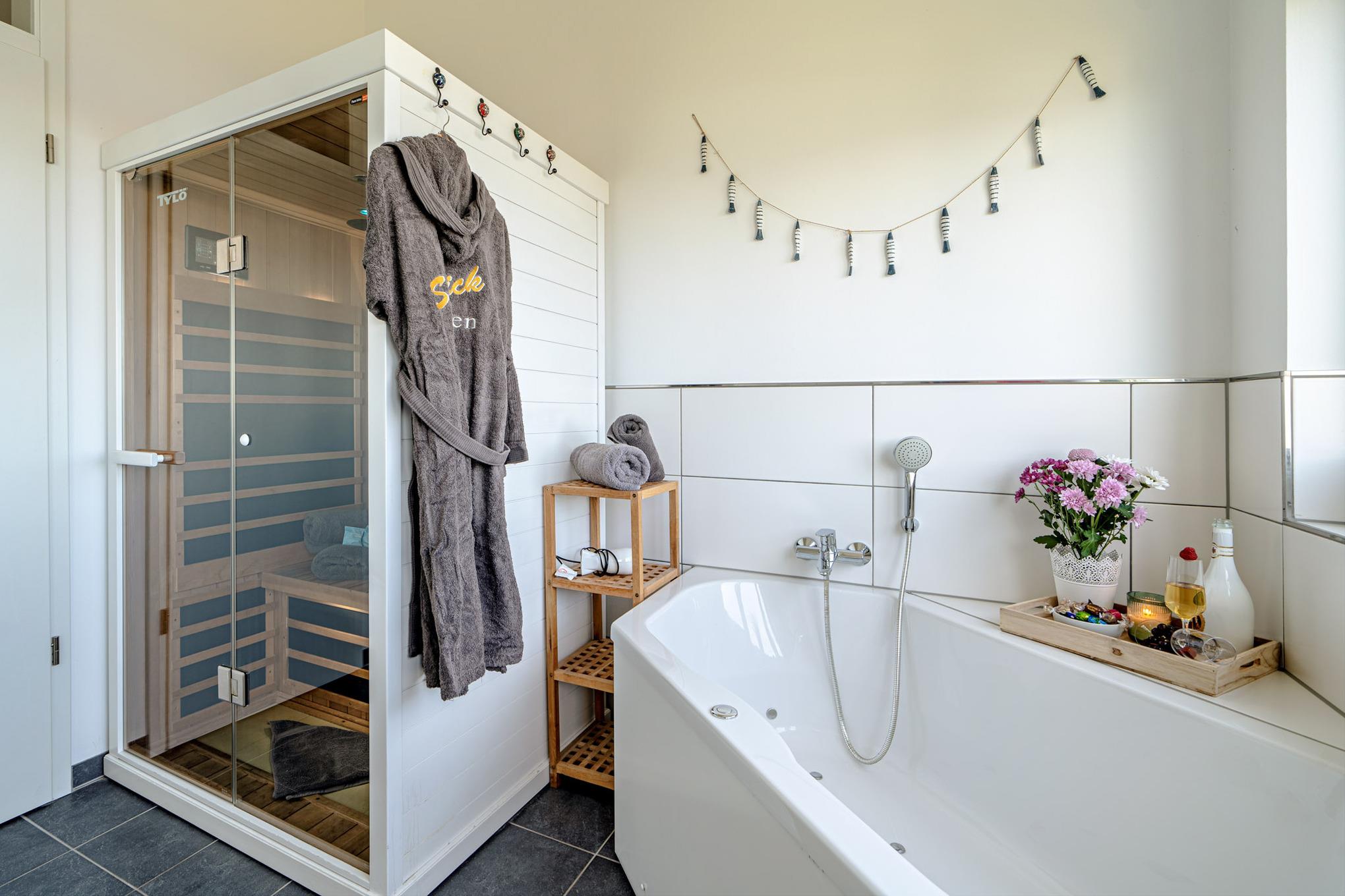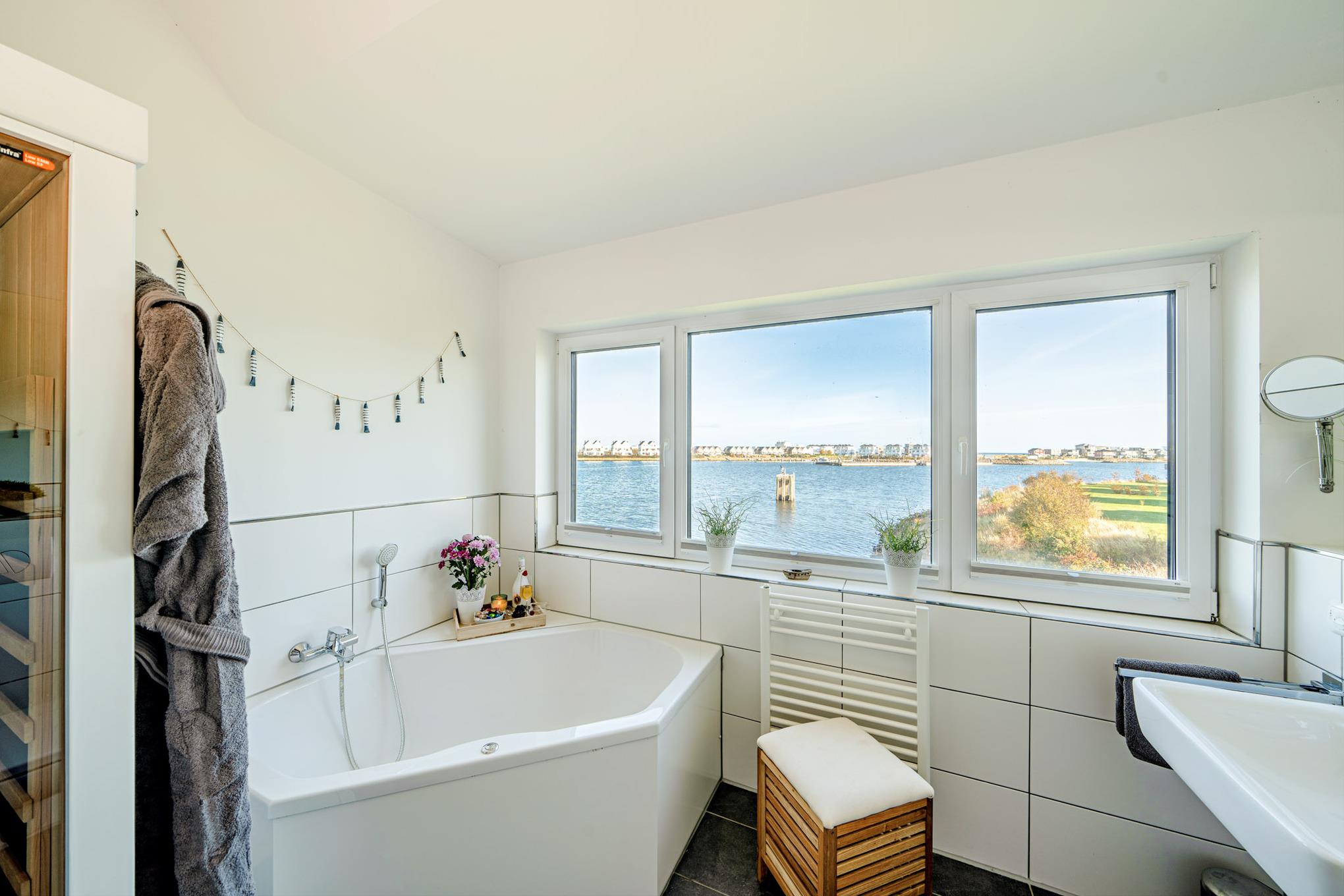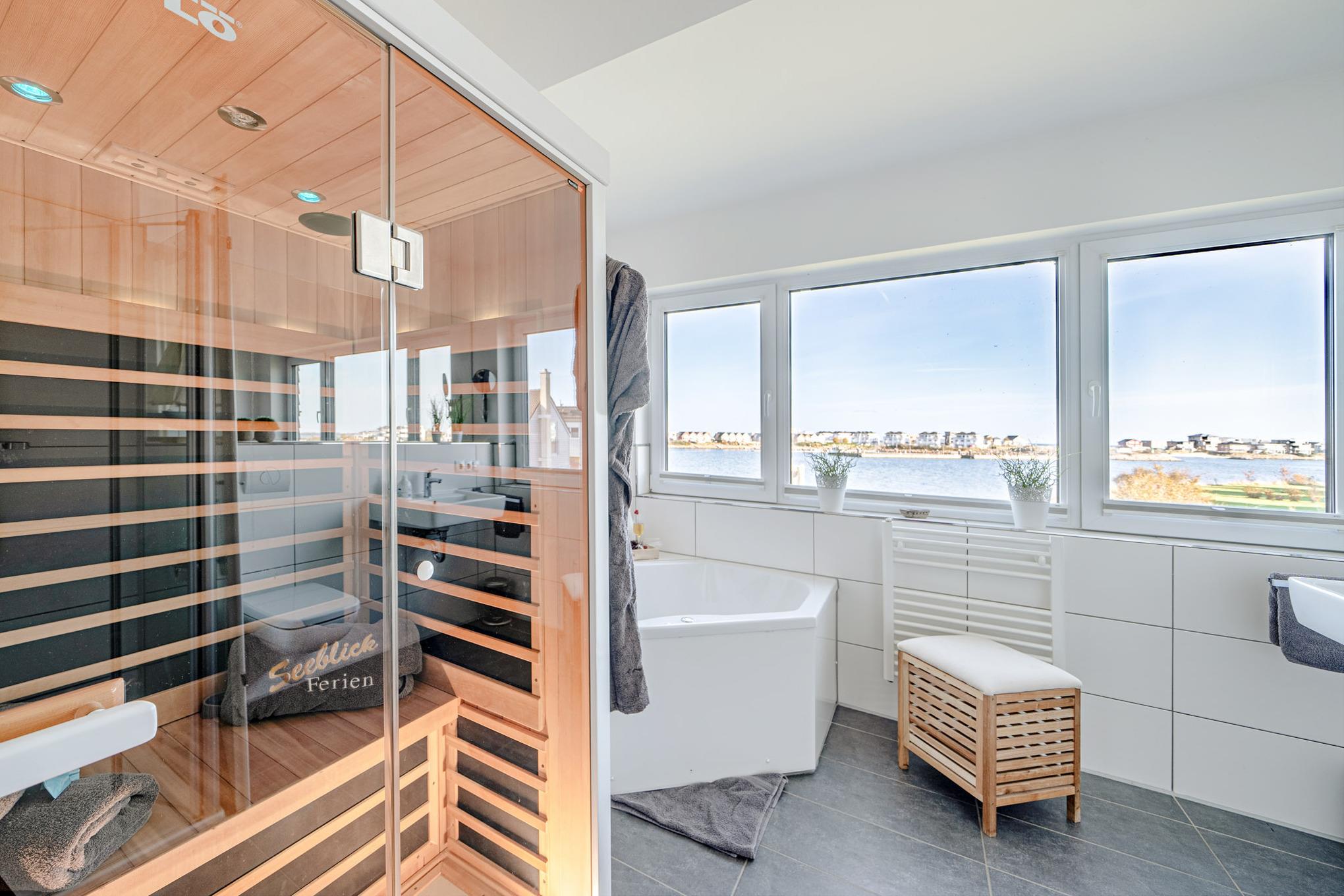 Zwei stilvolle Badezimmer, jeweils eines auf jeder Wohnebene, sorgen für höchsten Komfort. Das Highlight des ersten Obergeschosses ist die Infrarot-Sauna und der Badewanne mit Whirlpoolfunktion mit Wasserblick - hier können Sie entspannen und die Seele baumeln lassen.