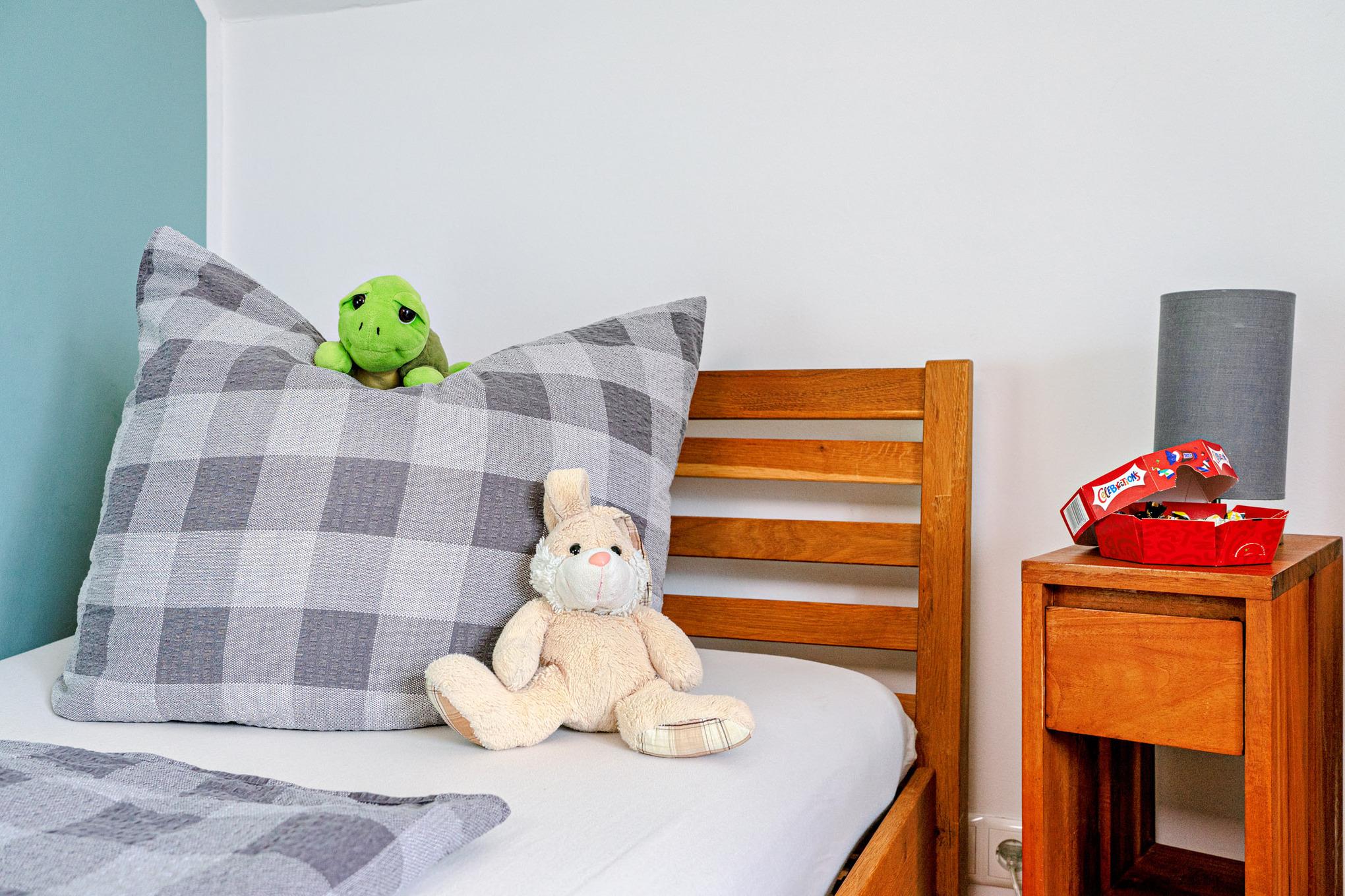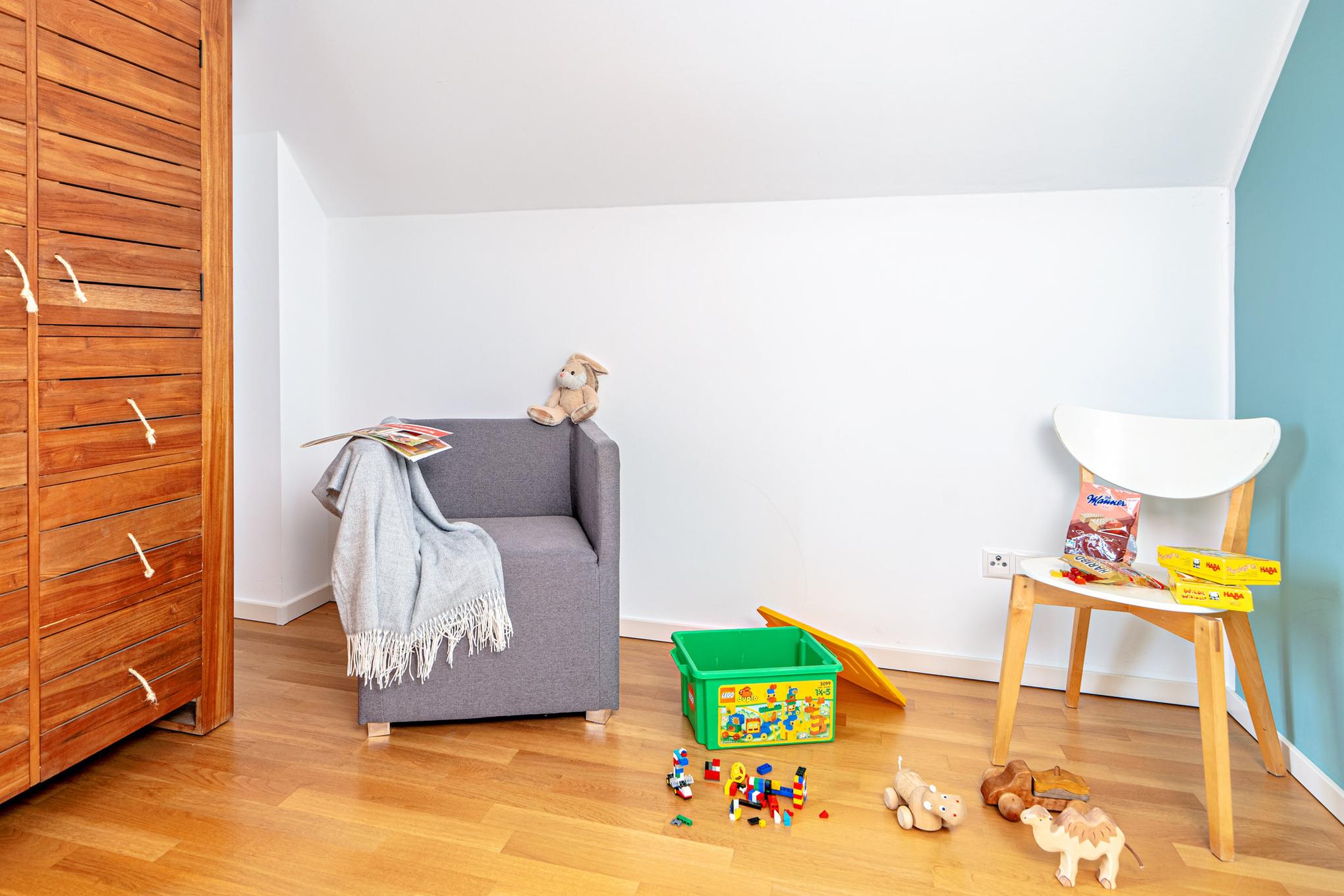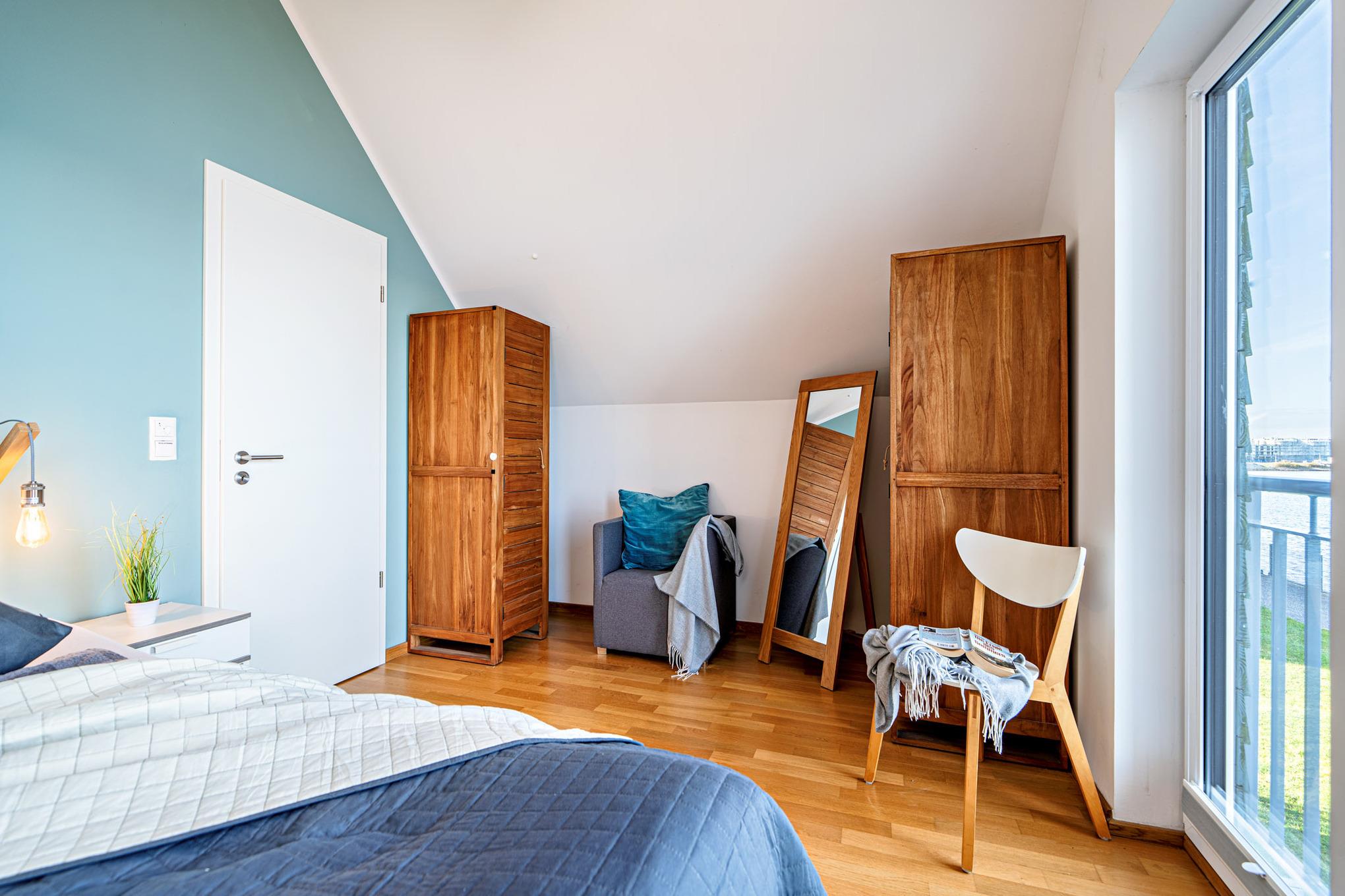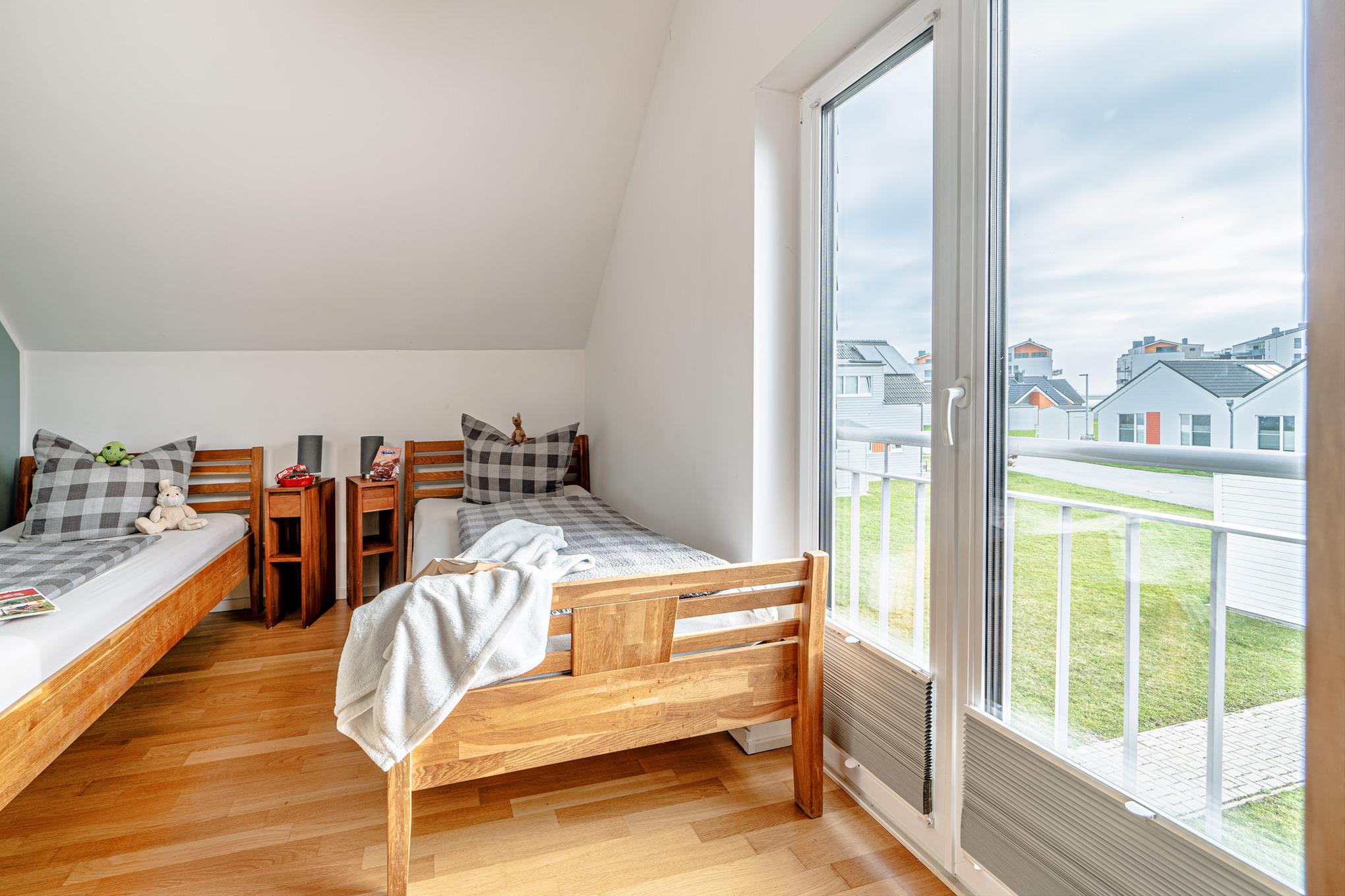 Im ersten Obergeschoss erwartet Sie ein Ruhebereich mit beeindruckendem Meerblick. Das Hauptschlafzimmer ist mit einem komfortablen Boxspringbett ausgestattet, während im zweiten Schlafzimmer zwei Einzelbetten zur Verfügung stehen. Für unsere kleinsten Gäste stellen wir gerne ein Babybett bereit.