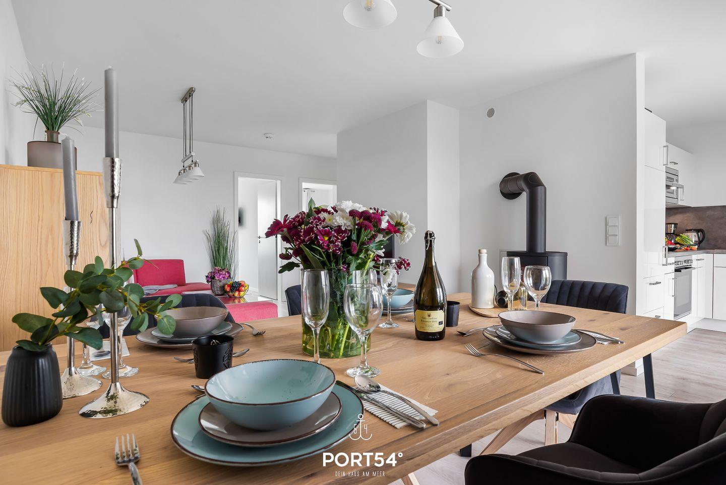 Die Wohnung bietet auf 82 qm neben zwei Schlafzimmern einen Wohn- und Essbereich mit angrenzender, offener Küche und ein Badezimmer. Die lichtdurchflutete Wohnung ermöglicht einen Urlaub mit bis zu fünf Personen. Neben zwei Doppelbetten (180x200cm) steht eine gemütliche Schlafcouch im Wohnbereich bereit. Hier lassen sich ebenso gesellige Abende vor dem Kamin verbringen. Die vollausgestattete, moderne Küche bietet sich alternativ für Kochabende an. Das moderne Badezimmer verfügt über eine Infrarot-Sauna und eine Whirlwanne, in welcher du es dir zu jeder Jahreszeit gemütlich machen kannst. Die möblierte Terrasse ist perfekt für einen entspannten Grillabend im Sommer. Lehne dich zurück & lassen Sie Ihren Alltag hinter sich! Sie parken kostenfrei vor der Ferienwohnung und es gibt einen abschließbaren Fahrradschuppen.