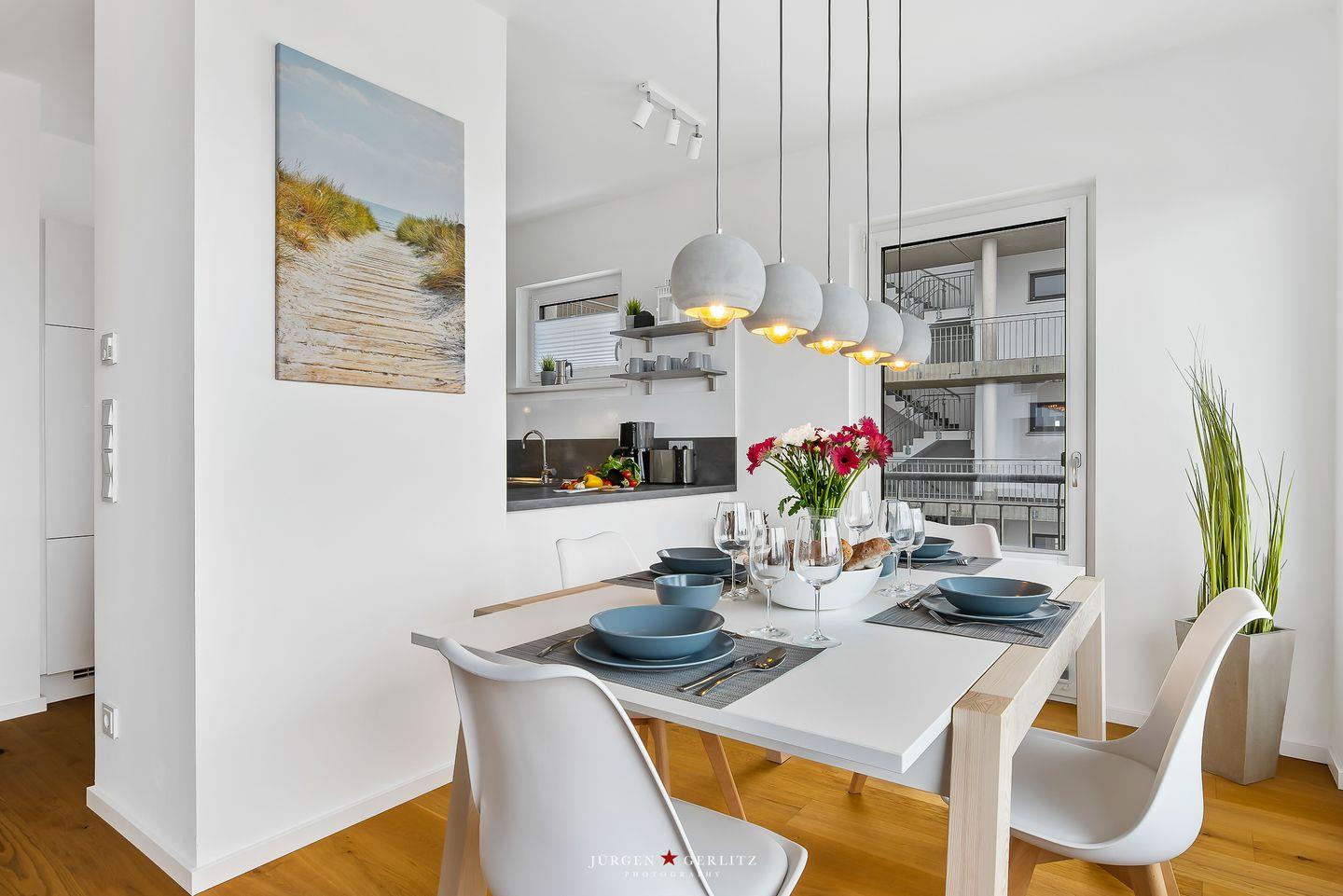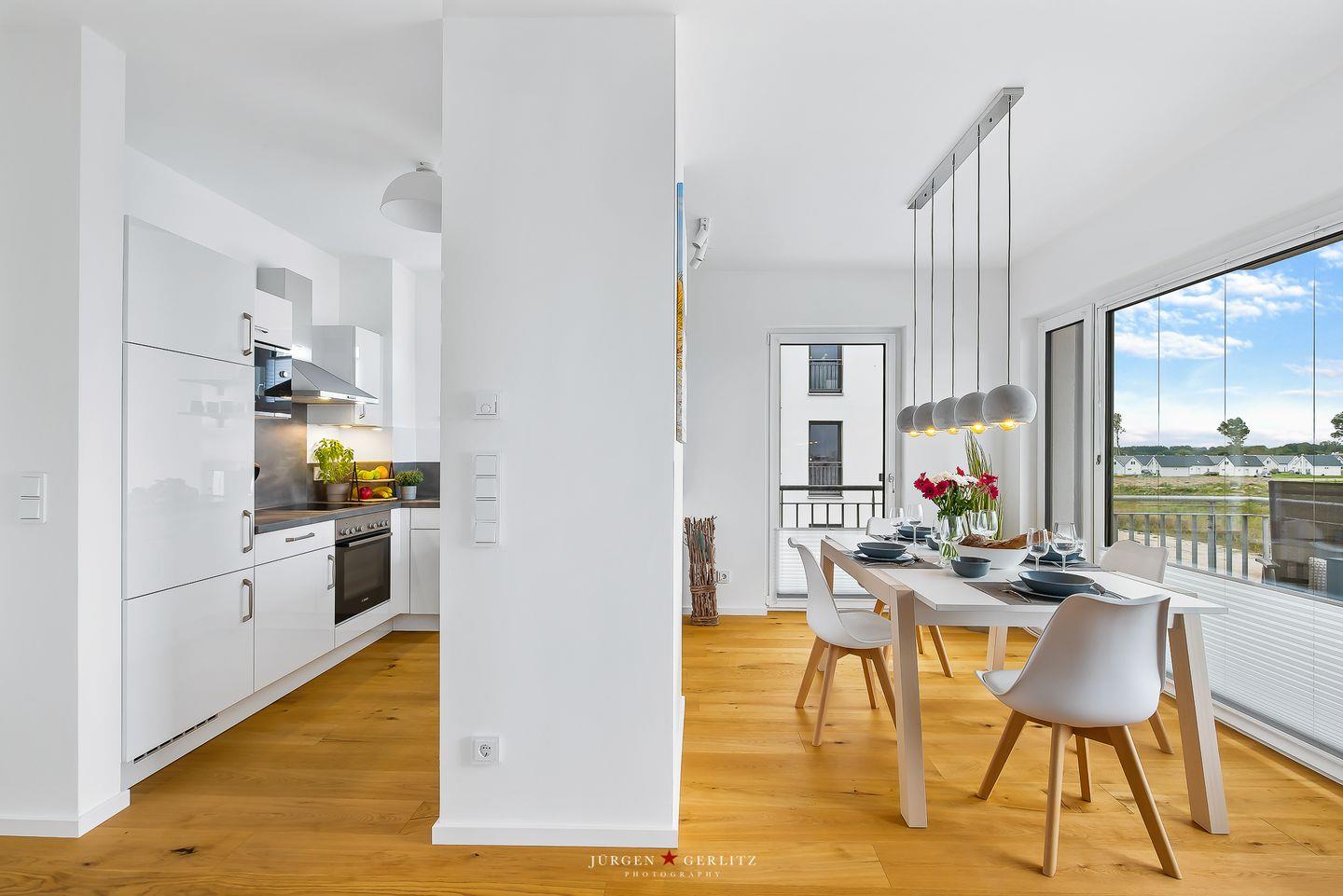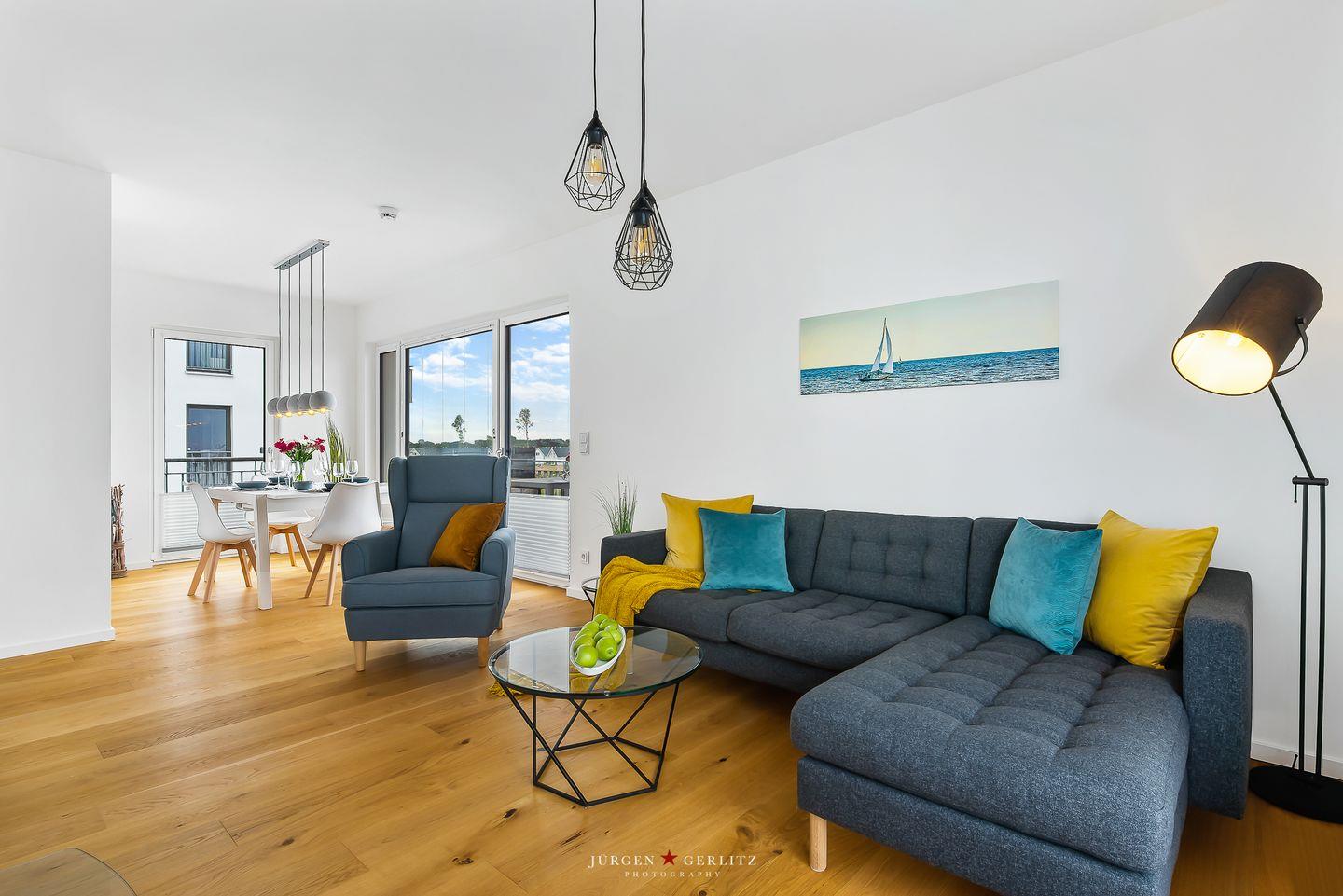 Das Apartment „Ocean's 16“ bietet Dir auf ca. 78 m² Urlaubsfeeling pur. Die Wohnung befindet sich im 2. OG und ist barrierefrei. Der offene Wohn-/Essbereich ist modern eingerichtet.