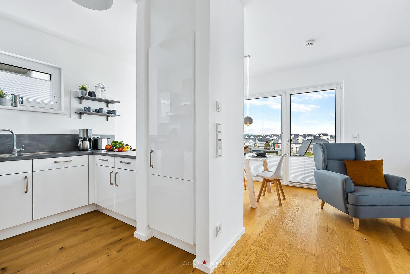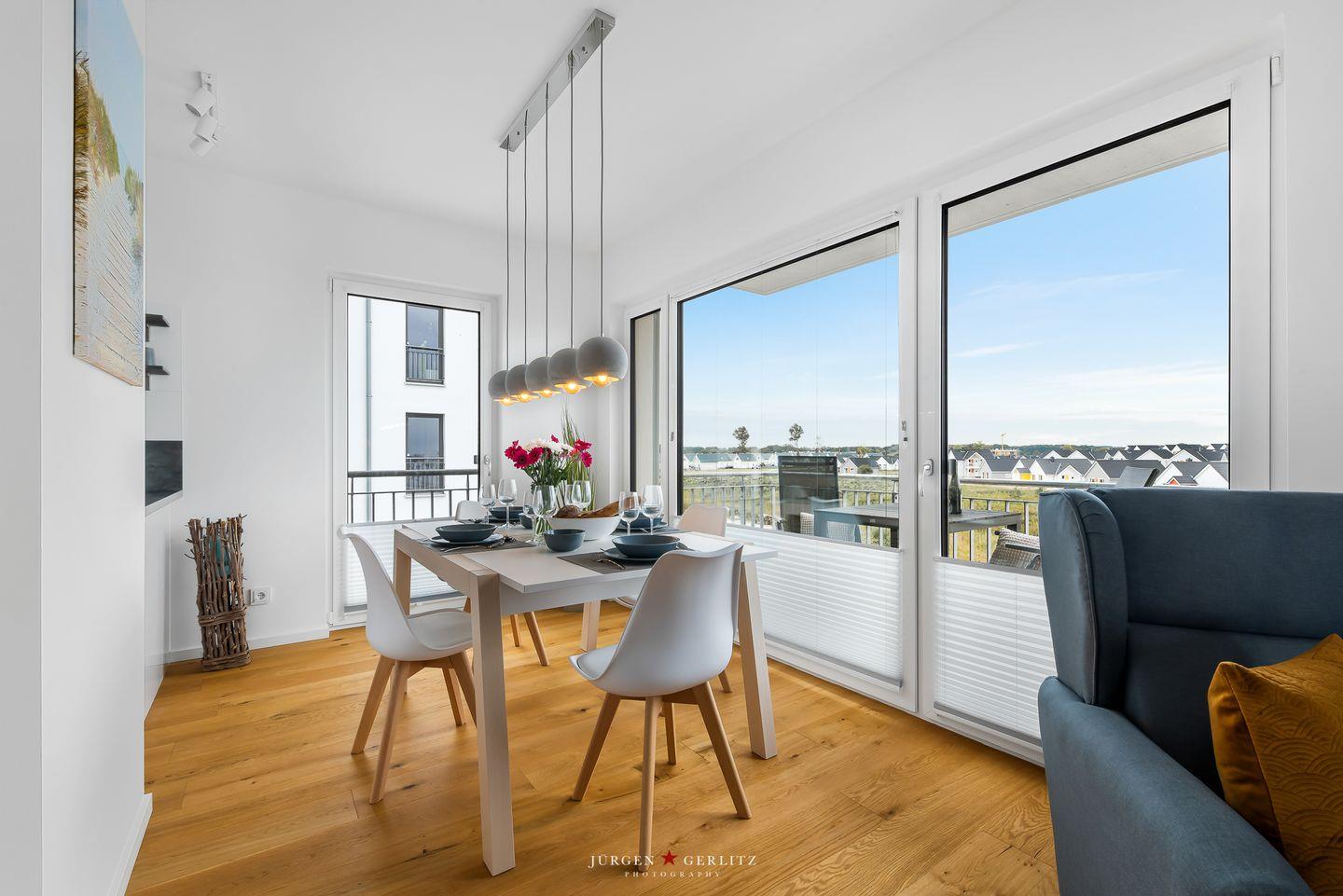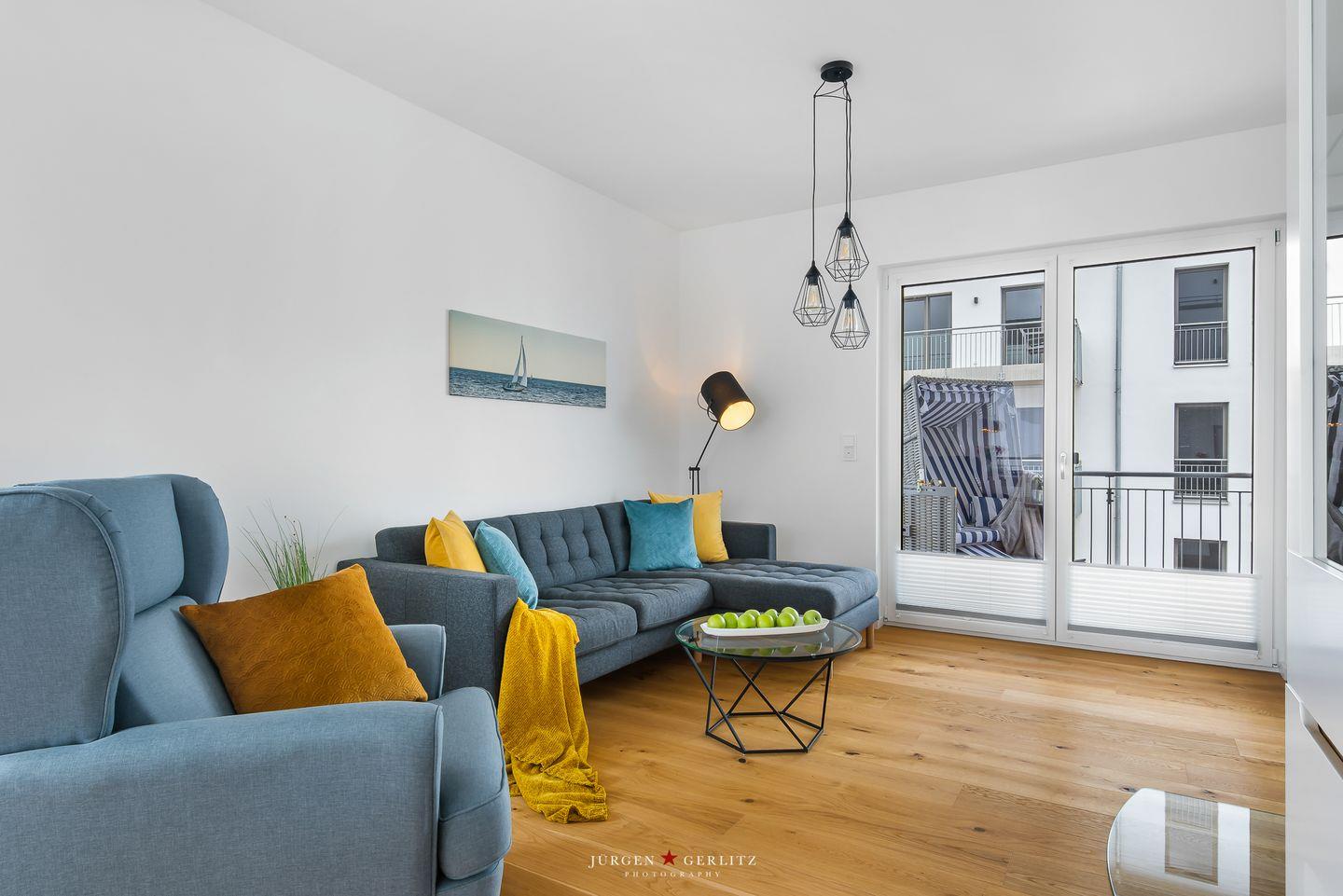 Das Apartment „Ocean's 16“ bietet Dir auf ca. 78 m² Urlaubsfeeling pur. Die Wohnung befindet sich im 2. OG und ist barrierefrei. Der offene Wohn-/Essbereich ist modern eingerichtet.