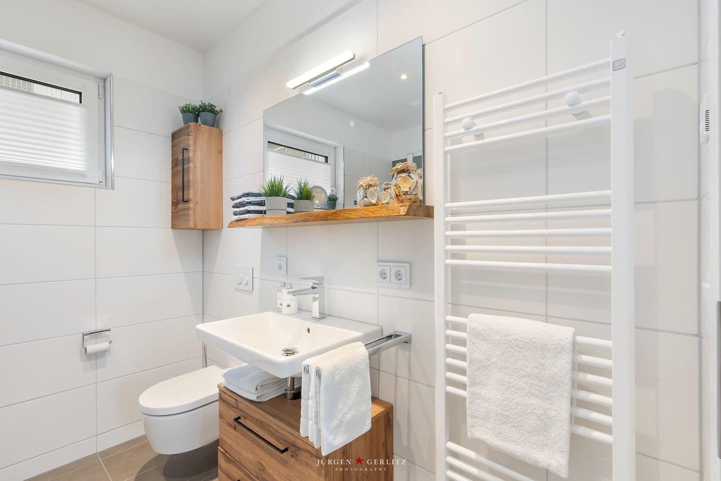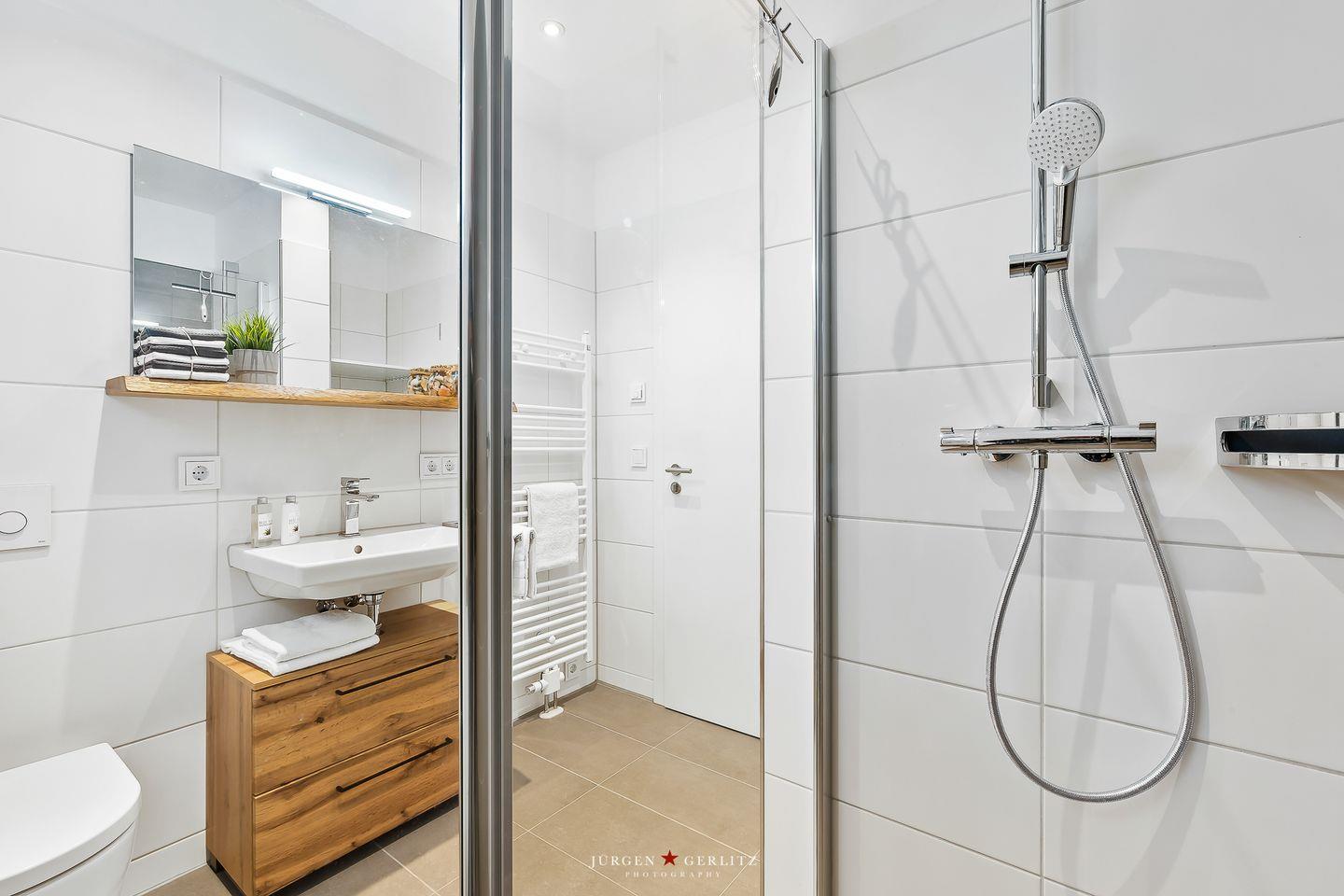 Das moderne Badezimmer beeindruckt mit einer großzügigen, ebenerdigen Dusche, die Dich erfrischend in den Morgen starten lässt. Eine Waschmaschine steht ebenfalls zur Verfügung, sodass auch längeren Aufenthalten nichts im Wege steht. Und das Beste: Auch Dein Vierbeiner ist hier herzlich willkommen!
