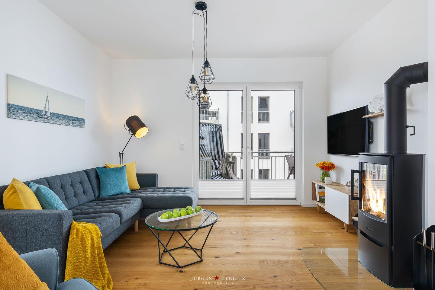Tauche ein in das einzigartige Urlaubsfeeling der Ferienwohnung „Ocean's 16“, die Dir auf großzügigen 78 m² pure Erholung verspricht. Das gesamte Apartment ist barrierearm gestaltet und mit hochwertigem Echtholz-Parkett ausgestattet, das eine warme und gemütliche Atmosphäre schafft. Der offene Wohn-/Essbereich ist nicht nur modern, sondern dank bodentiefer Fenster auch lichtdurchflutet und bietet Zugang zu gleich zwei Balkonen. Hier kannst Du entspannte Momente genießen und die frische Meeresbrise auf Dich wirken lassen. Ein weiteres Highlight in diesem Bereich ist der einladende Kamin, der für gemütliche Abende sorgt, perfekt zum Zurücklehnen und Entspannen.