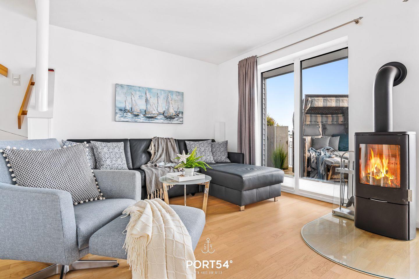 Das lichtdurchflutete Wohn- und Esszimmer ist mit dem Kamin der perfekte Ort für gemütliche und entspannte Stunden. Von hier aus hast Du Zugang zur großen Terrasse mit Strandkorb. Ein gemütliches Schlafsofa steht Dir für zwei Personen zur Verfügung.