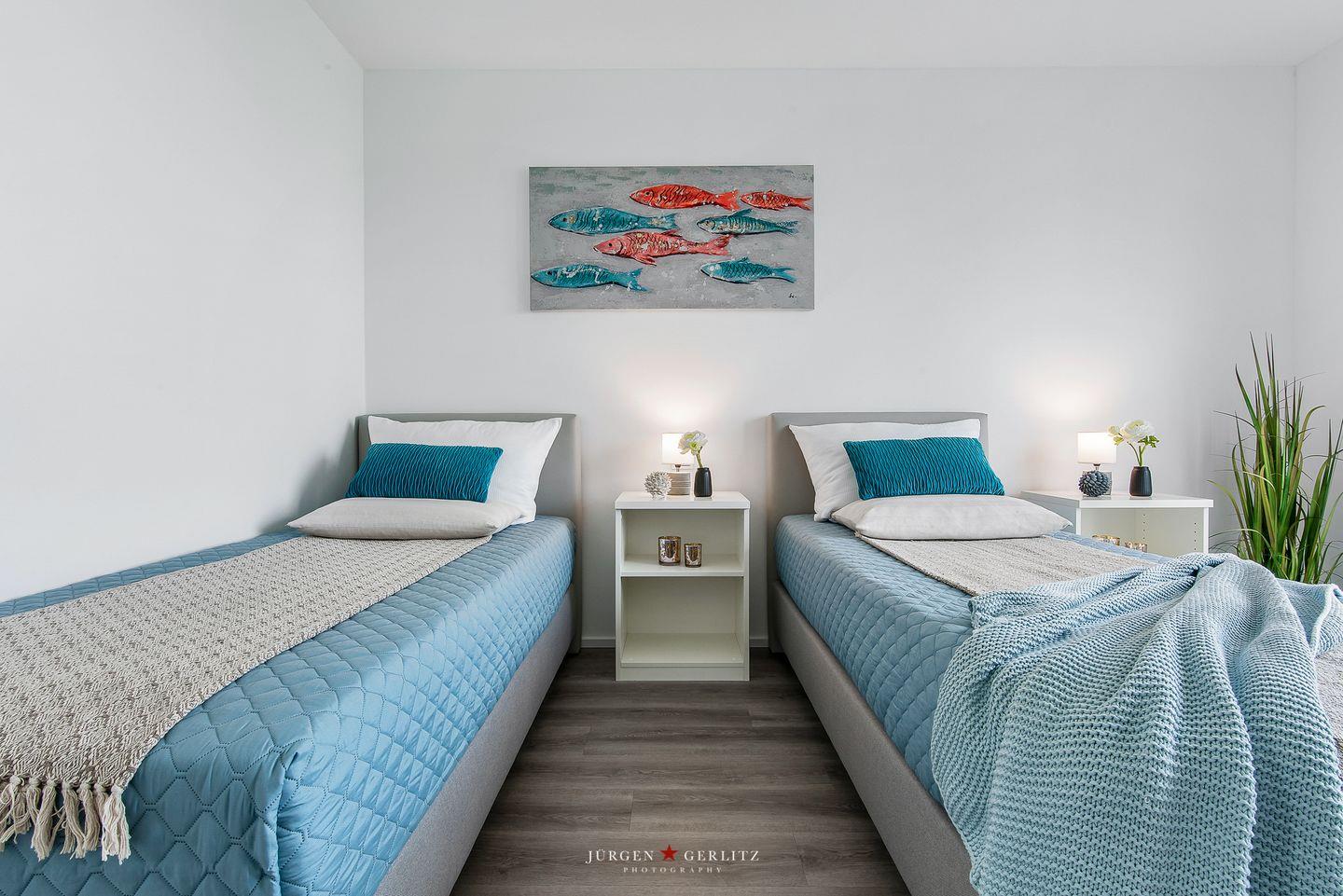 Die Ferienwohnung verfügt über zwei Schlafzimmer, die Dir erholsame Nächte ermöglichen. Das eine Schlafzimmer ist mit einem großzügigen Doppelbett und einem weiteren Flatscreen-TV ausgestattet, während das andere Schlafzimmer zwei komfortable Einzelbetten bietet, die bei Bedarf zu einem Doppelbett zusammengeschoben werden können.