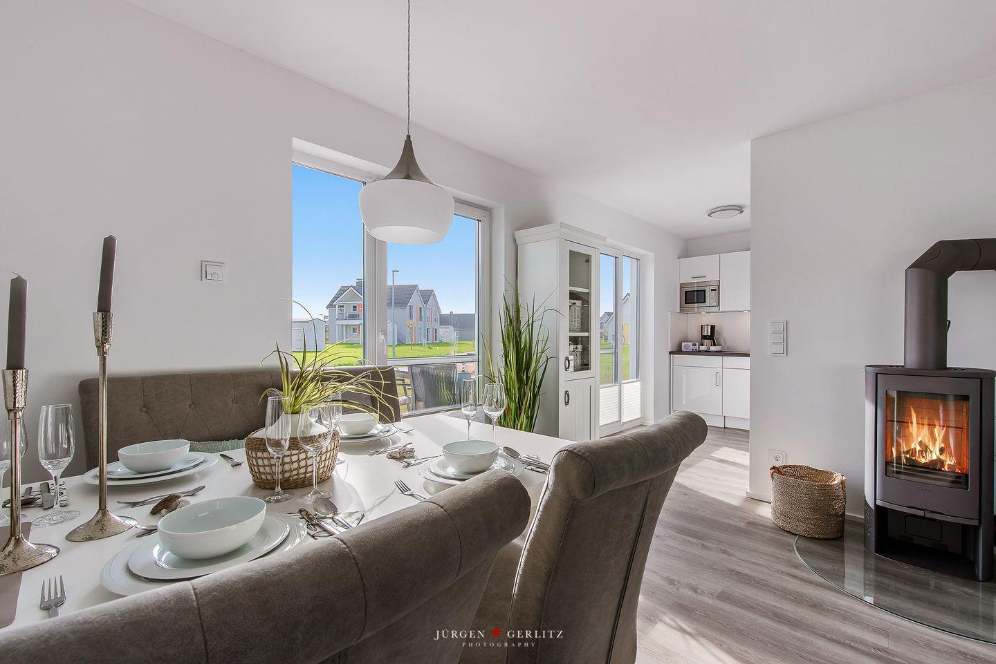 Der Wohnbereich ist das Herzstück des Hauses und lädt Dich mit einem einladenden Kaminofen und einem großzügigen Flatscreen-TV dazu ein, es Dir so richtig gemütlich zu machen. Hier kannst Du entspannte Stunden verbringen und die Seele baumeln lassen.