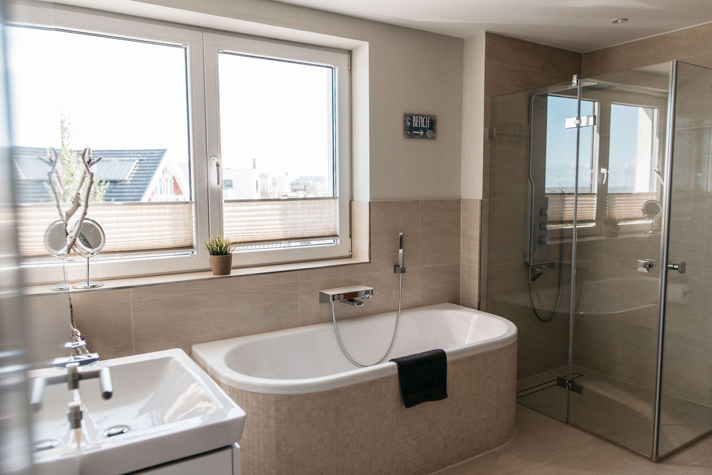 Das helle Badezimmer bietet eine Duo-Badewanne, ebenerdige Erlebnisdusche mit einem Regenduschkopf und eine finnische Sauna für Wellness-Begeisterte. Mit der Fußbodenheizung ist auch in kalten Jahreszeiten für wohlige Wärme gesorgt.