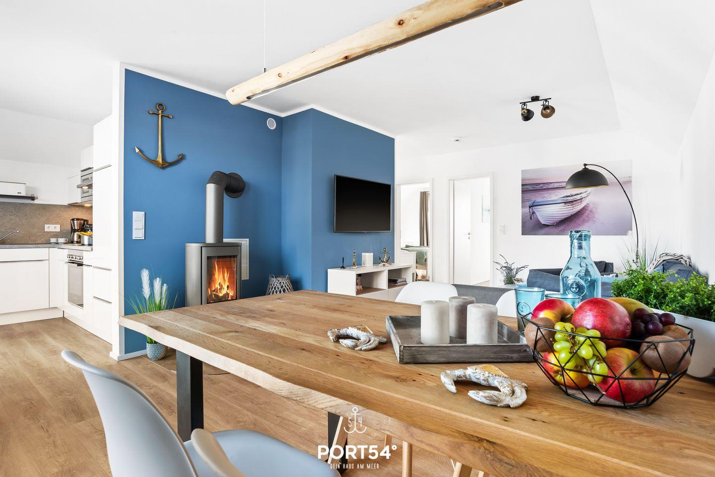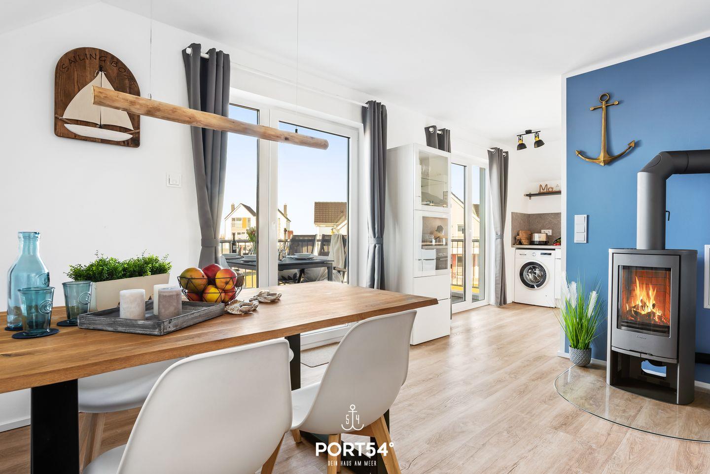 Modernes Apartment in Olpenitz mit Balkon, Kamin, Sauna und Meerblick, ideal für Familien und Erholung.