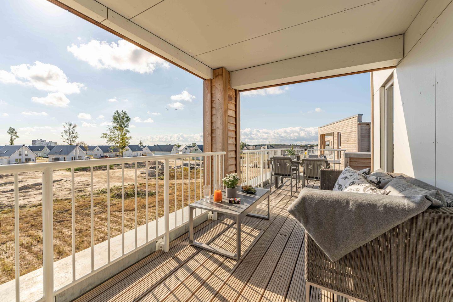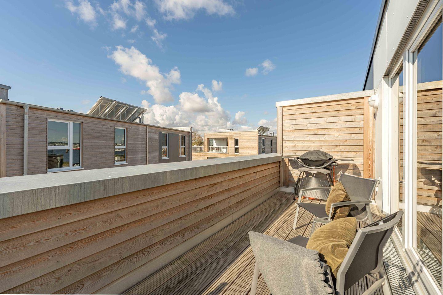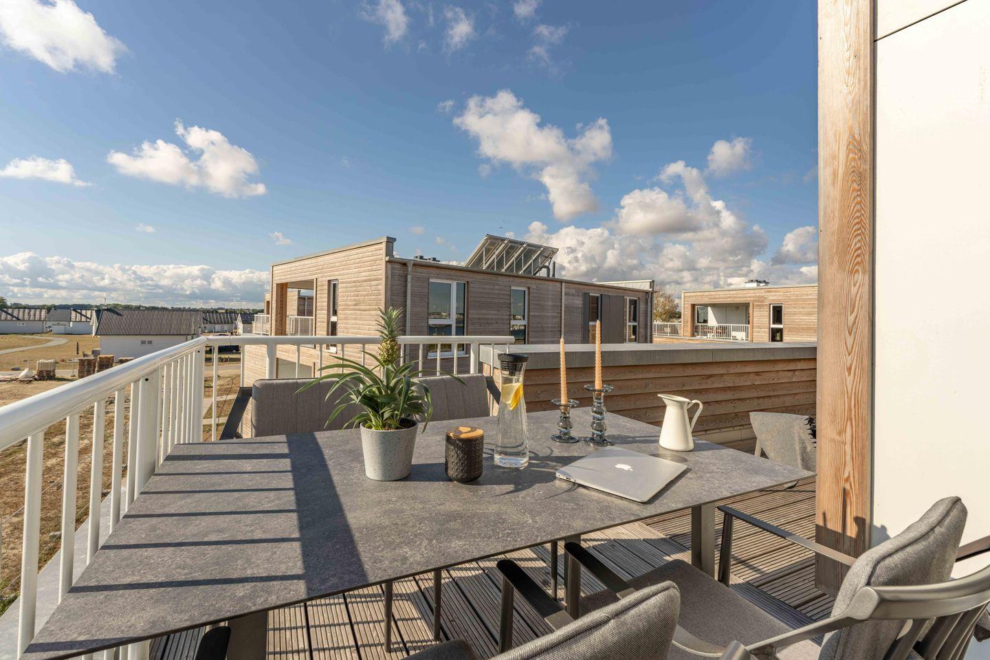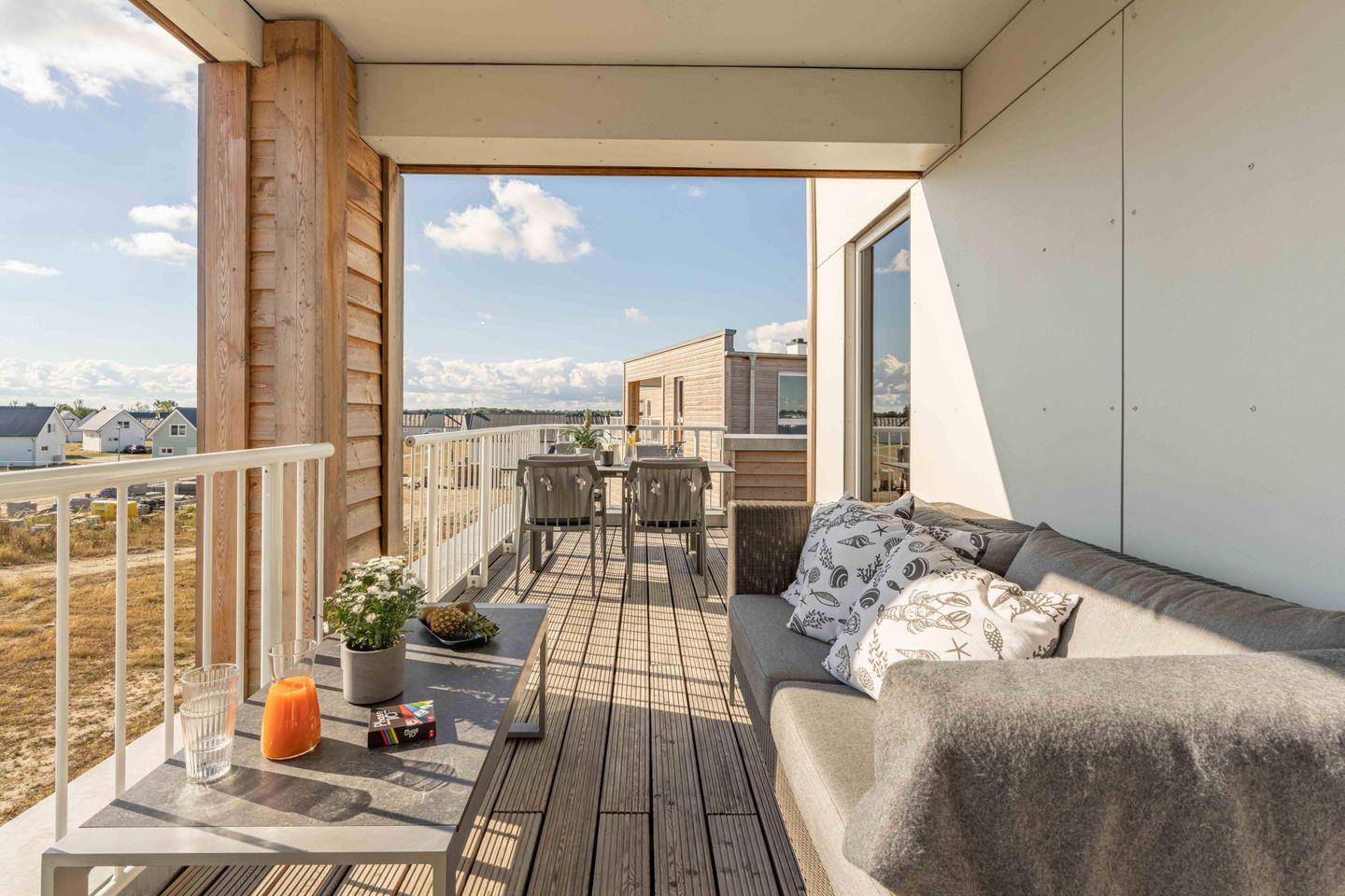 Auf den beiden Balkonen (einer davon teilüberdacht) kannst Du den tollen Ausblick, die frische Ostseeluft und Sonnenuntergänge genießen.