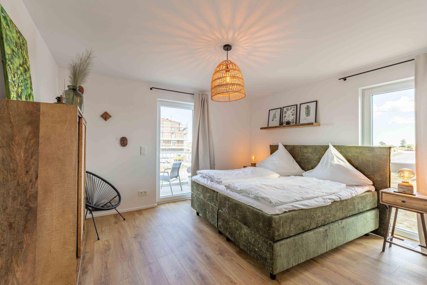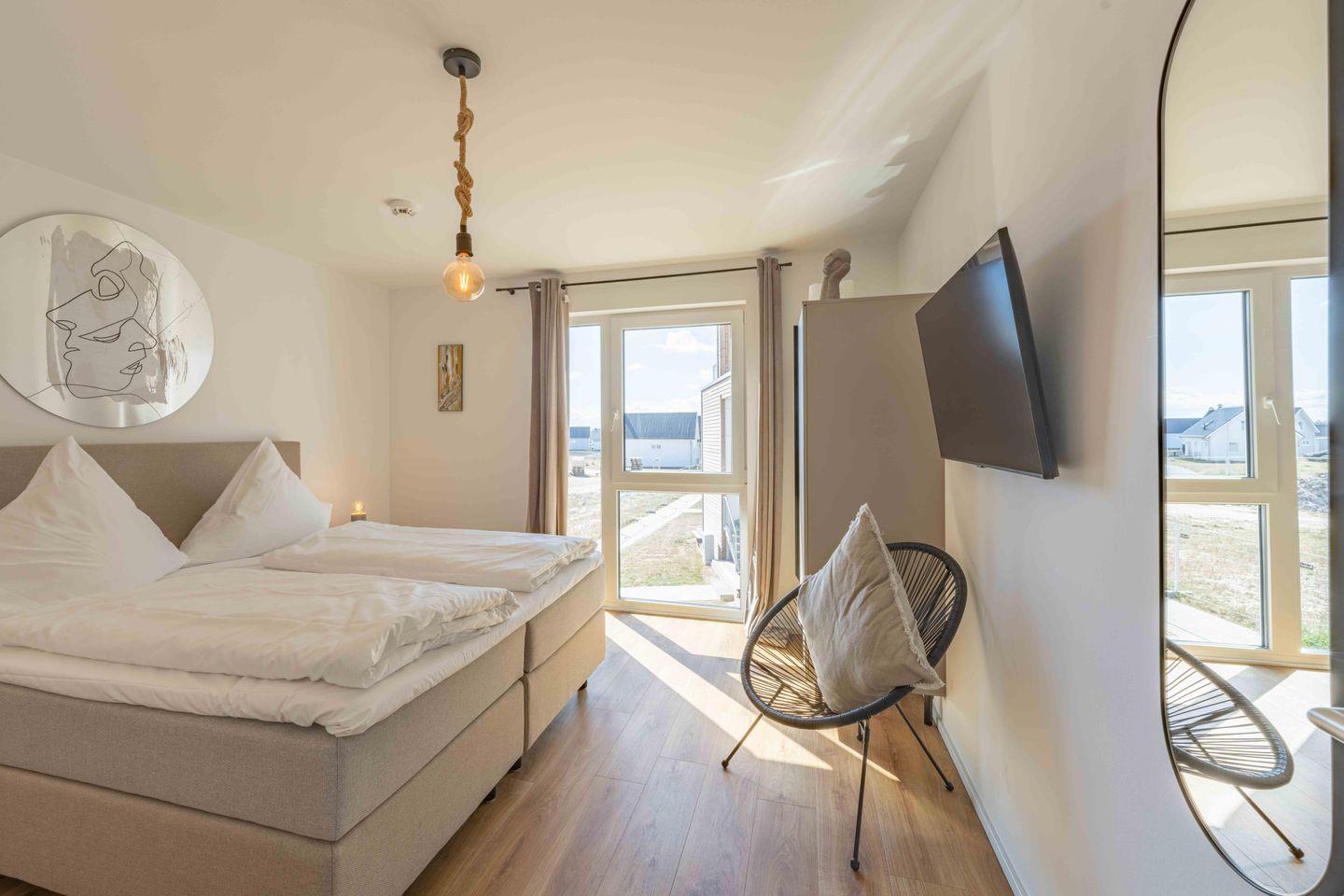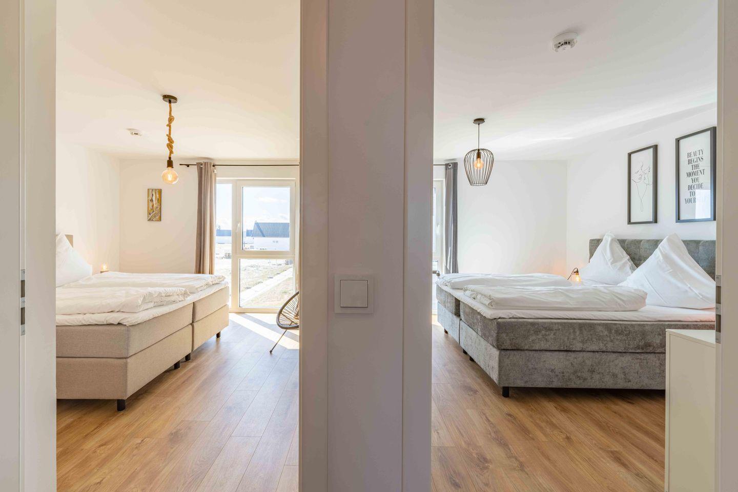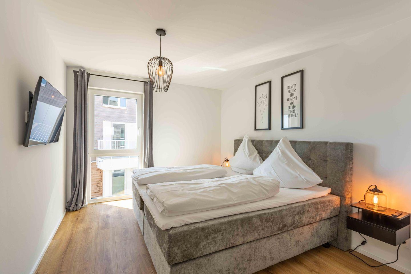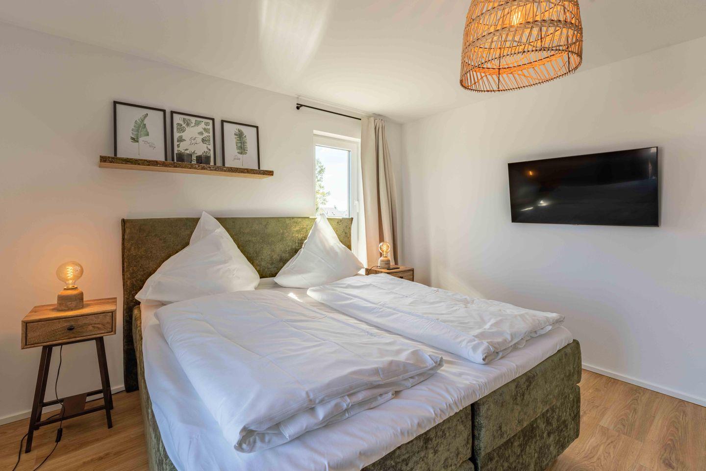 Das Apartment verfügt über 3 Schlafzimmer mit Boxspringbetten (180 × 200 cm). Außerdem gibt es Smart-TVs in allen Schlafzimmern sowie im Wohnzimmer.
