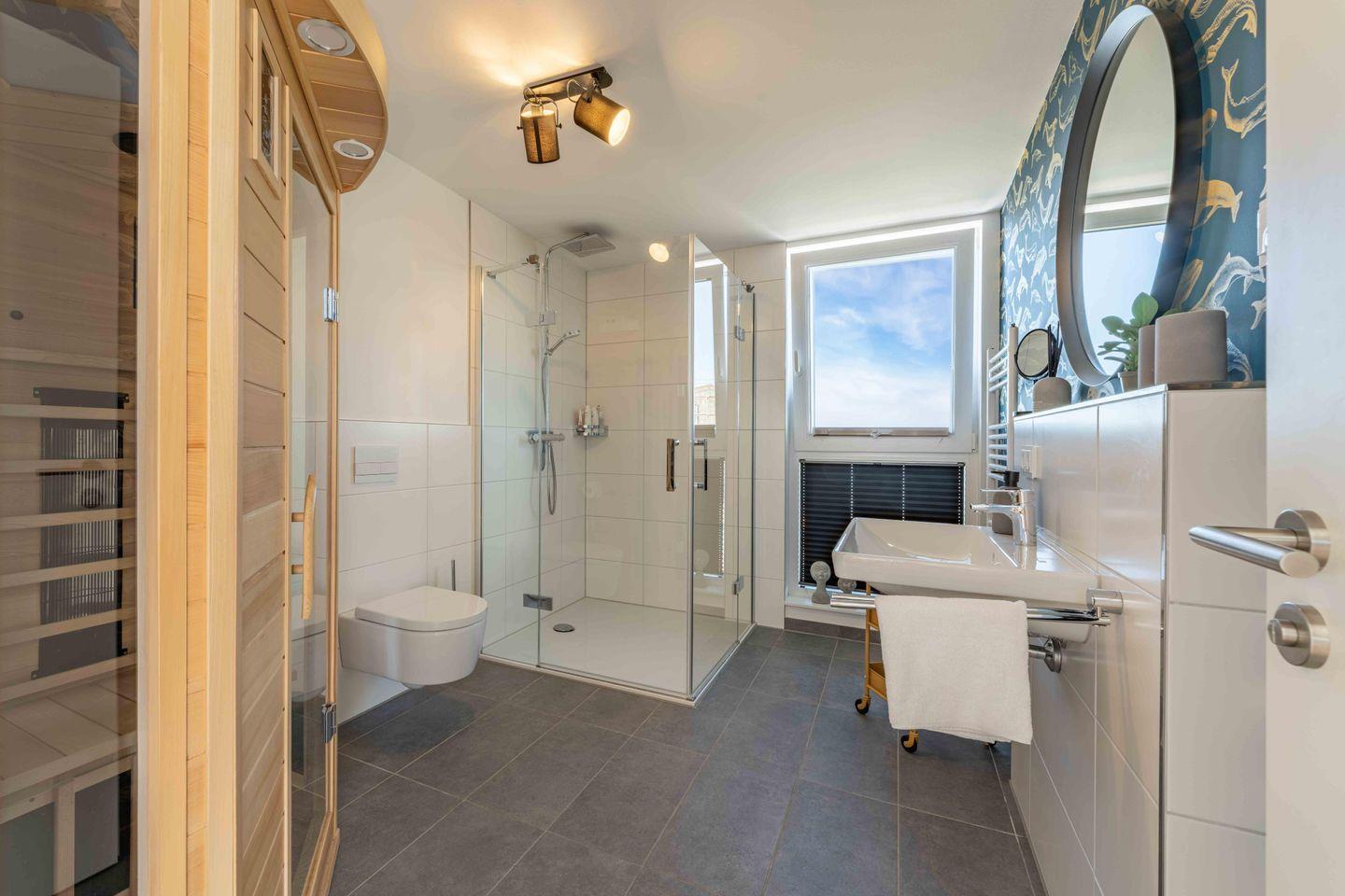 Die Ferienwohnung verfügt über zwei moderne und helle Badezimmer. Das eine Badezimmer bietet Dir eine Infrarot-Sauna, hier kannst Du dem Alltagsstress entfliehen und Dich entspannen, zudem gibt es eine ebenerdige Dusche. Das andere Badezimmer verfügt über eine Badewanne sowie über eine Waschmaschine.