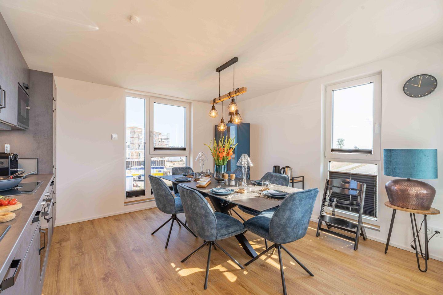 Die offen und modern gehaltene Küche ist hochwertig und voll ausgestattet und verfügt ebenso über einen tollen Ausblick direkt auf den Hafen.