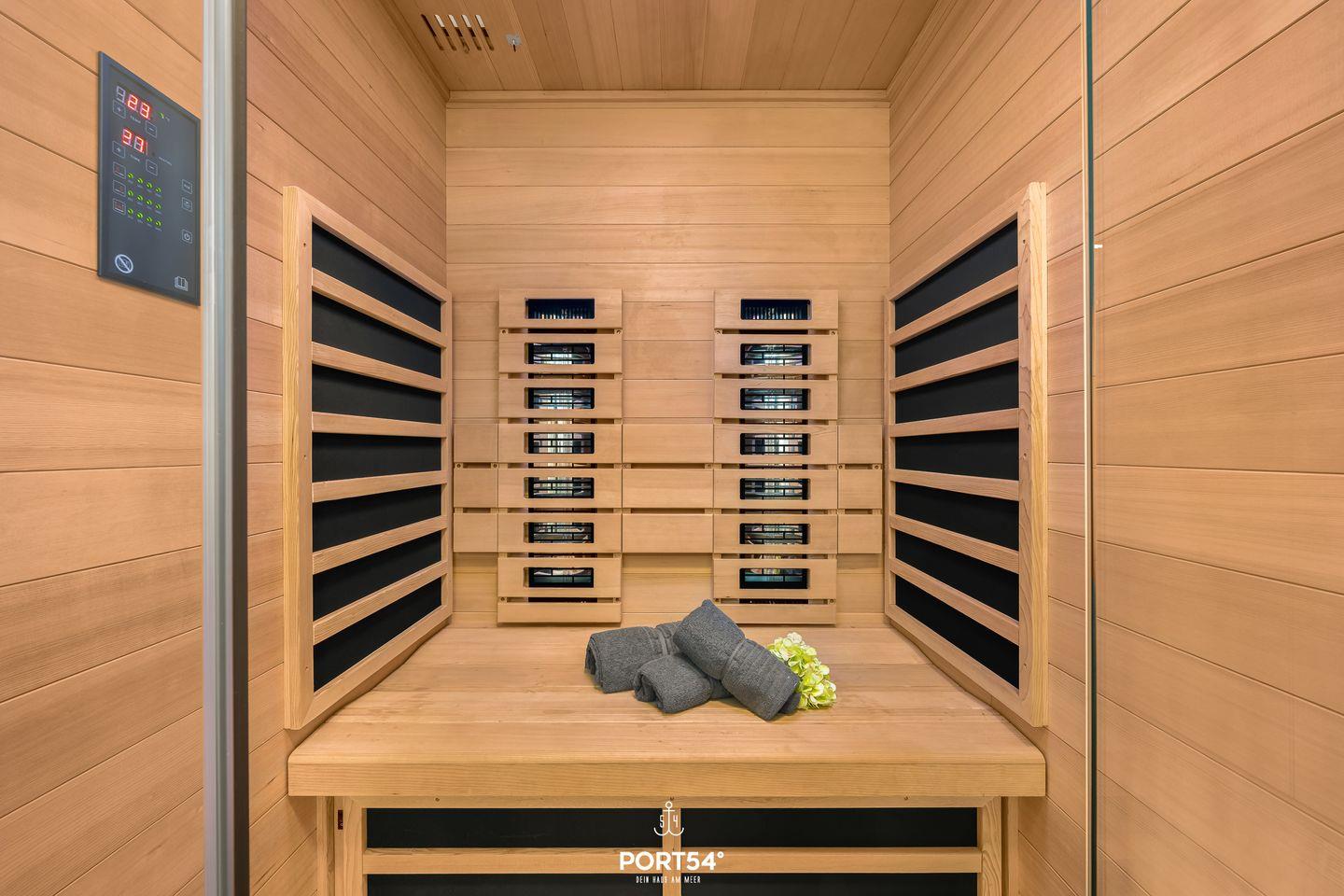 Neben zwei Schlafzimmern verfügt die Wohnung über ein Wellnessbad für Genießer. Entspanne Dich nach einer langen Fahrradtour in der Infrarot-Sauna.