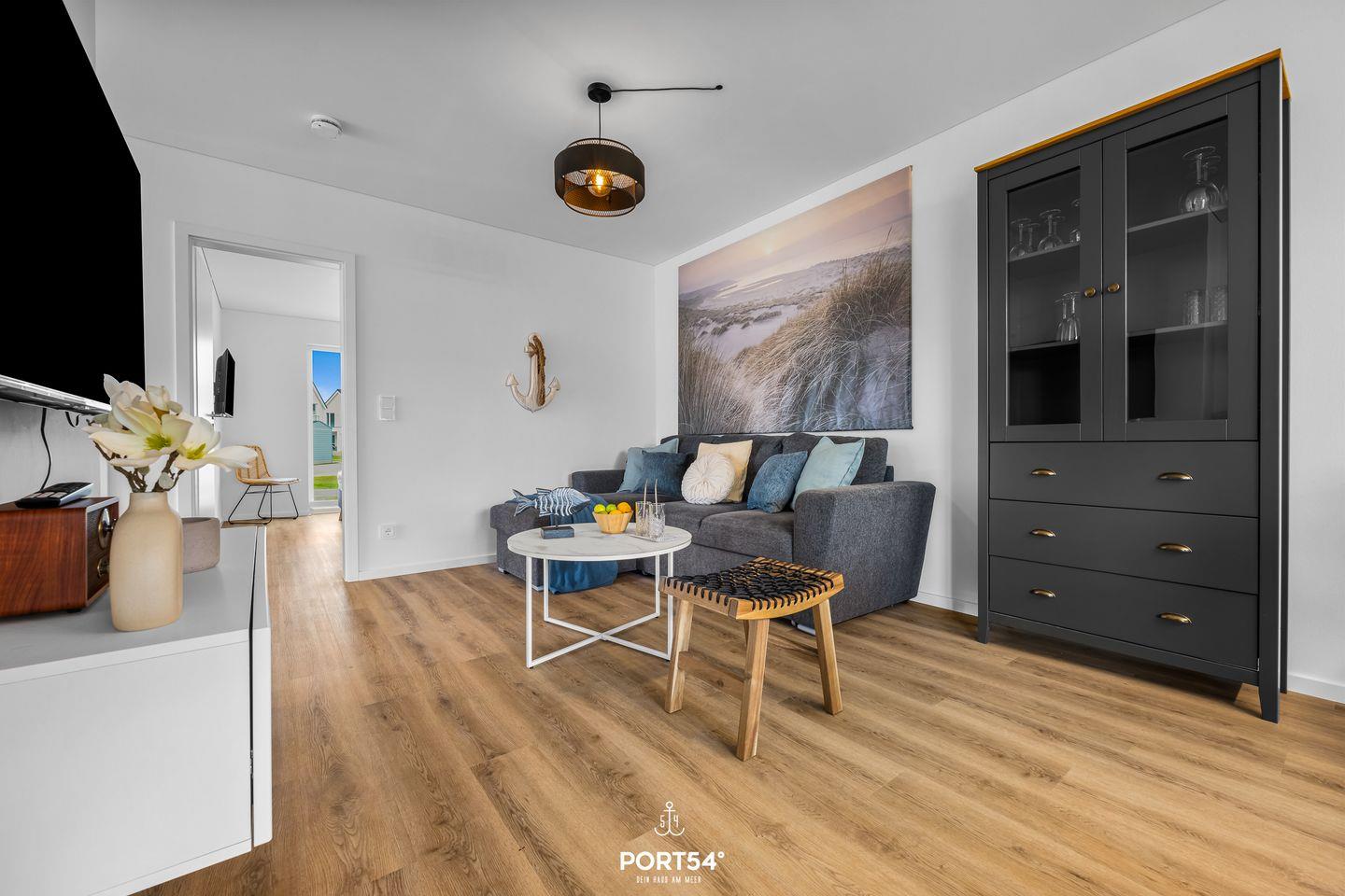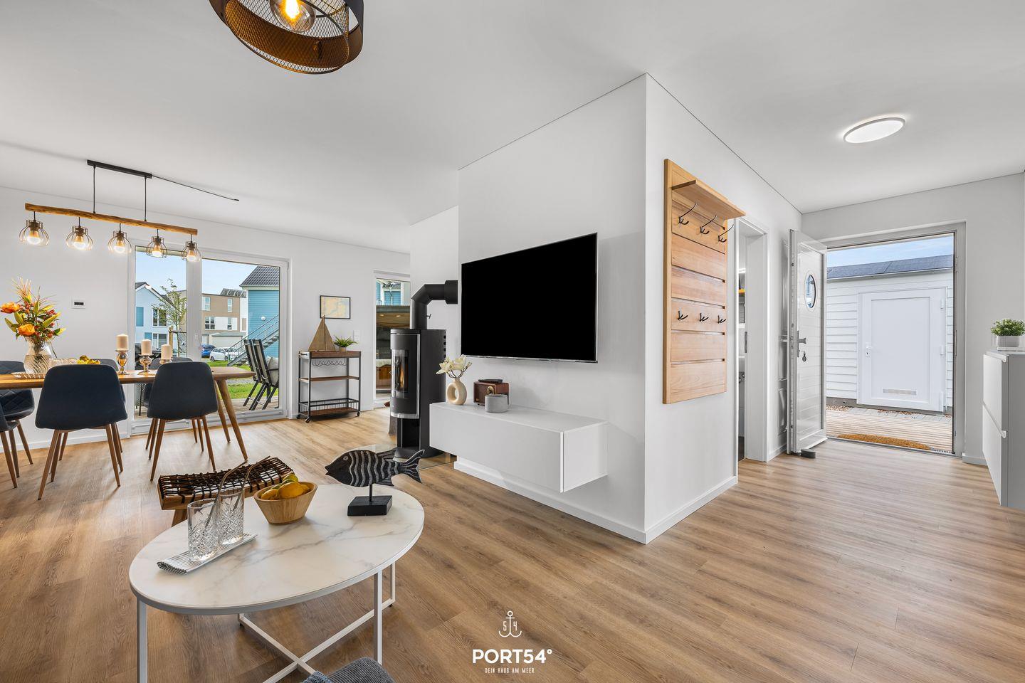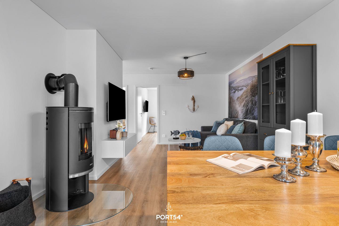 Die Ferienwohnung "Wellenkrone" im OstseeResort Openitz. Das Wohnzimmer mit Kamin und angrenzender Terrasse lädt Dich zum Entspannen ein. Die Küche ist voll ausgestattet.