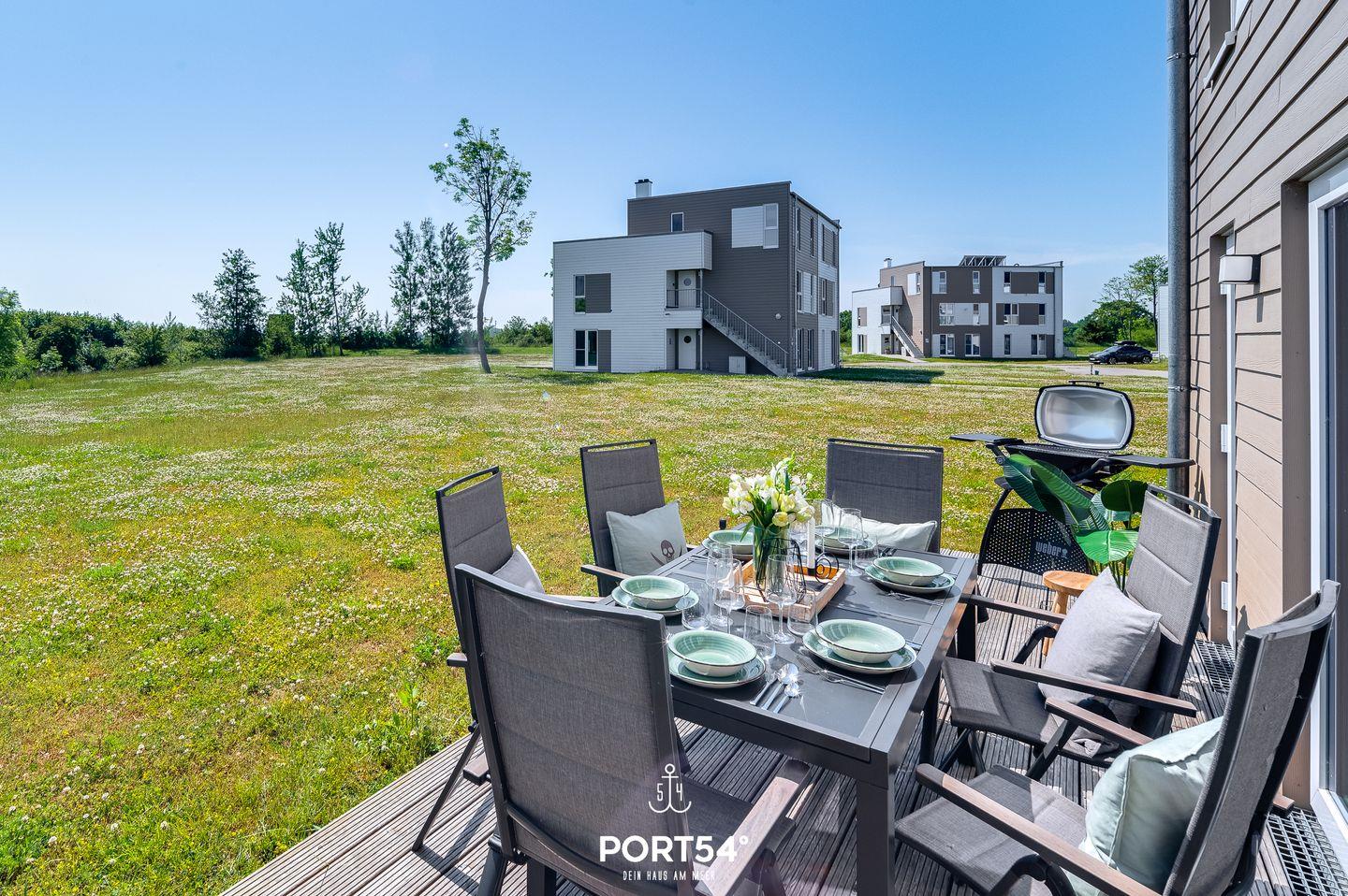 Gemütliche Gartenmöbel, ein Sonnenschirm und ein Elektro-Grill runden laue Sommerabende ab.