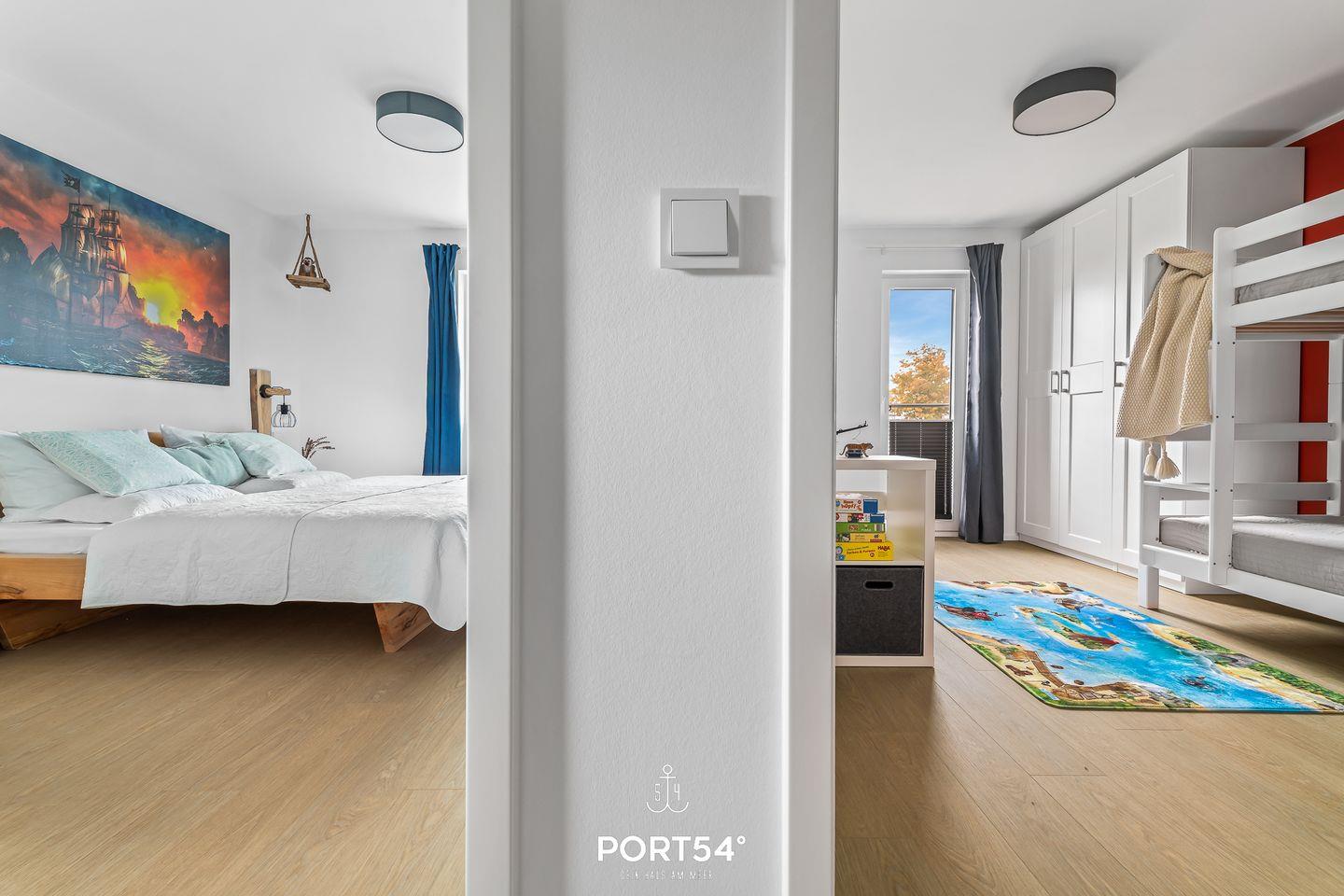 In einem der beiden Schlafzimmer findest Du ein Doppelbett (180 × 200 cm) und im anderen drei Einzelbetten (je 90 × 200 cm) vor.