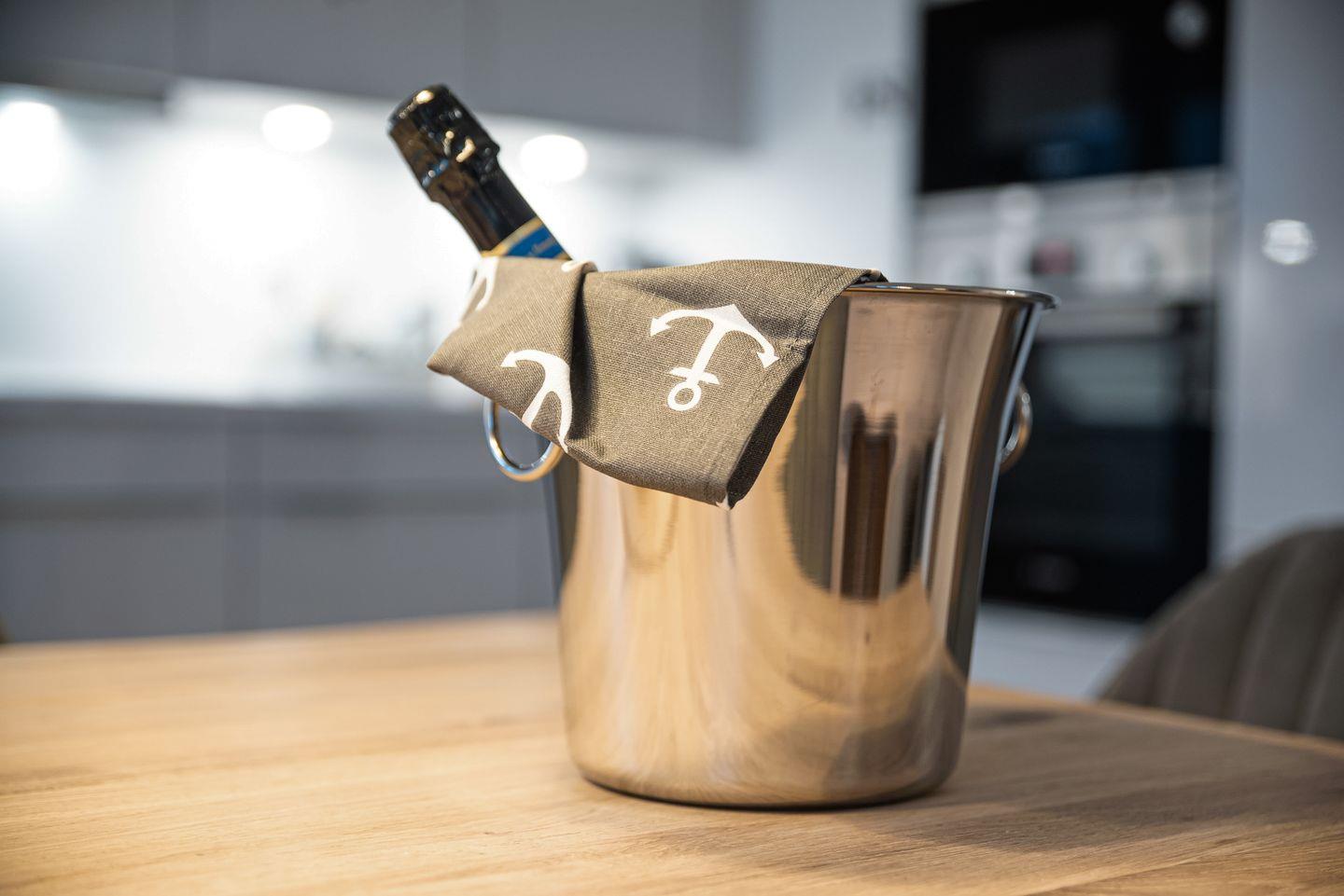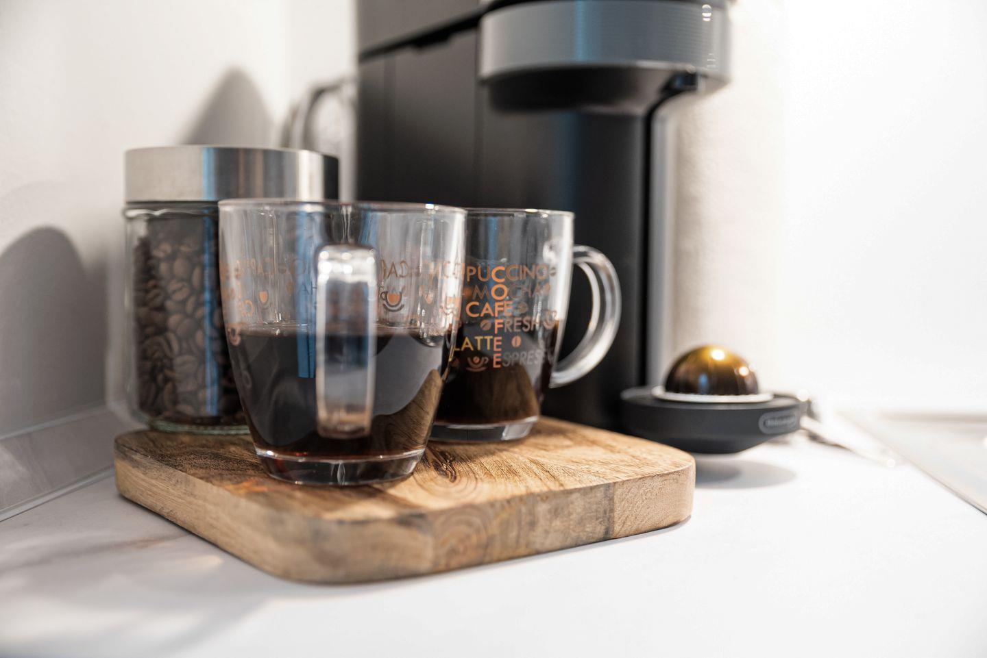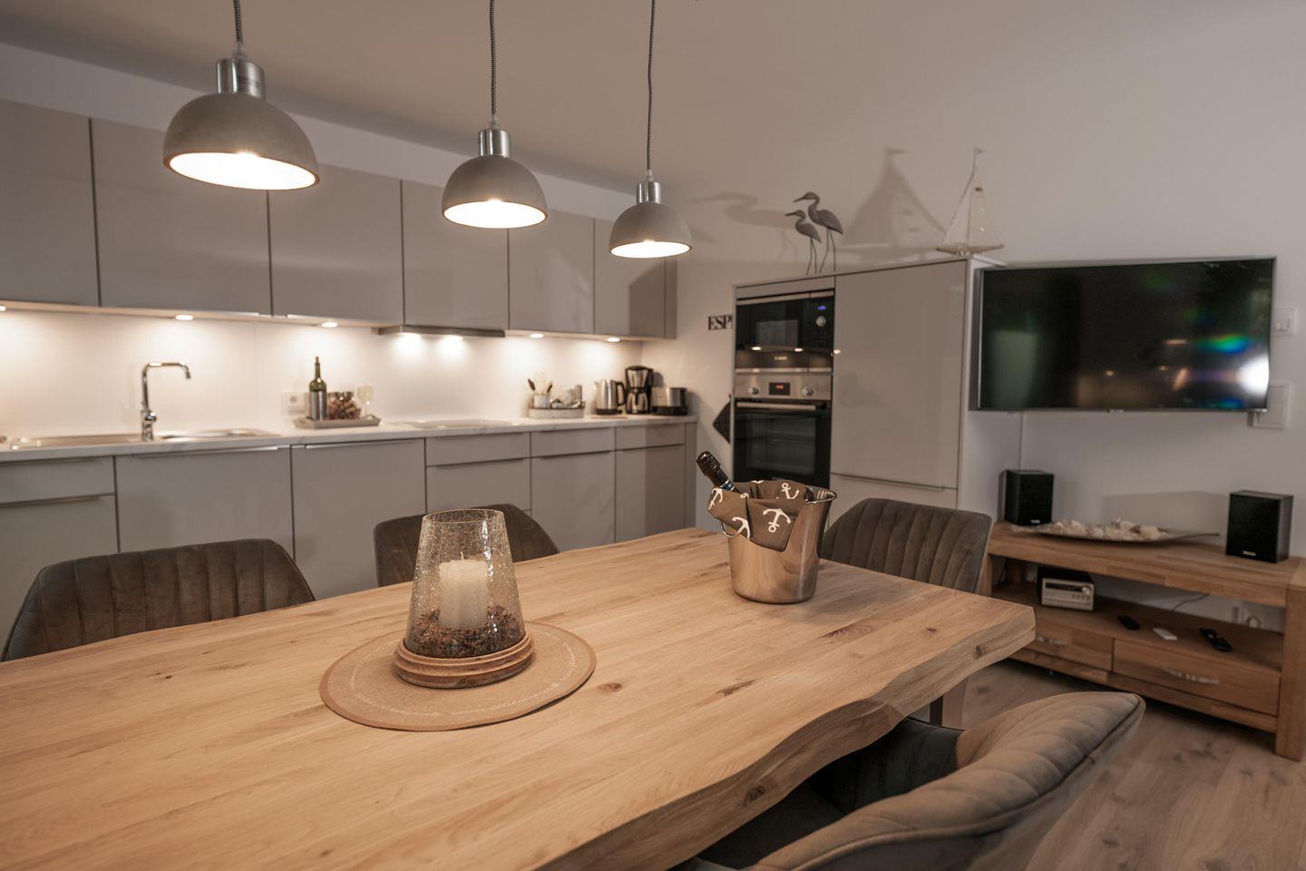 Die Küche bietet unter anderem einen Kühlschrank mit Gefrierfach, einen Ceranfeld-Herd, einen Backofen, eine Mikrowelle sowie eine Geschirrspülmaschine, eine Nespresso-Maschine und einen Wasserkocher.