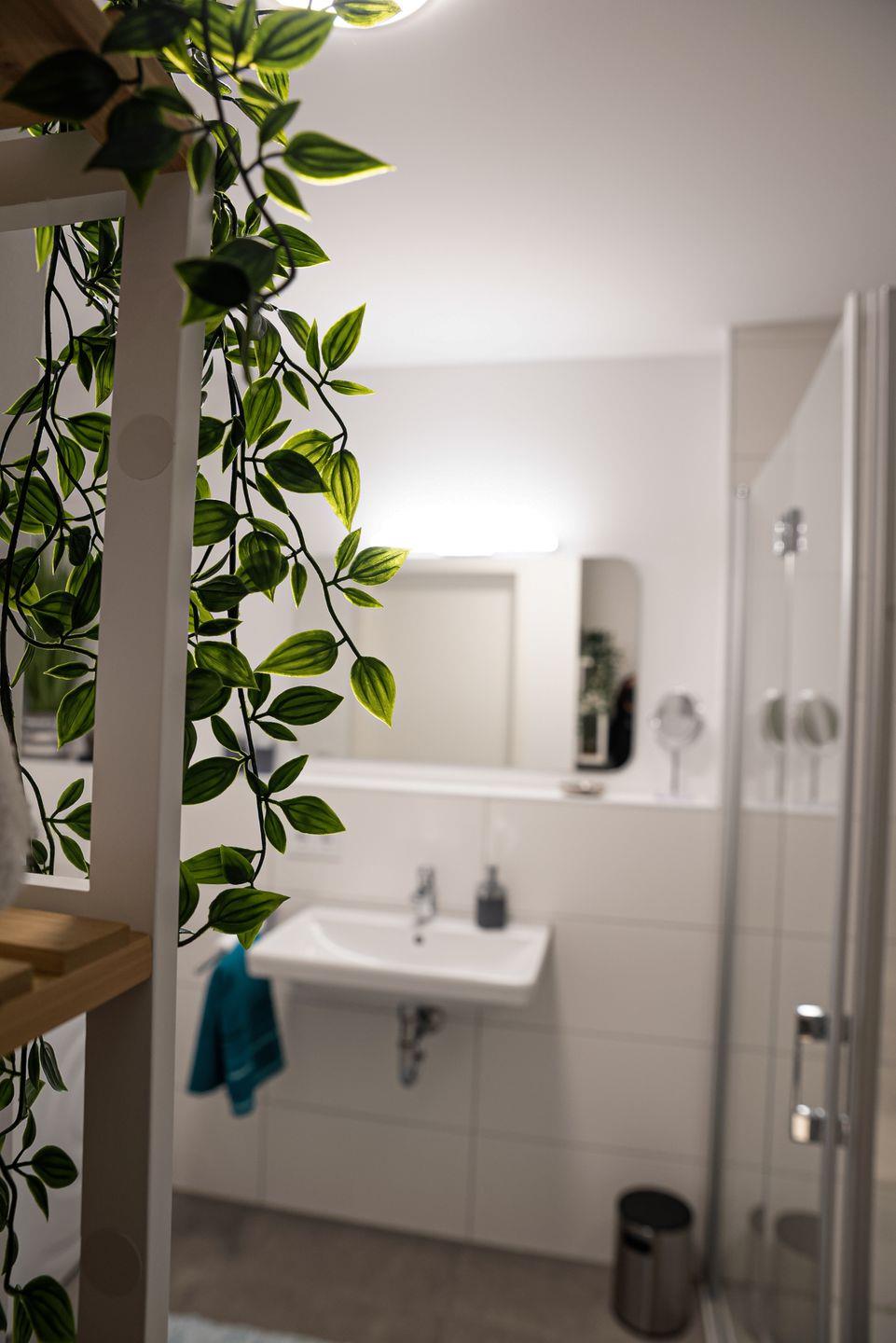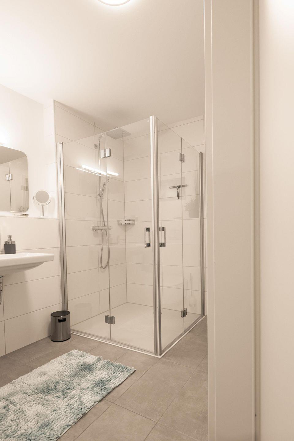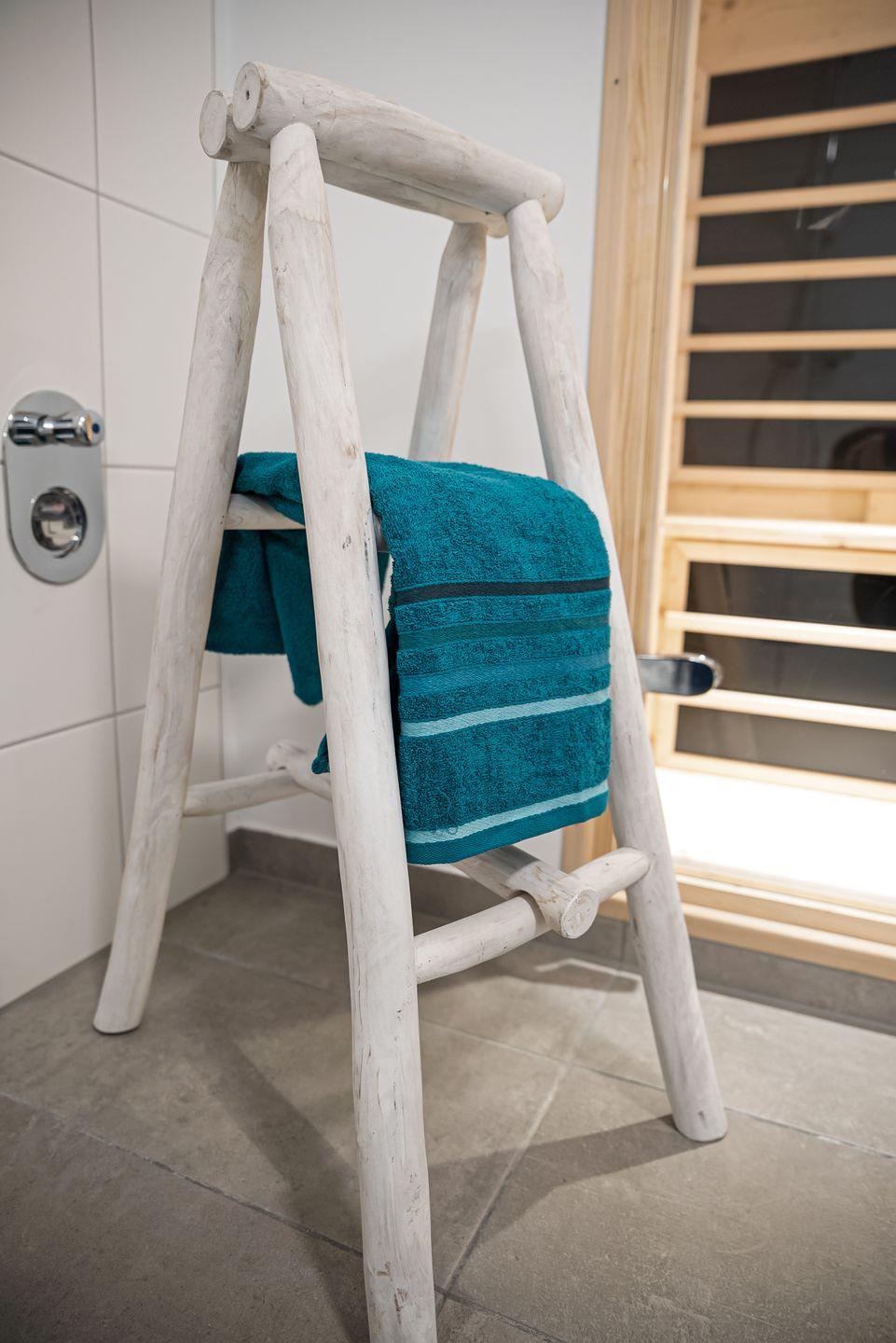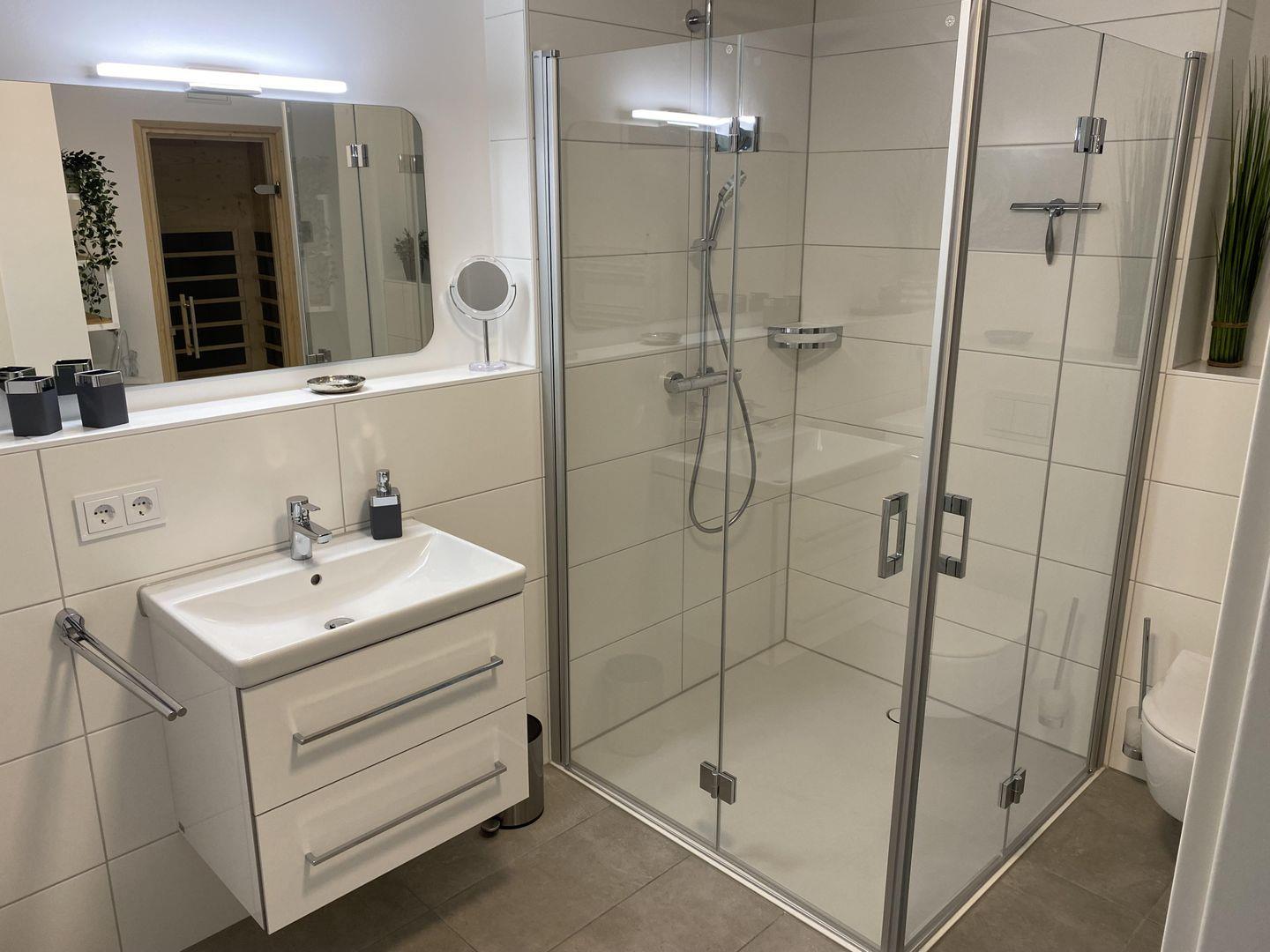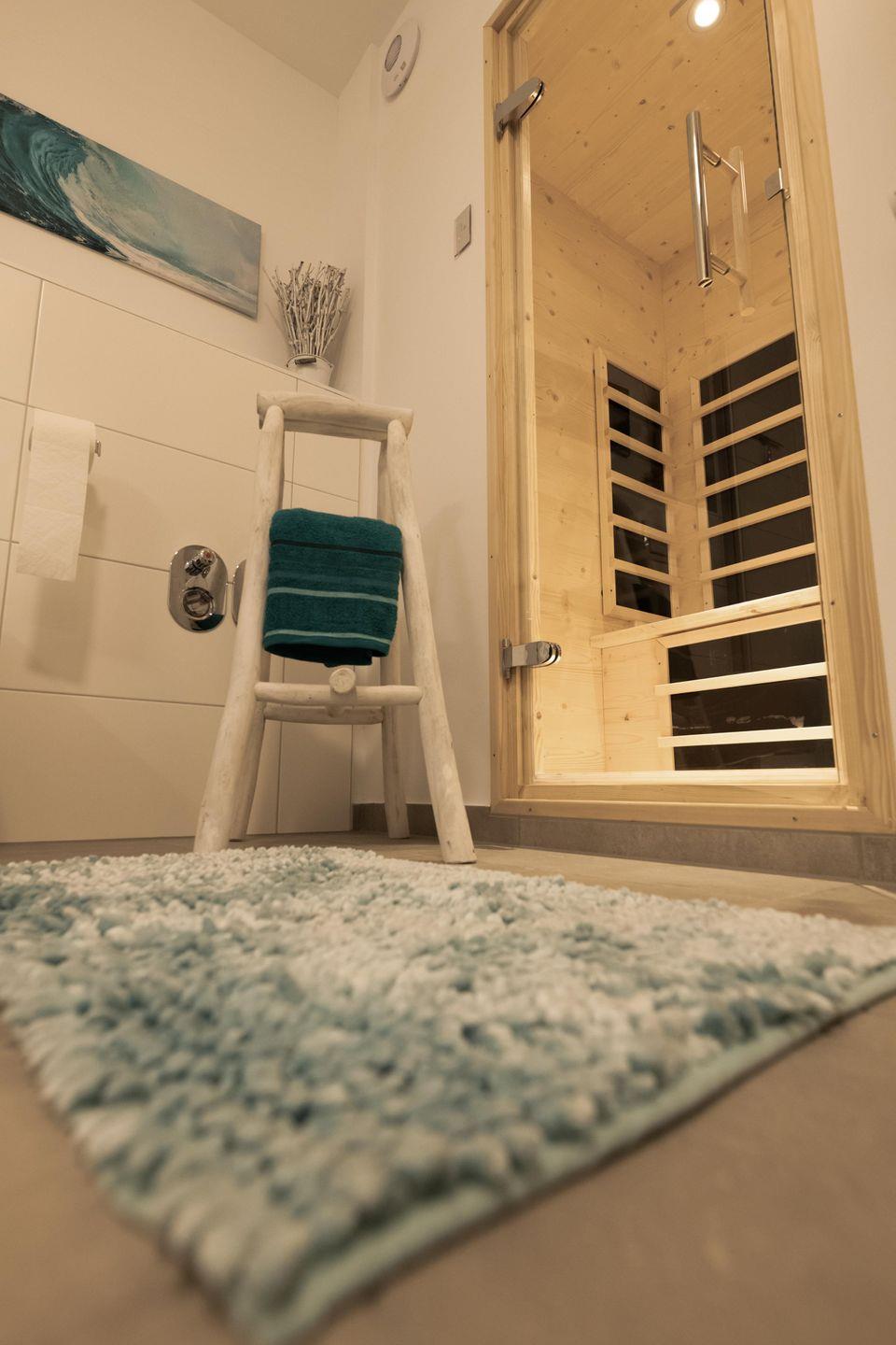Im Badezimmer erwartet Dich eine ebenerdige Dusche, ein Föhn und das Highlight: eine Infrarot-Sauna.