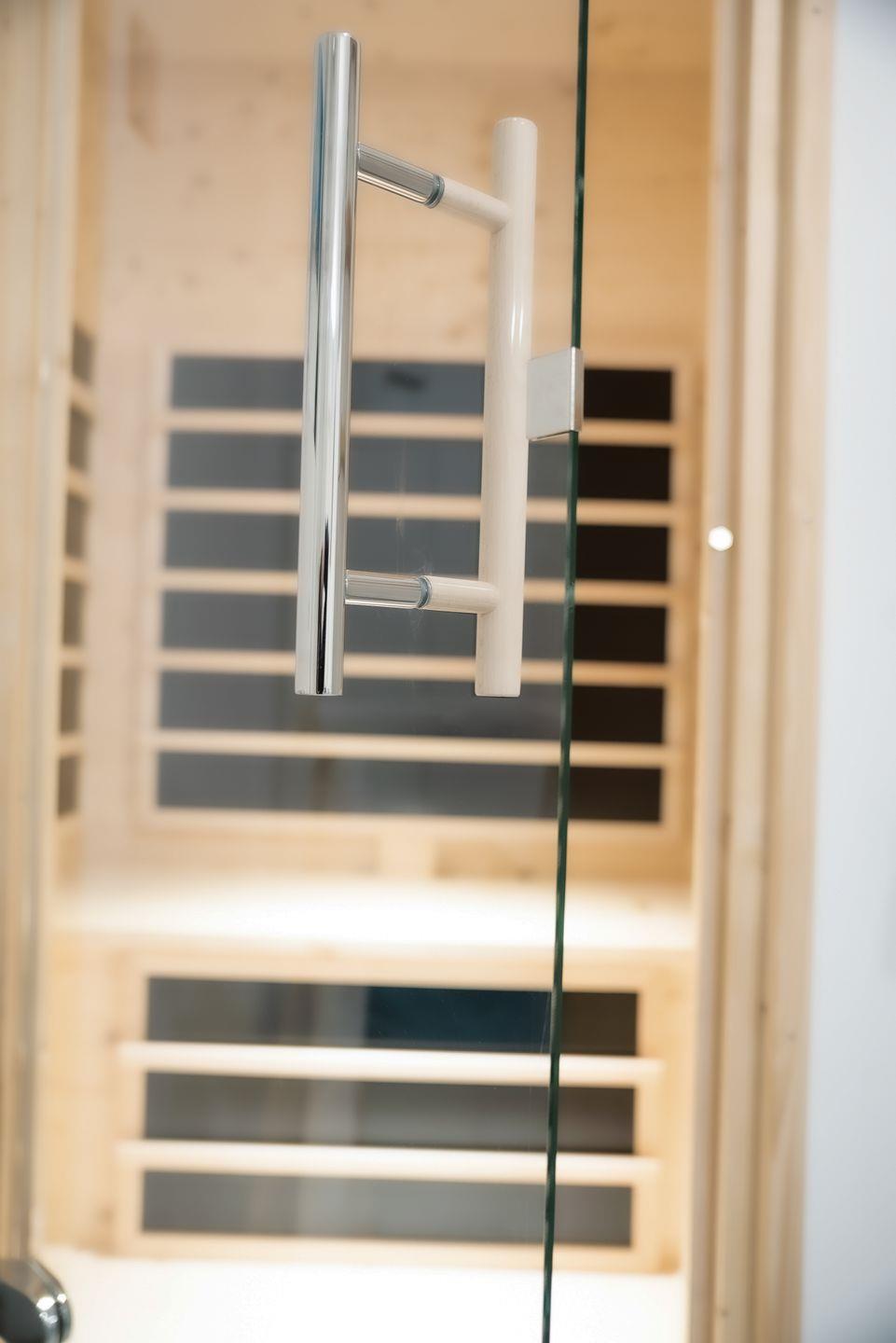 Eine Infrarot-Sauna im Badezimmer lädt Dich zu einem ausgiebigen Wellness-Tag ein.