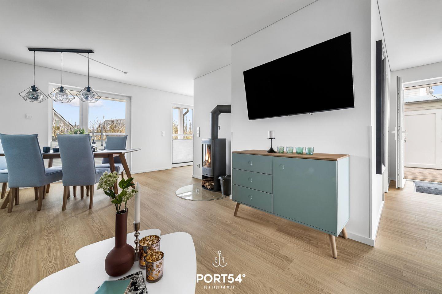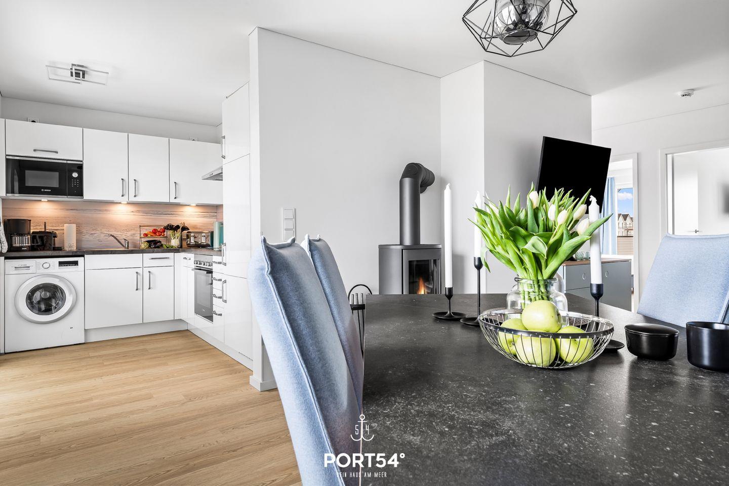 Willkommen in der Ferienwohnung „Pier 4t“. Das Wohnzimmer mit Kamin lädt Dich zum Entspannen ein. Die offene Küche ist modern und voll ausgestattet. Beide Schlafzimmer sind hochwertig eingerichtet und verfügen jeweils über ein gemütliches Doppelbett. Das Badezimmer bietet Dir eine ebenerdige Dusche sowie eine Infrarot-Sauna. Das Highlight der Ferienwohnung ist die Terrasse mit wunderschönem Ausblick.
