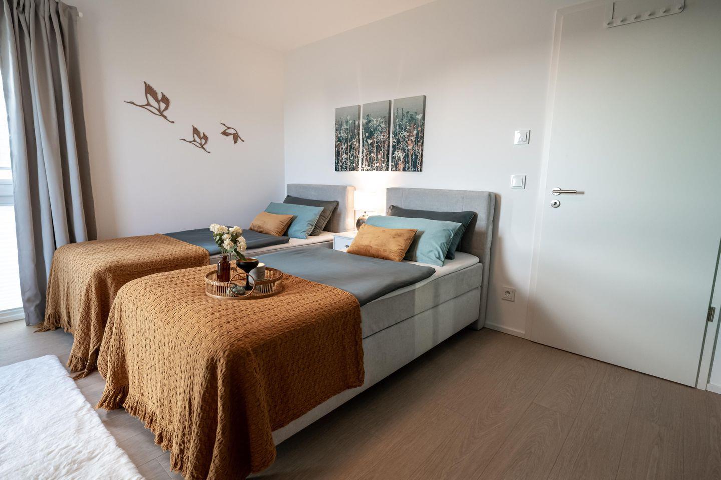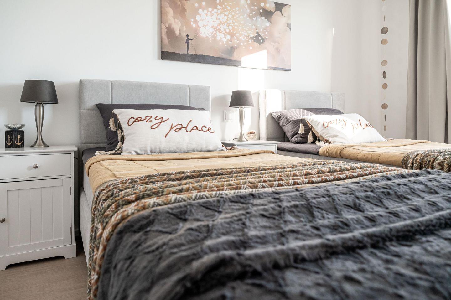 Die Wohnung bietet Ihnen eine perfekt ausgestattete Küche, einen Kamin & eine große Dachterrasse. Zwei, der drei Schlafzimmer, verfügen über Einzelboxspringbetten & das dritte über ein Doppelbett. In einem der beiden Badezimmer, erwartet Sie eine ebenerdige Dusche & eine Infrarot-Sauna & das zweite lädt zum Entspannen in der Badewanne ein. Bitte beachten Sie, dass sich das OstseeResort Olpenitz derzeit noch im Aufbau befindet und es zu Bautätigkeiten in der Nähe Ihrer Unterkunft kommen kann.