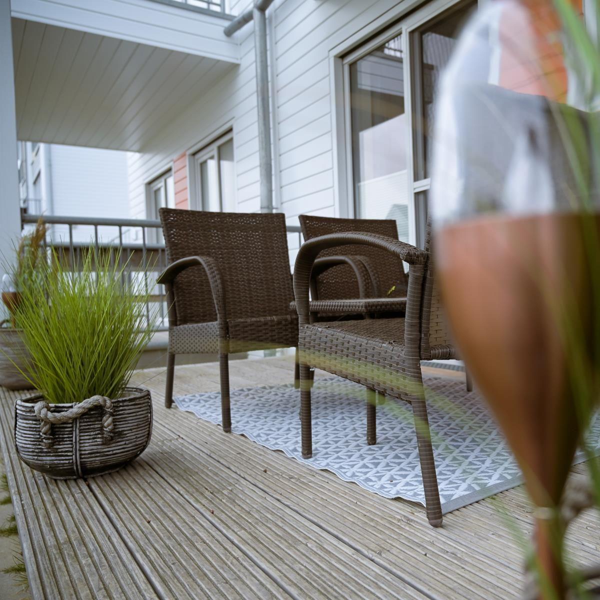 Vom Wohn-/Essbereich aus gelangst Du auf die Terrasse, die mit Gartenmöbeln sowie zusätzlich mit zwei Lounge-Stühlen und einem Hängesessel ausgestattet ist. Hier kannst Du Deinen Morgenkaffee genießen und Deine Urlaubstage bei einem Glas Wein ausklingen lassen. Dank des Elektrogrills kannst Du gesellige Grillabende mit der Familie verbringen und es Dir rundum gut gehen lassen.