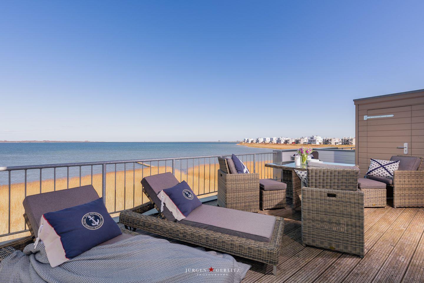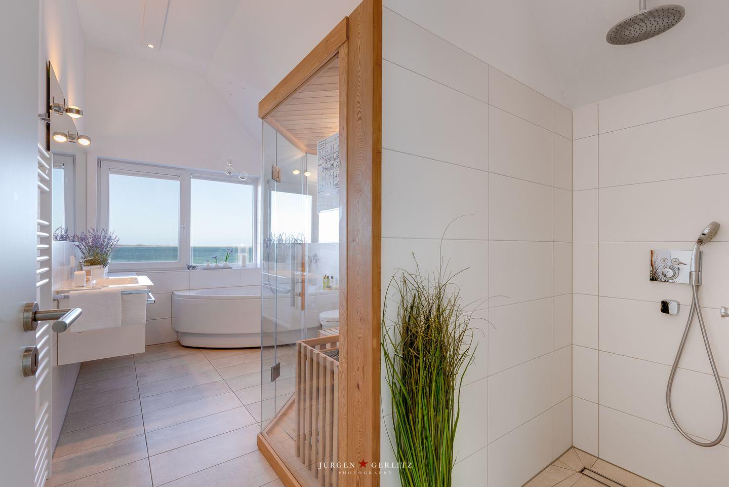 Im Dachgeschoss erwartet Dich das absolute Highlight dieser Wohnung: Ein Wellnessbad, das mit Whirlpool, Regendusche und einer privaten finnischen Glas-Sauna mit Blick auf das Wasser beeindruckt. Hier kannst Du Dich nach einem ereignisreichen Tag perfekt entspannen und den Alltag hinter sich lassen.