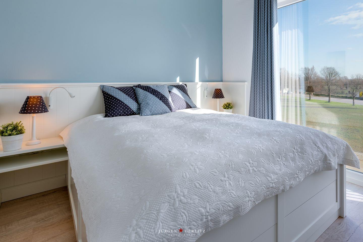 Auf derselben Etage befinden sich auch die beiden Schlafzimmer, die mit komfortablen Doppelbetten, großzügigem Stauraum und traumhaften Ausblicken aufs Wasser oder ins Grüne punkten.