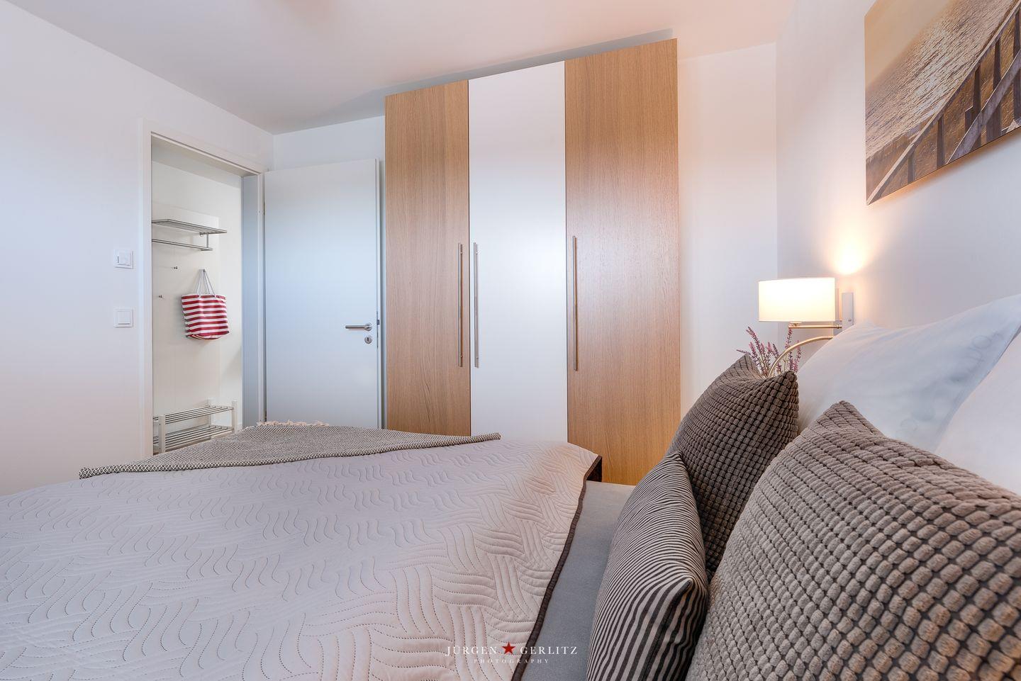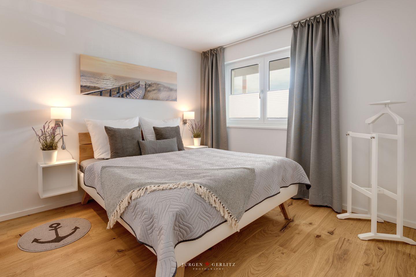 Im Schlafzimmer erwartet Dich ein gemütliches Massivholzbett mit den Maßen 160x200cm, das zu erholsamen Nächten einlädt. Der Ausblick aus dem Fenster verspricht romantische Sonnenuntergänge und einen traumhaften Anblick.