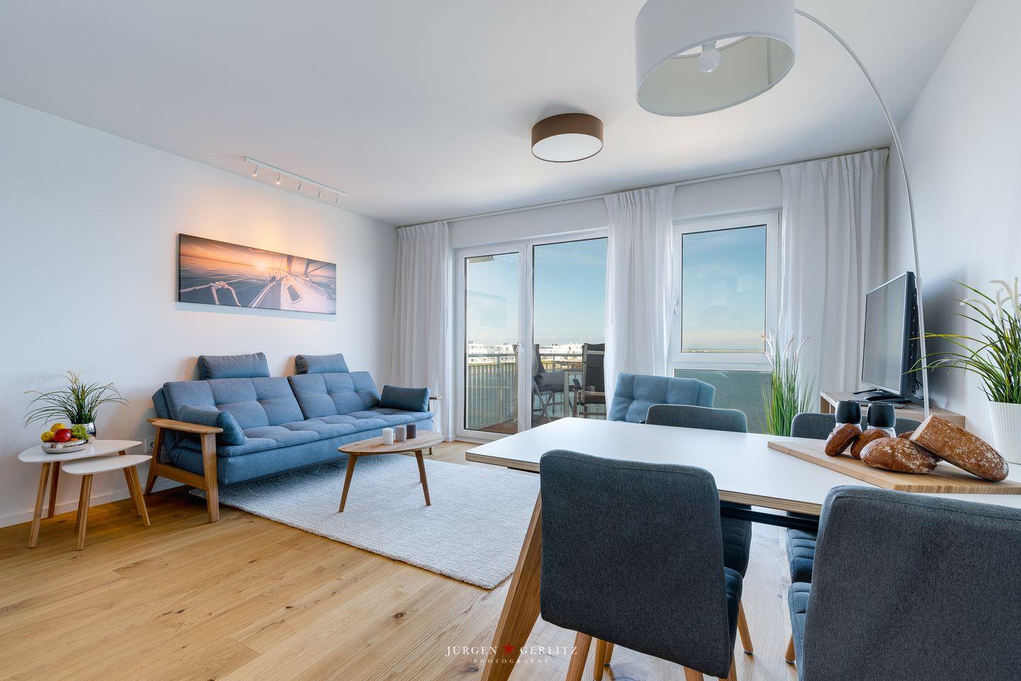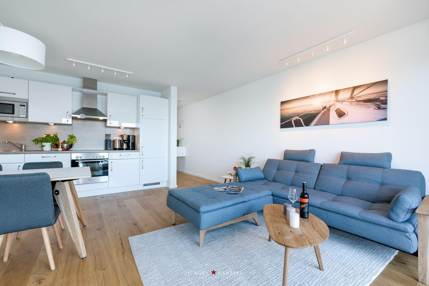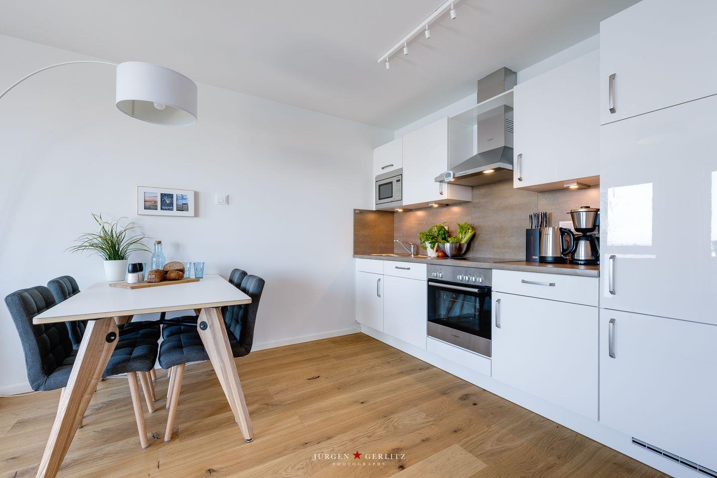 Der Wohn- und Essbereich ist das Herzstück und durch die anteilig bodentiefen Fenster zu jeder Tageszeit einladend hell. Die Küche ist perfekt ausgestattet, damit Du nach Lust und Laune kochen kannst.