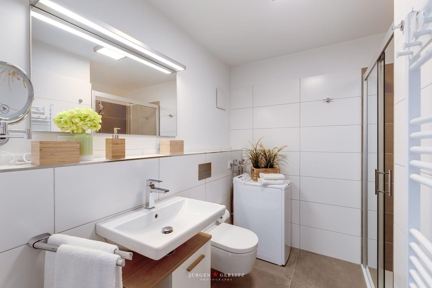Das großzügige Badezimmer bietet Dir eine geräumige ebenerdige Dusche.