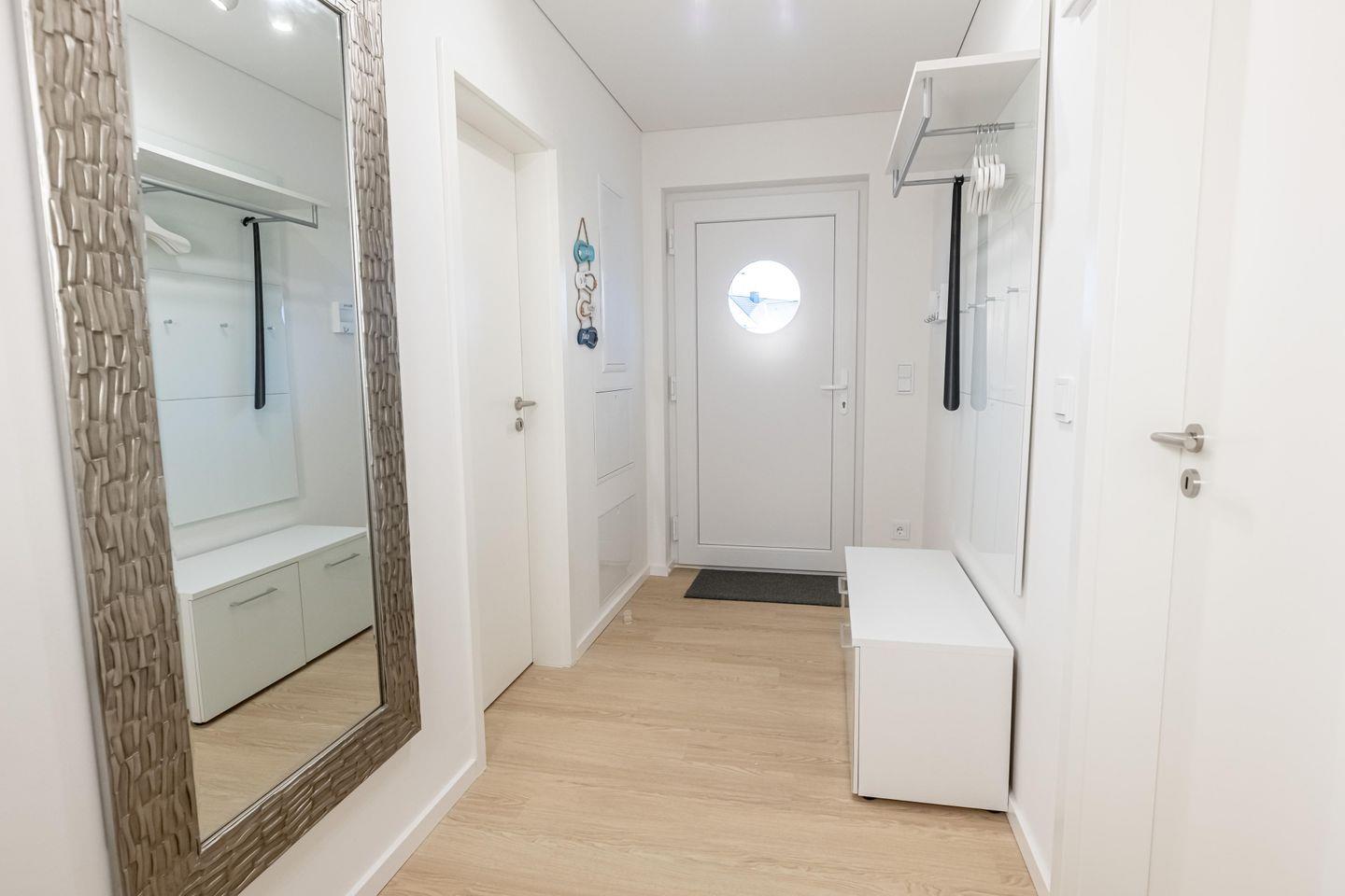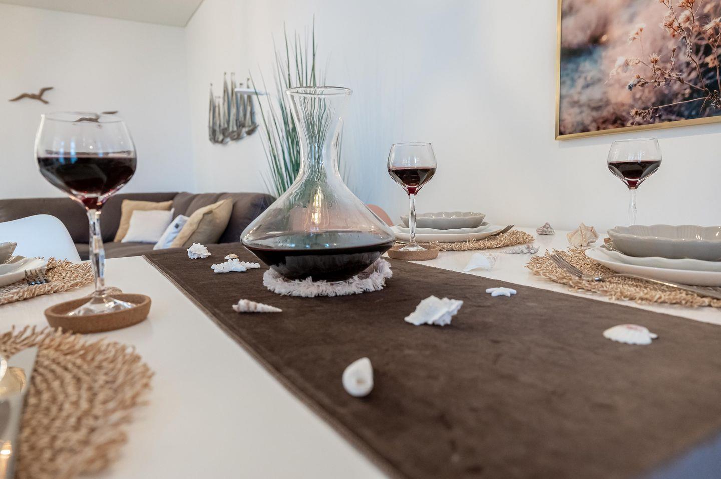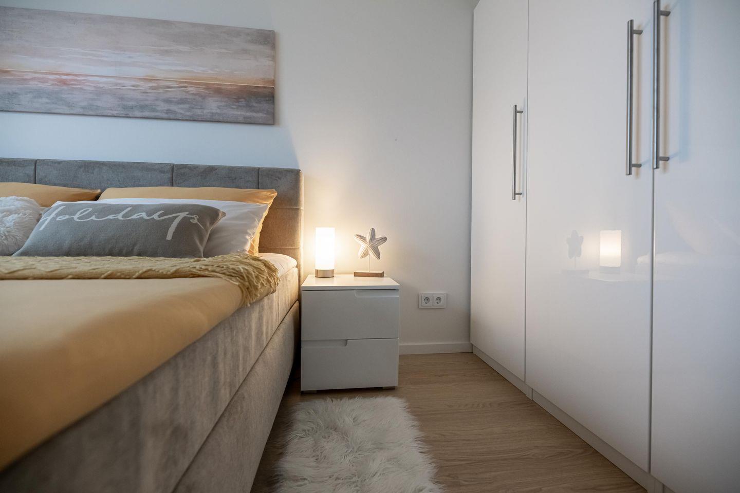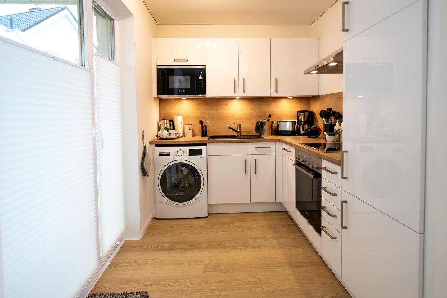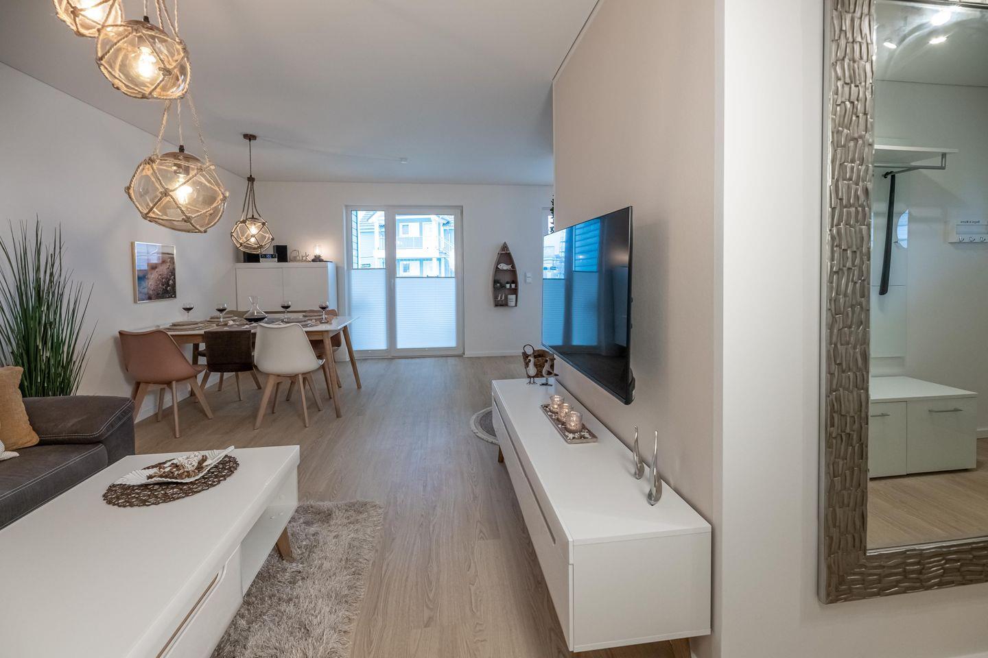 Eintreten und wohlfühlen! Die Ferienwohnung "Entspann Dich“ ist modern, stilvoll und sehr gemütlich, sie besticht durch zeitlose Eleganz und wurde mit viel Liebe zum Detail eingerichtet. Neben zwei Schlafzimmern, einem hellen und freundlichen Bad mit Infrarot-Sauna, einem sehr ansprechenden Wohn- und Essbereich, sowie einer vollausgestatteten Küche, bietet diese im Erdgeschoss gelegene Wohnung eine voll möblierte Terrasse. Das Wohnzimmer ist mit einer großzügigen Wohnlandschaft und einem großen Multimedia-Smart-TV ausgestattet. Gemütliche Abende sind garantiert. Kostenfreies WLAN und Magenta-TV stehen Ihnen selbstverständlich zur Verfügung. In beiden Schlafzimmern finden Sie hochwertige Boxspringbetten. In einem Schlafzimmer ein Doppelbett (180x200cm) in dem anderen zwei Einzelbetten (90x200cm), die Sie jederzeit zu einem Doppelbett zusammenschieben können. Auch verfügen beide Schlafzimmer über Multimedia-Smart-TVs und ausreichenden Stauraum. Verdunklungsmöglichkeiten sowie Fliegengitter ermöglichen Ihnen eine angenehme Nachtruhe. Eine weitere Schlafmöglichkeit bietet das Schlafsofa im Wohnbereich. Die Küche ist von der Nespresso-Maschine über den Wasch-Trockner bis zur Spülmaschine mit allen erdenklichen modernen Annehmlichkeiten ausgestattet. Kochen und backen machen hier wirklich Spaß. Das lichtdurchflutete Bad bietet Ihnen eine große ebenerdige Dusche, einen Fön und einen Kosmetikspiegel. Für Wellnessfeeling sorgt die eingebaute Infrarot-Sauna mit Soundanlage. Auch die Terrasse lädt, mit einem Tisch und 6 Hochlehner-Stühlen, zum Entspannen ein und der hochwertige Weber-Elektrogrill lässt auch Grillfreunde auf Ihre Kosten kommen. Jeder Raum verfügt über Plissees sowie Fliegengitter. Da die Wohnung Tier frei ist, fühlen sich auch Allergiker wohl. Auf der angrenzenden Terrasse können Sie den Tag in Ruhe ausklingen lassen und die schönen Sonnenuntergänge genießen. Auch die Grünfläche vor der Terrasse kann genutzt werden. Direkt vor der Unterkunft parken Sie kostenfrei, eine E-Ladesäule steht Ihnen hier ebenso zur Verfügung, wie ein abschließbarer Fahrradschuppen.