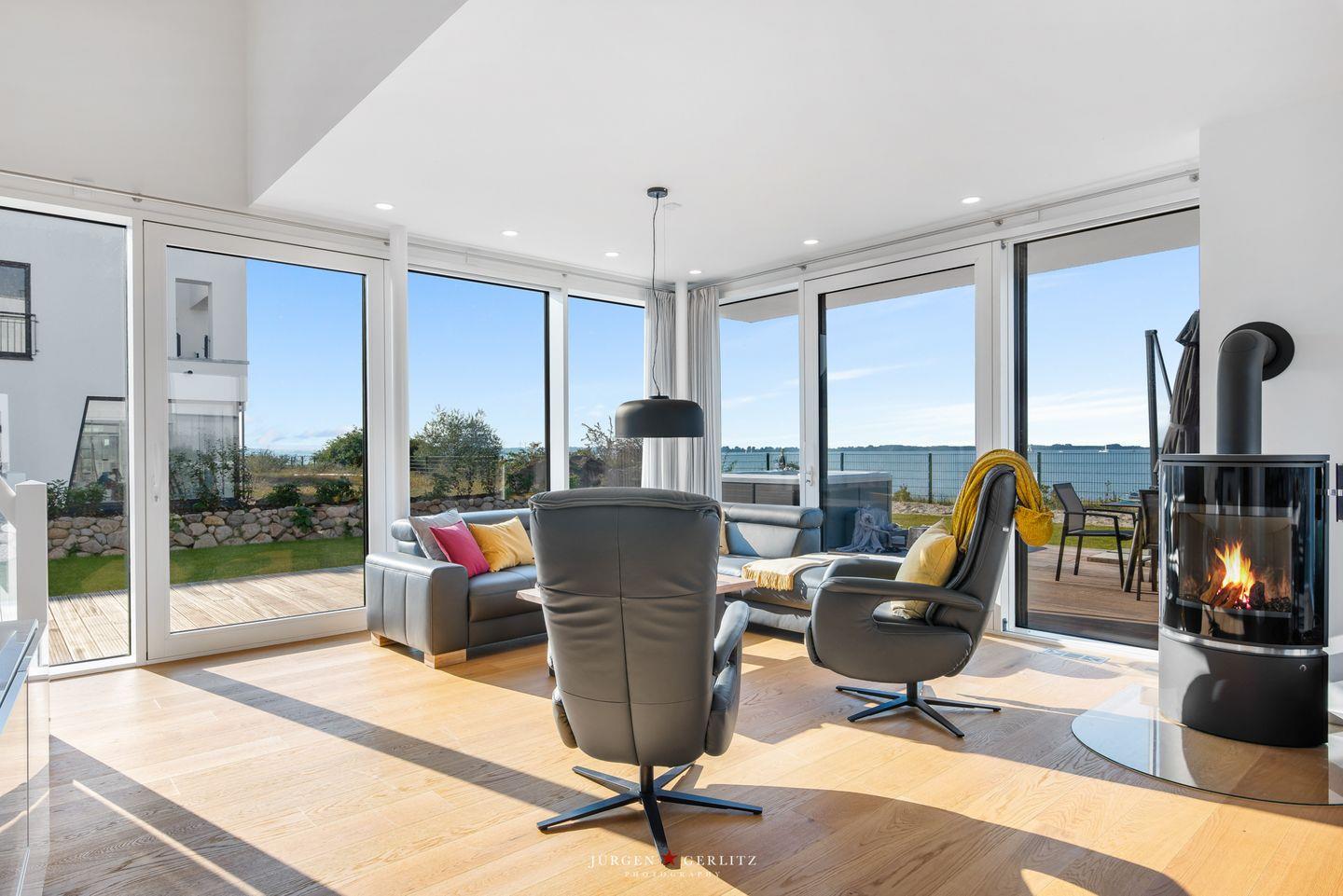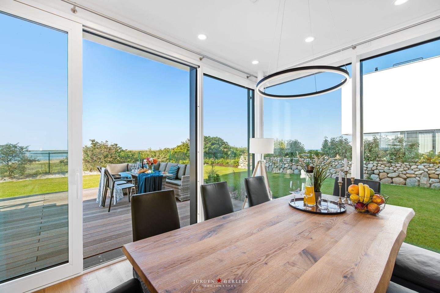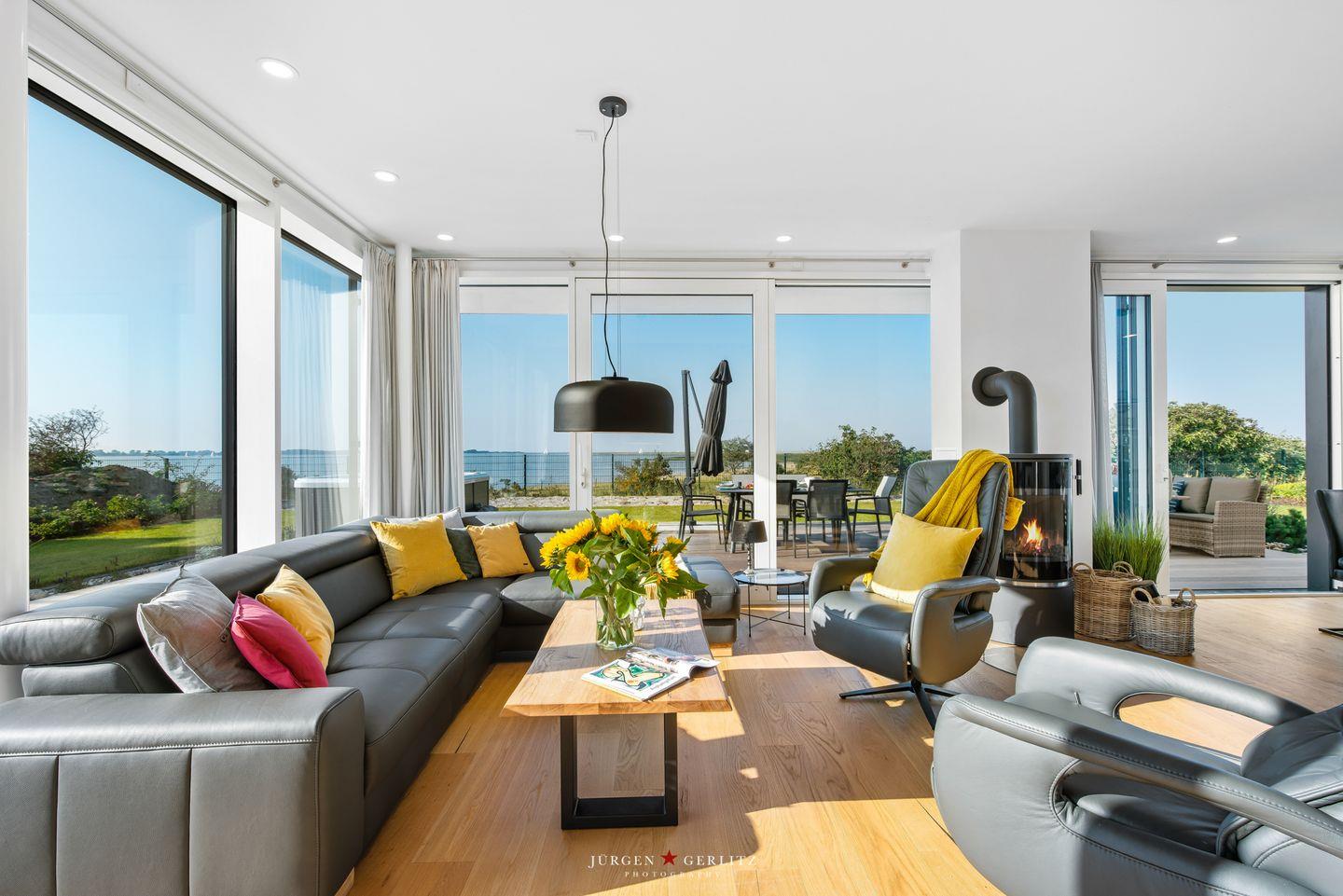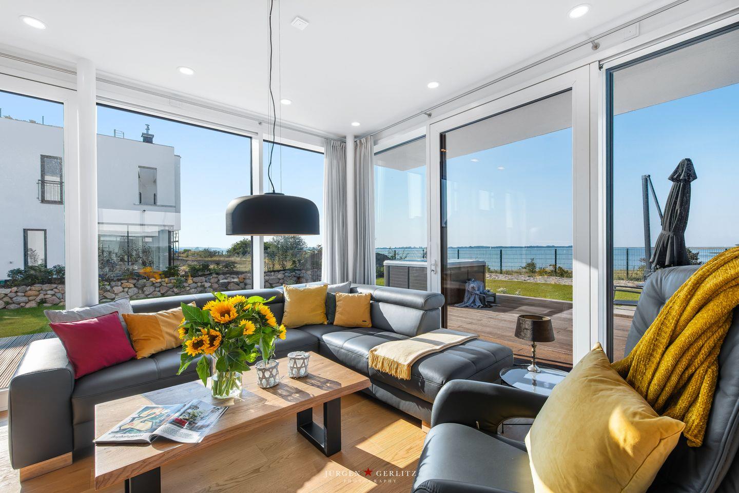 Nach Betreten dieser Villa befindest Du Dich im lichtdurchfluteten, modernen und exklusiv eingerichteten Wohn-/Essbereich wieder, der dank seiner bodentiefen Panoramafenster einen atemberaubenden Ausblick über die Schleimündung und die Ostsee bietet.