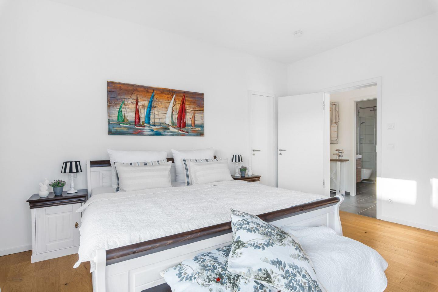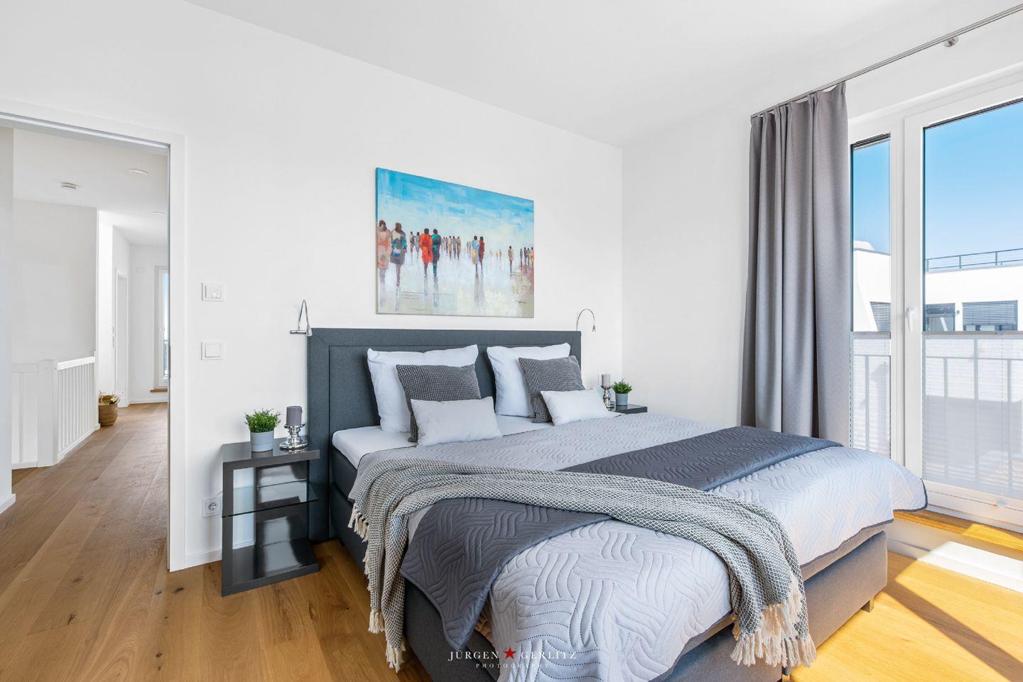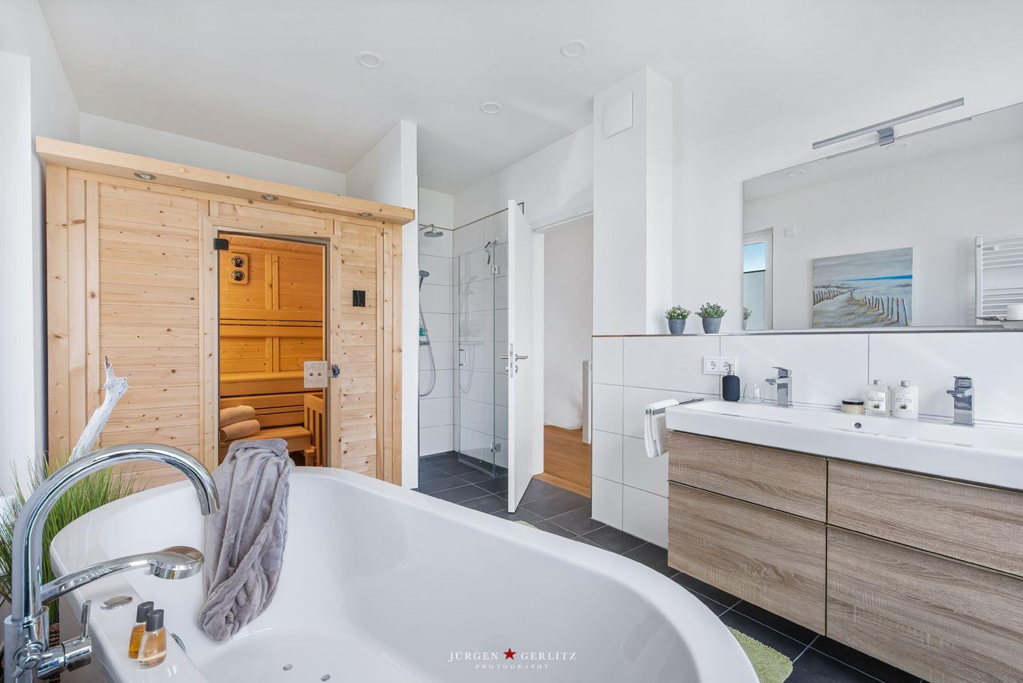 Auch eines der großen Schlafzimmer mit Doppelbett sowie ein modernes, vollwertiges Bad befinden sich im Erdgeschoss. Vom Wohnzimmer aus führt eine Treppe in das Obergeschoss mit drei weiteren Schlafzimmern. Auch dort erwartet Dich ein weiteres Highlight: das große Wellnessbad mit einer Sauna und ebenerdiger Dusche. Nach dem Saunagang kannst Du direkt auf den vom Bad aus zugänglichen Balkon oder hinauf auf die große Dachterrasse gehen. Genieße dort einen traumhaften Sonnenuntergang - schöner lässt sich die Ruhe kaum genießen!