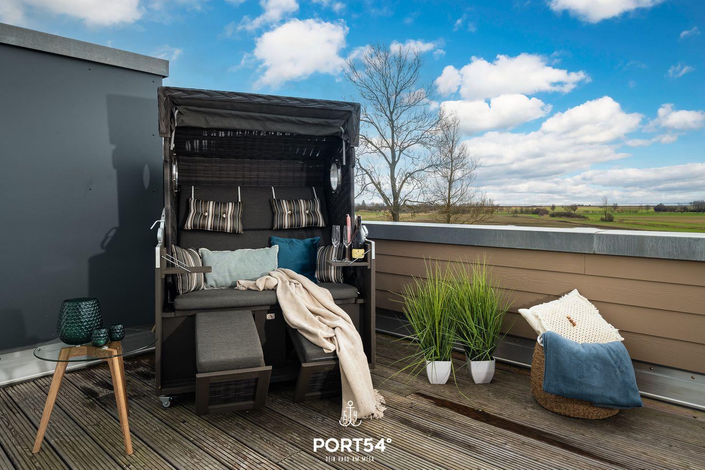 Die Maisonette Lounge "Weltreise" im ersten und zweiten Obergeschoss bietet neben drei Schlafzimmern auch eine offene, vollausgestattete Küche, zwei Badezimmer, einen gemütlichen Wohnbereich und eine große Dachterrasse mit einem atemberaubenden Blick über ein unverbautes Naturschutzgebiet. Eines der Highlights ist der Kamin im Wohnbereich, vor welchem Sie es sich in der kalten Jahreszeit gemütlich machen können. Zwei Schlafzimmer verfügen jeweils über ein großes Doppelbett (180×200cm) und zusätzlich über einen Flachbild-TV. Das dritte Schlafzimmer verfügt über zwei Einzelbetten (90×200cm). Im Badezimmer im ersten Obergeschoss erwartet Sie eine ebenerdige Dusche. Die Badewanne im zweiten Obergeschoss lädt zu entspannenden Stunden ein. Zusätzlich gibt es eine Infrarot-Kabine - Wellness pur! Auch vierbeinige Familienmitglieder können gegen Aufpreis mitreisen. Der Zutritt auf die möblierte Dachterrasse ist vom Wohnbereich aus möglich. Auf den gepolsterten Sitzmöglichkeiten lässt sich ein schöner Grillabend am Elektro-Grill verbringen. Sie parken kostenfrei vor der Unterkunft.