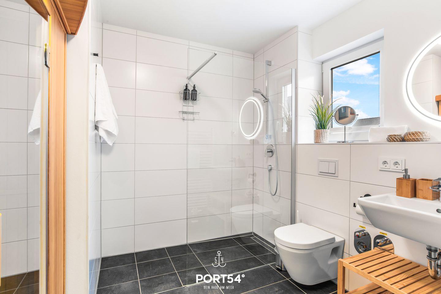 Im Badezimmer erwartet Dich neben einer ebenerdigen Dusche auch eine Infrarot-Sauna für die perfekte Erholung während Deines Urlaubs.