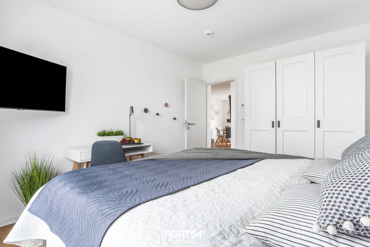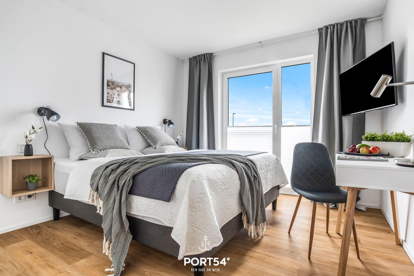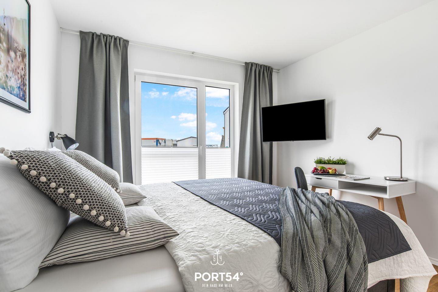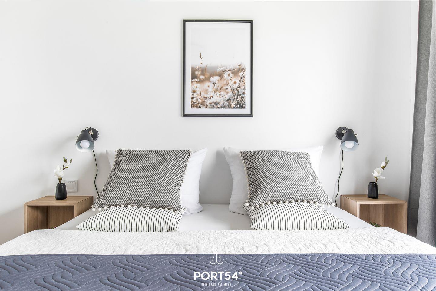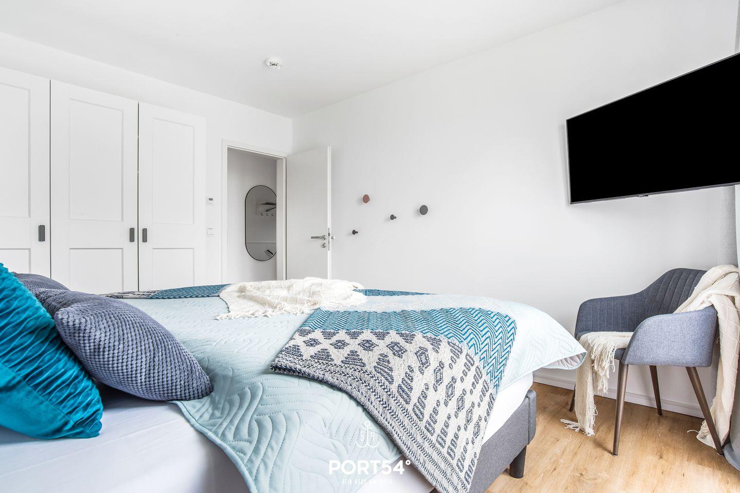 Beide Schlafzimmer verfügen über Doppelbetten (je 180 × 200 cm) und Flachbild-TVs. Von hier aus kannst Du einen Blick auf den Hafen erspähen. Verdunkelungsmöglichkeiten und Insektenschutzgitter sorgen für eine angenehme Nachtruhe.