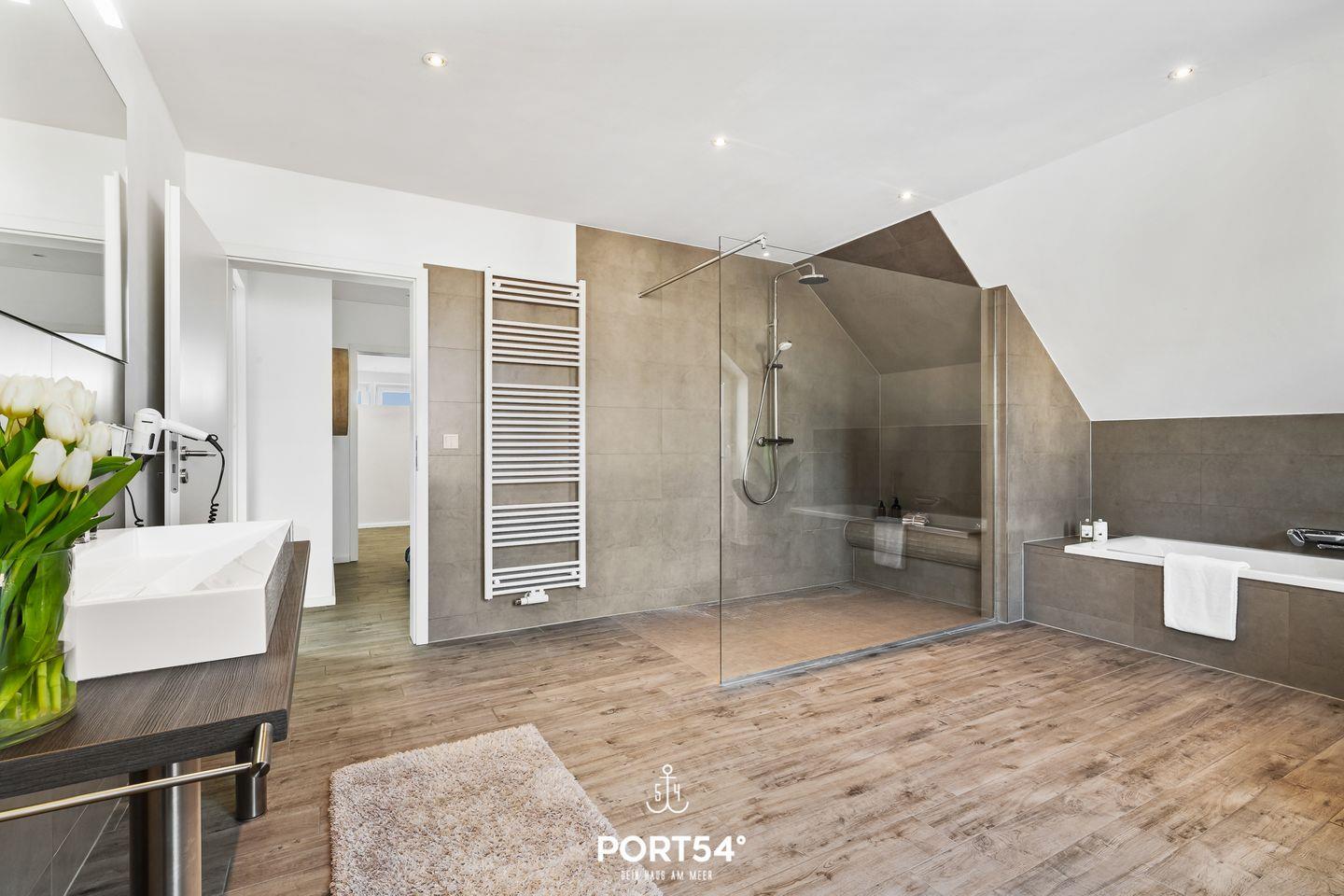 In den beiden Badezimmern der Villa findest Du alles, was Du für entspannende Wellnessmomente benötigst. Das geräumige Hauptbadezimmer lockt mit einer ebenerdigen Dusche und einer einladenden Badewanne, während das zweite Badezimmer eine weitere moderne ebenerdige Dusche bereithält. Ein weiteres Highlight der Villa ist die moderne Fasssauna – der ideale Ort, um nach langen Strandspaziergängen die Seele baumeln zu lassen und dem Alltag zu entfliehen.