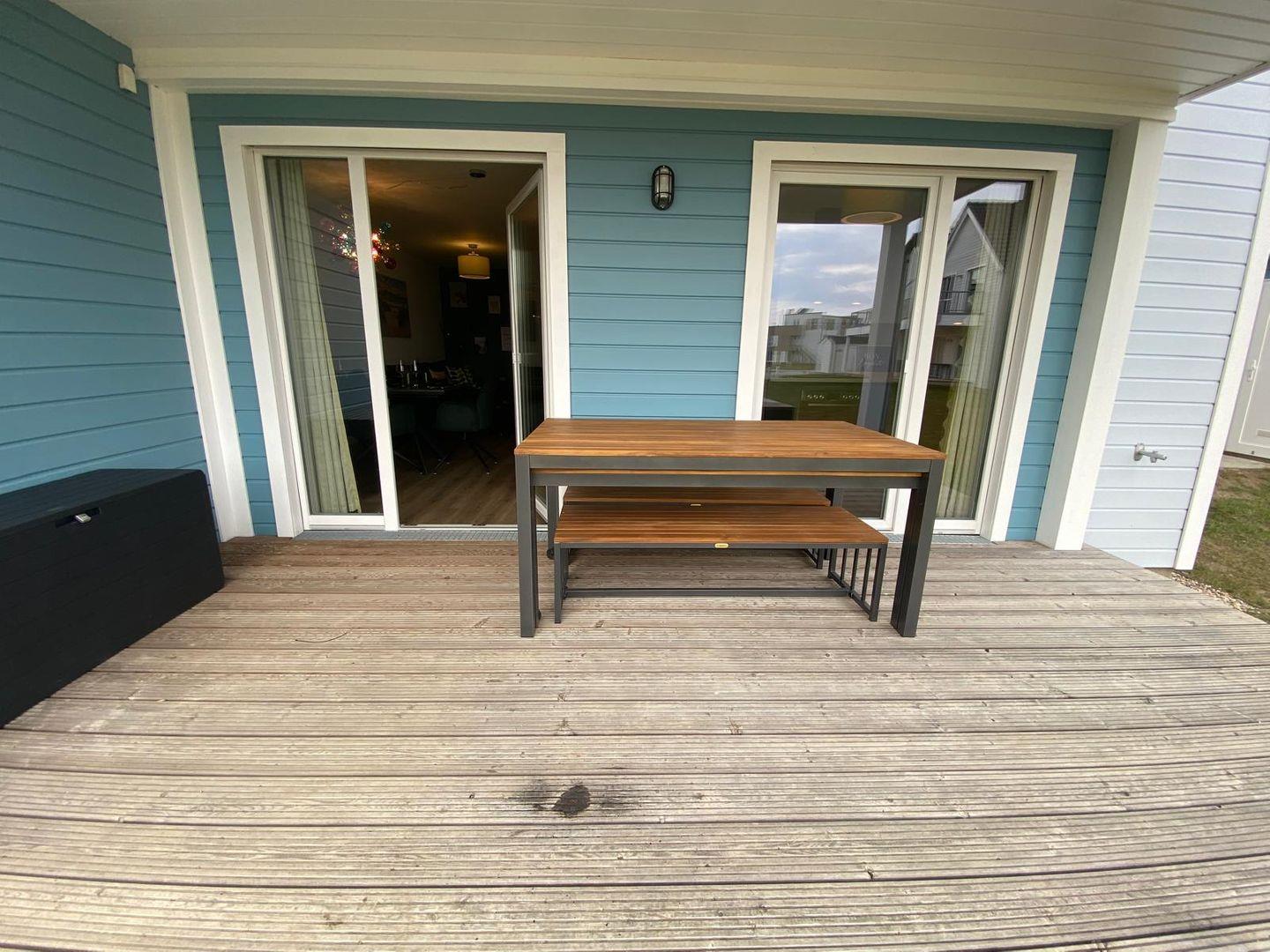 Die nach Südwesten ausgerichtete Terrasse erweitert den Wohnraum nach draußen. Bequeme Outdoor-Möbel und ein E-Grill schaffen beste Voraussetzungen für sonnige Stunden und gemütliche Grillabende bis in den Abend hinein.
