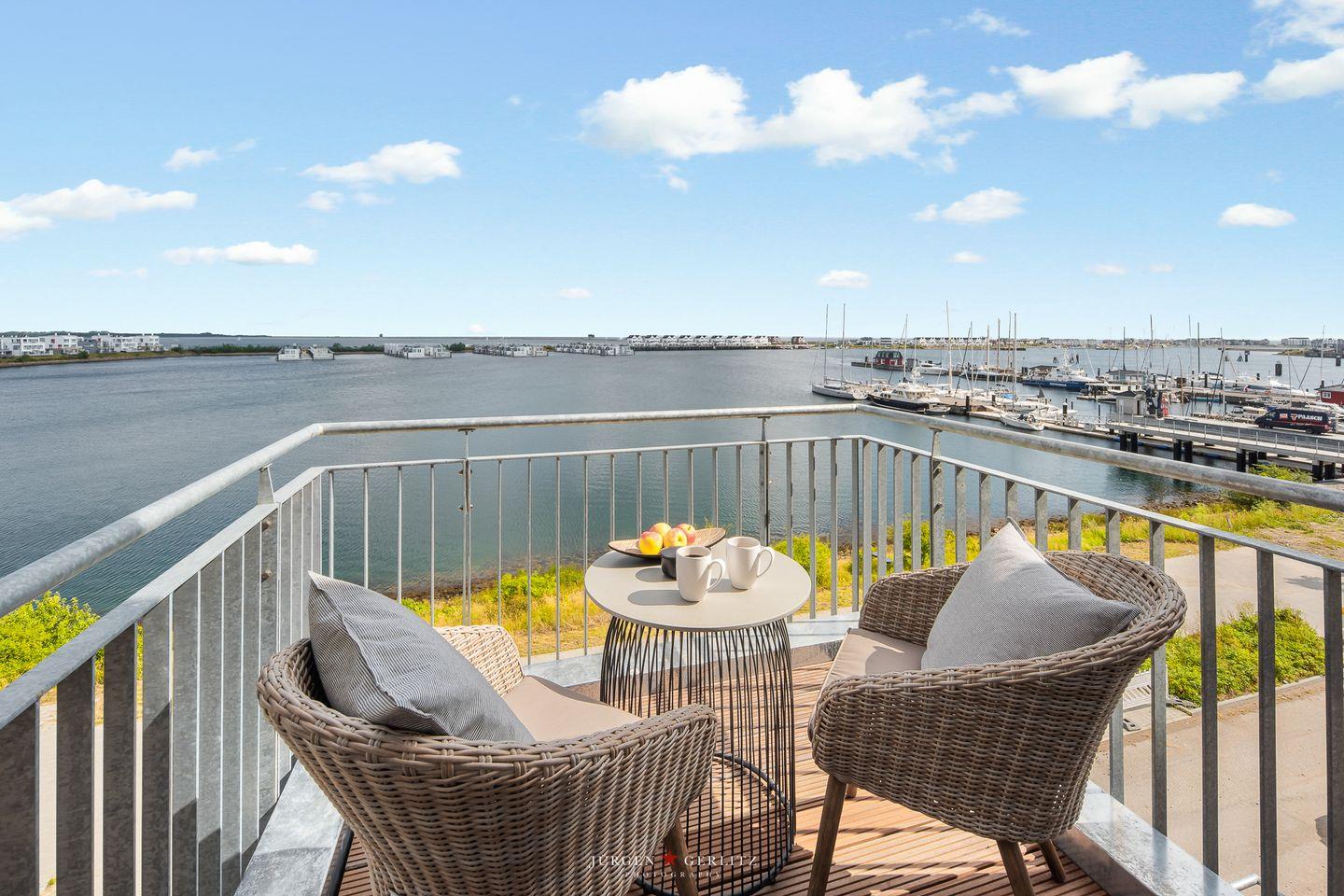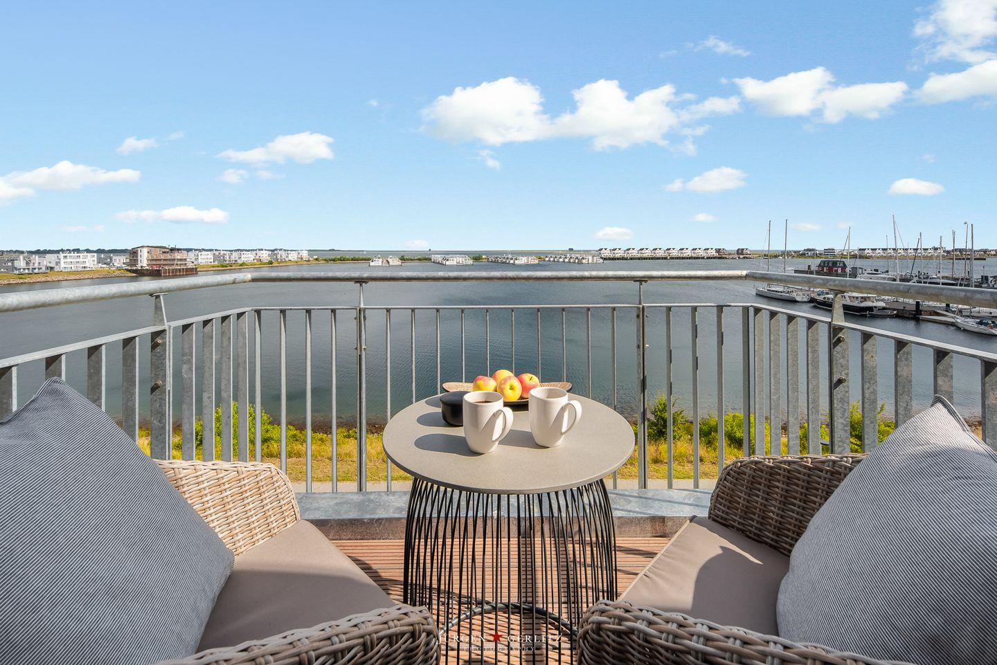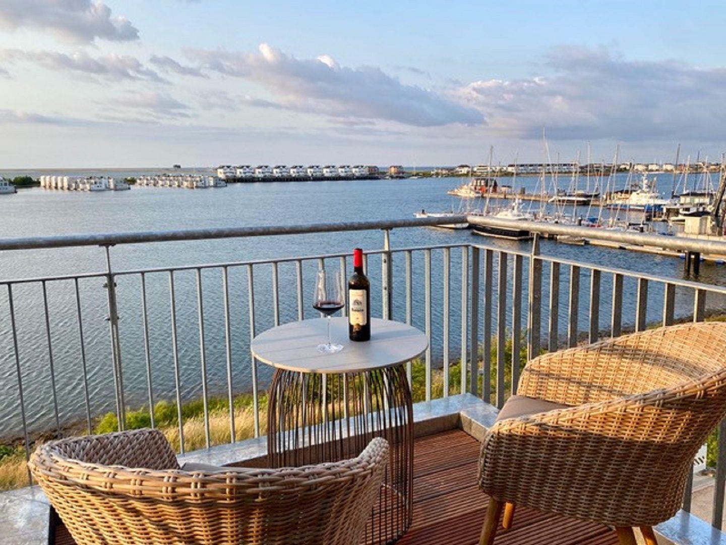Der Balkon schwebt scheinbar über der Hafenpromenade. Whale Watching inklusive! Mit etwas Glück kannst Du Schweinswale im Hafenbecken beobachten.