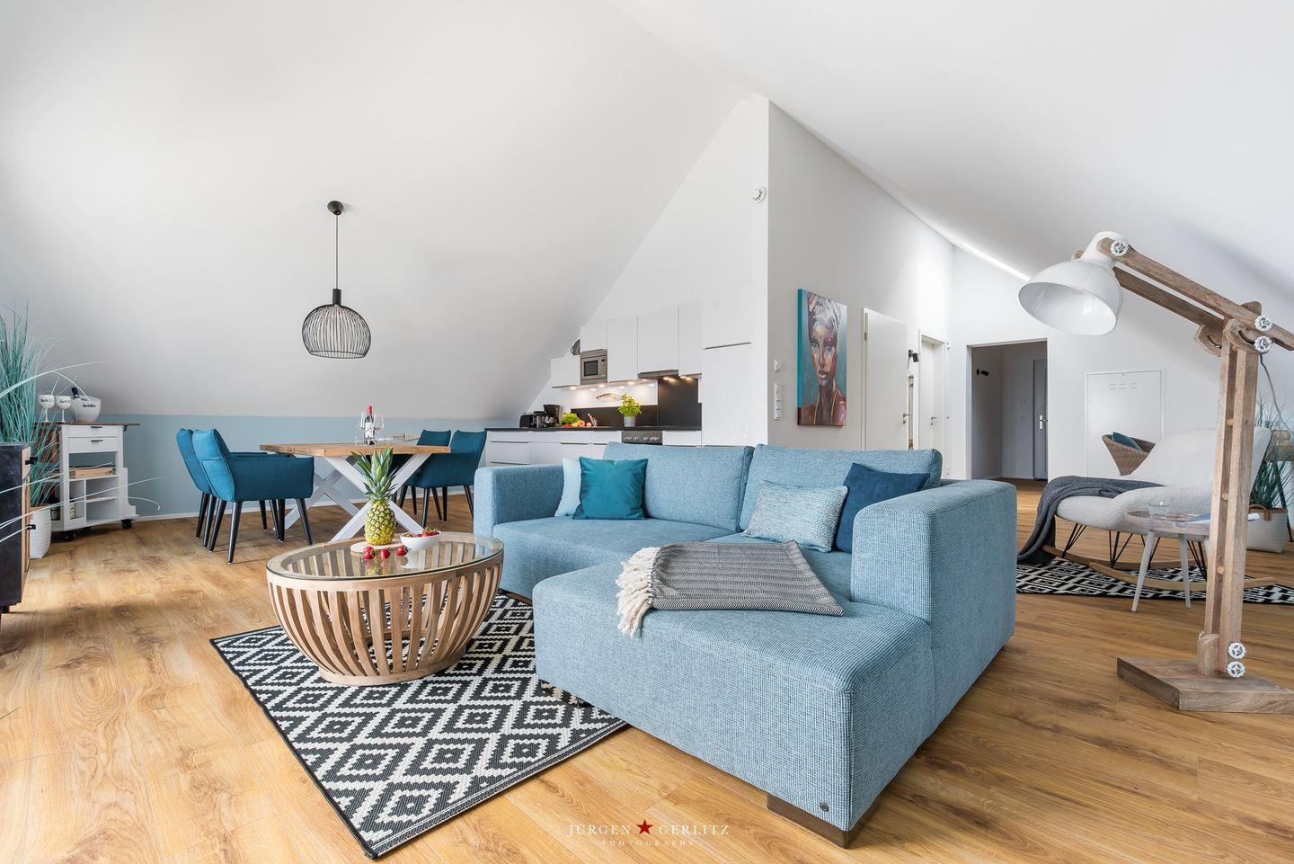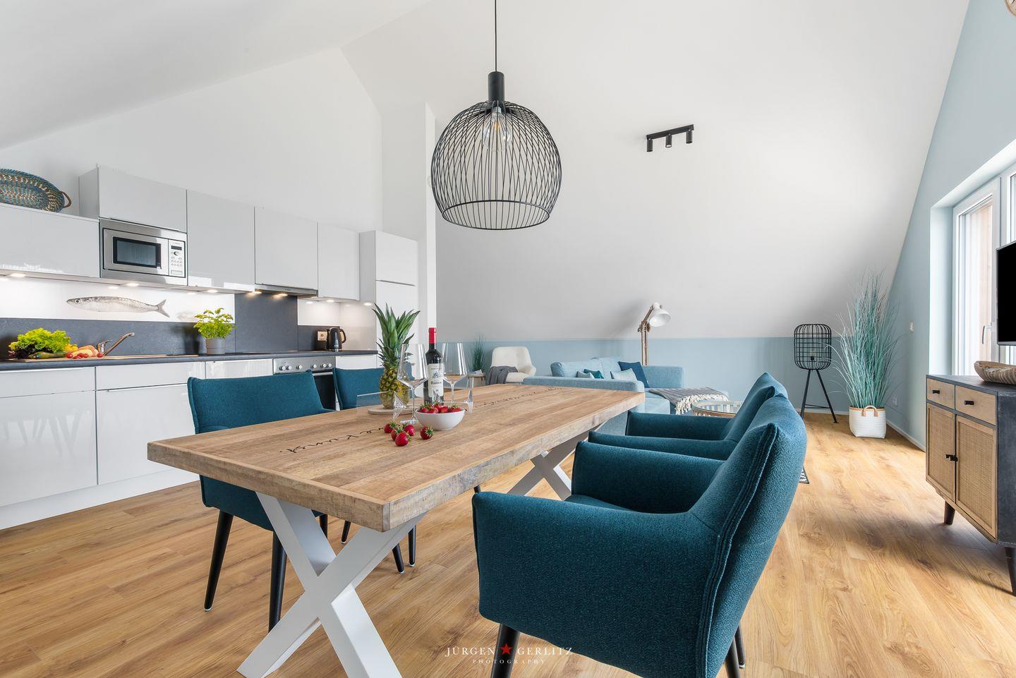 Die Aloha Lounge befindet sich im obersten Stock des Klabautermann II direkt an der Hafenpromenade von Olpenitz. Bereits beim Betreten der Wohnung kannst Du durch die breite, bodentiefe Fensterfront das Wasser sehen. Der lichtdurchflutete, loftartige Wohn-, Küchen- und Essbereich mit ausgeprägt hohen Decken bietet Dir dabei die unterschiedlichsten Perspektiven. So ergeben sich nach den jeweiligen Lichtverhältnissen verschiedene Sitzmöglichkeiten, was die 80 m² noch einmal größer erscheinen lässt.