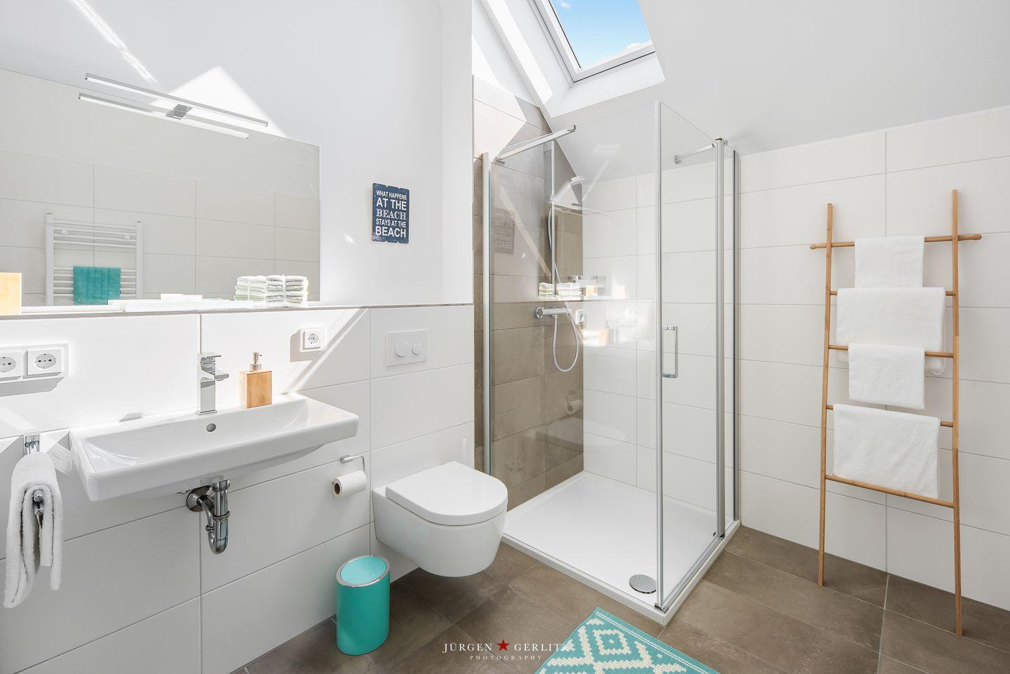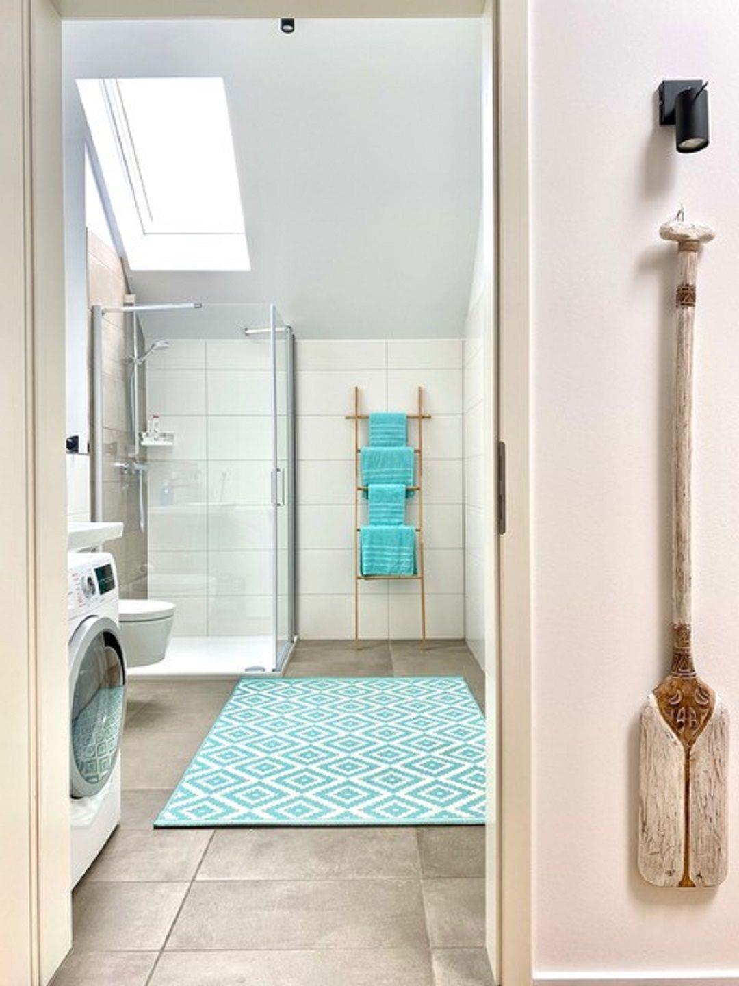 Das geräumige Bad ist mit einer ebenerdigen Dusche, Waschbecken, WC und einer Waschmaschine mit integriertem Trockner ausgestattet. Solltest Du Dein Home-Office nach Olpenitz verlegen wollen, steht Dir im Wohnflur ein Schreibtisch zur Verfügung. Unsere Ferienwohnung ist vollflächig mit Fußbodenheizung ausgestattet. Insgesamt 3 elektrische Dachflächenfenster sorgen für eine gute Belüftung und Temperierung aller Räume. Die „Aloha Lounge“ ist daher zu allen Jahreszeiten das perfekte Urlaubsdomizil.