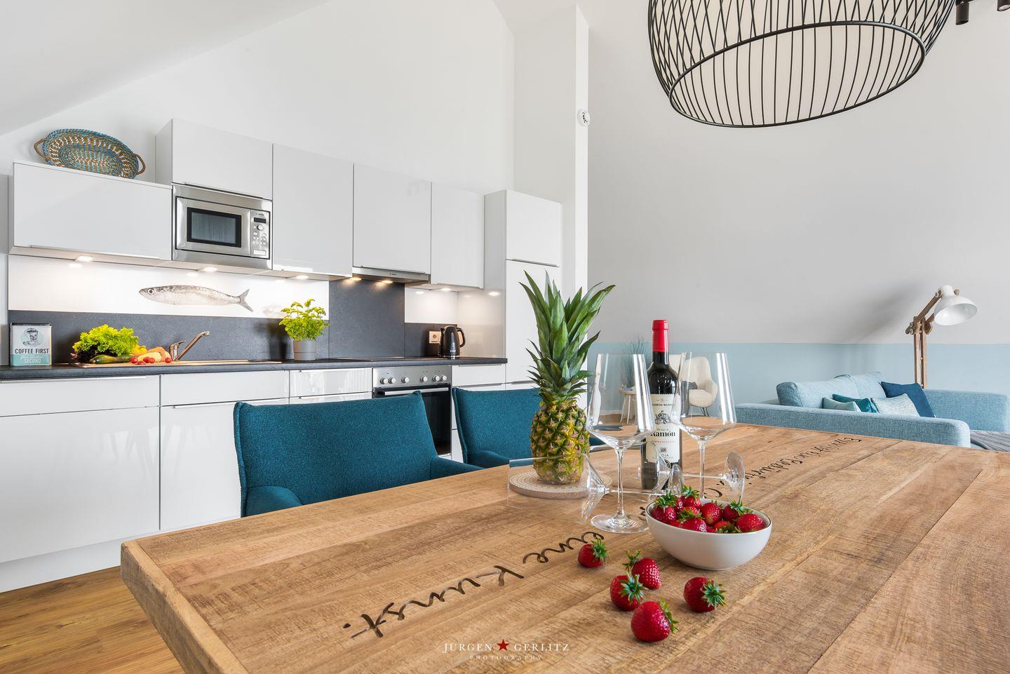 Auch die offene Küche lässt keine Wünsche offen. Neben einem Herd mit Ceranfeld und Dunstabzug, Backofen, Mikrowelle sowie einem Kühlschrank mit Gefrierfach stehen Dir hier auch eine Kaffee- und Nespressomaschine, Wasserkocher und Toaster sowie eine umfangreiche Auswahl an Koch- und Essgeschirr zur Verfügung.