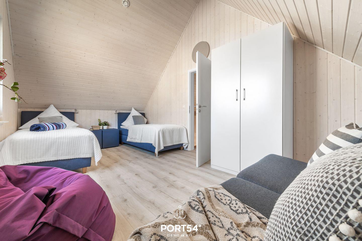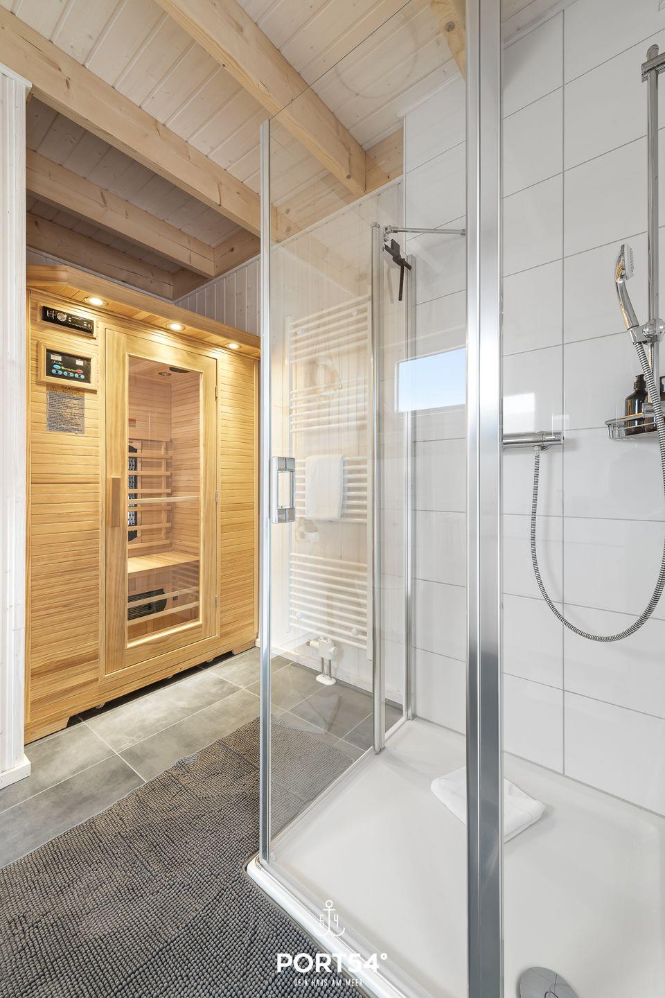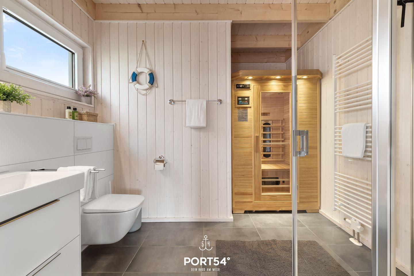 Willkommen in der "Marina Bay 54" in Olpenitz! Auf ca. 85m² bietet das Ferienhaus alles für einen erholsamen Urlaub an der Ostsee! Lassen Sie Ihre Urlaubstage auf dem Sofa ausklingen und zaubern Sie leckere Gerichte in der Küche. Für unsere kleinen Gäste stehen ein Hochstuhl und ein Kinderreisebett bereit. Das eine der beiden Schlafzimmer im 1. Obergeschoss bietet ein gemütliches Doppelbett (180x200cm), einen Schreibtisch und einen Flachbild-TV (mit Magenta TV). In dem anderen Schlafzimmer finden Sie zwei Einzelbetten (je 90x200cm), sowie eine Schlafcouch (140x200cm) vor. Für erholsame Nächte sind beide Schlafzimmer mit Insektenschutzgittern und Verdunkelungsmöglichkeiten ausgestattet. Das eine der beiden Badezimmer befindet sich im Erdgeschoss und verfügt über einen Handtuchtrockner, eine Dusche und das Highlight: eine Infrarotsauna! Wellness pur! Nach langen Strandspaziergängen können Sie sich hier wieder aufwärmen und entspannen. Das zweite Badezimmer im 1. Obergeschoss bietet einen Handtuchtrockner, einen Föhn und eine Badewanne. Vom Wohnzimmer aus gelangen Sie auf die Terrasse, wo Sie Ihren Morgenkaffee genießen und an lauen Abenden mit der ganzen Familie grillen können. An kalten Tagen lädt der Kamin zum aufwärmen ein und die Nintendo Switch verspricht Spielspaß für die ganze Familie! Die Liege und die Stuhlliege laden zum Lesen in der Sonne ein. Vor dem Haus ist ein Stellplatz vorhanden.