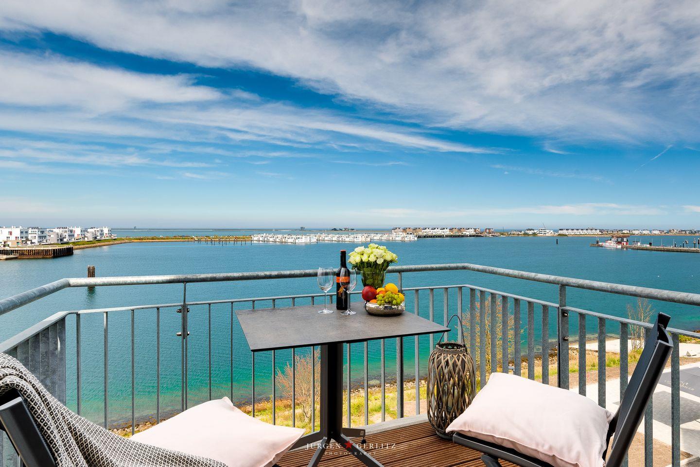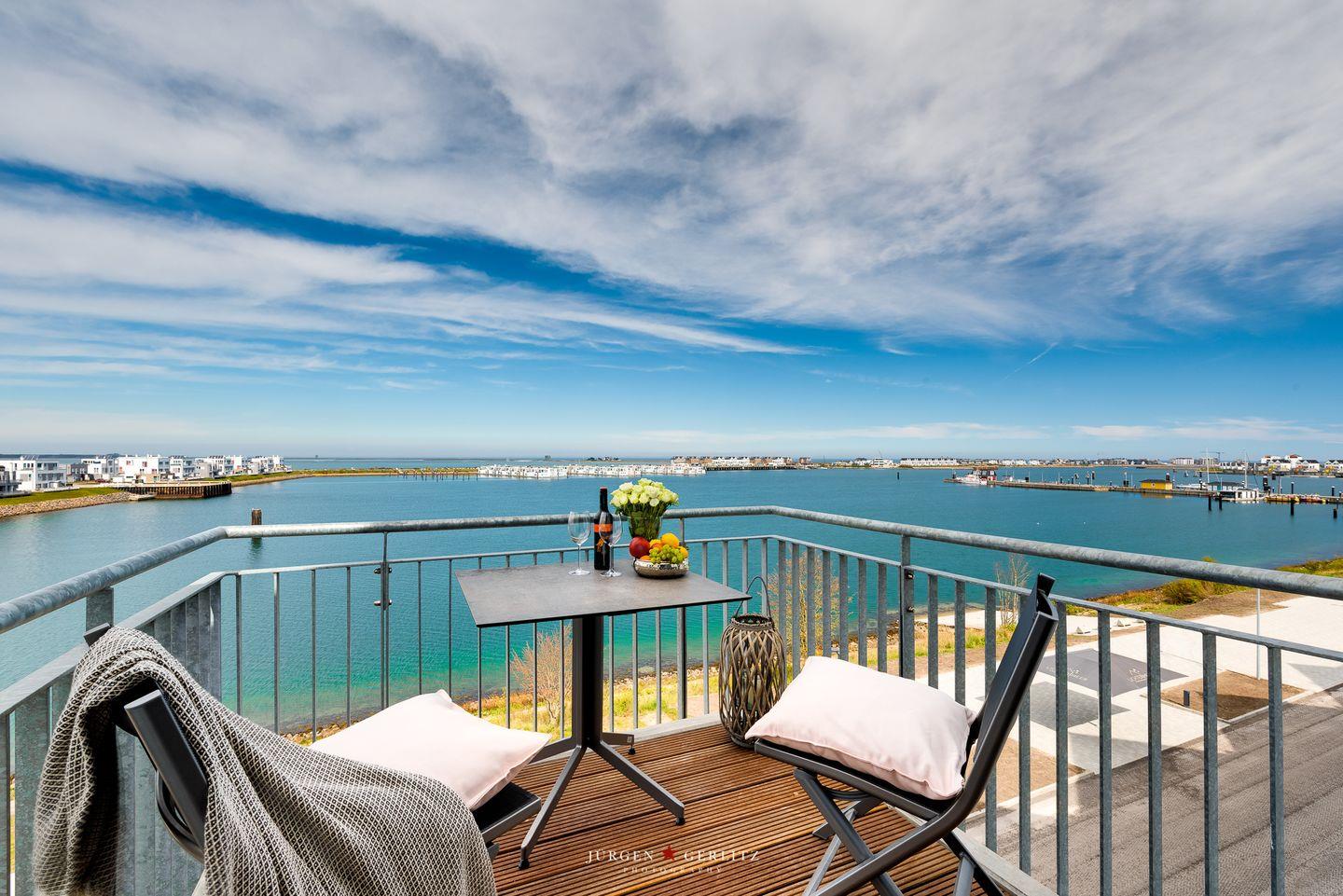 Exklusive Ferienwohnung Sailors View mit Balkon und Wasserblick in erster Reihe am Hafen von Olpenitz.