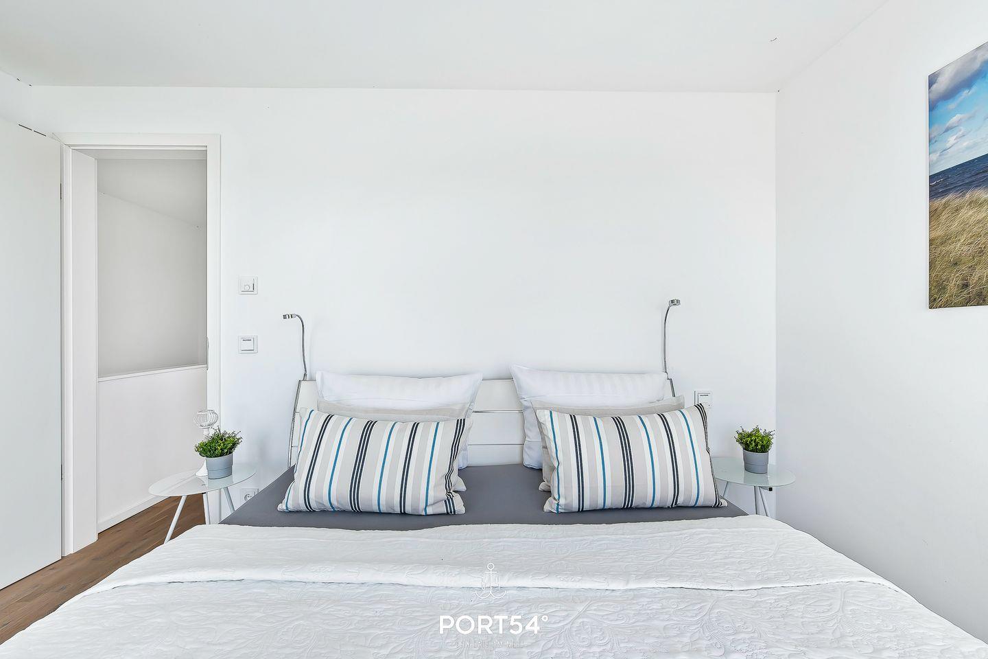 Die beiden Schlafzimmer im Obergeschoss bieten Platz für bis zu vier Erwachsene. Eines der Schlafzimmer verfügt zusätzlich über eine eigene Terrasse mit Blick auf die Schlei. Einen weiteren Schlafplatz findest Du auf dem gemütlichen Schlafsofa im Wohnzimmer.