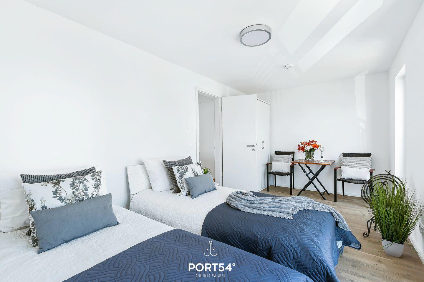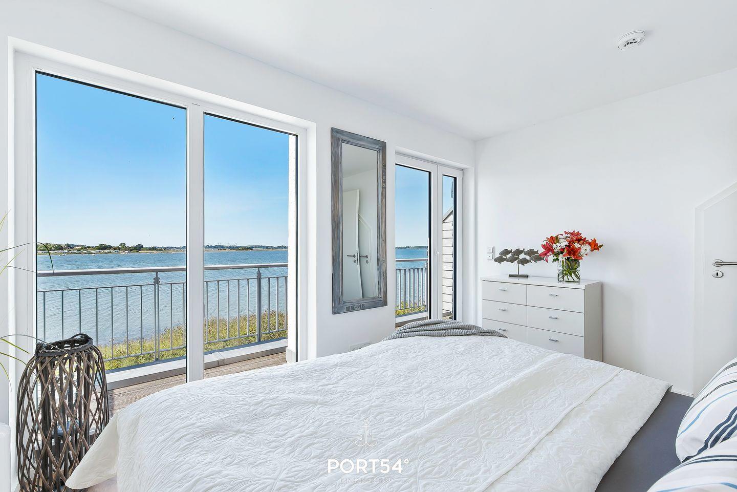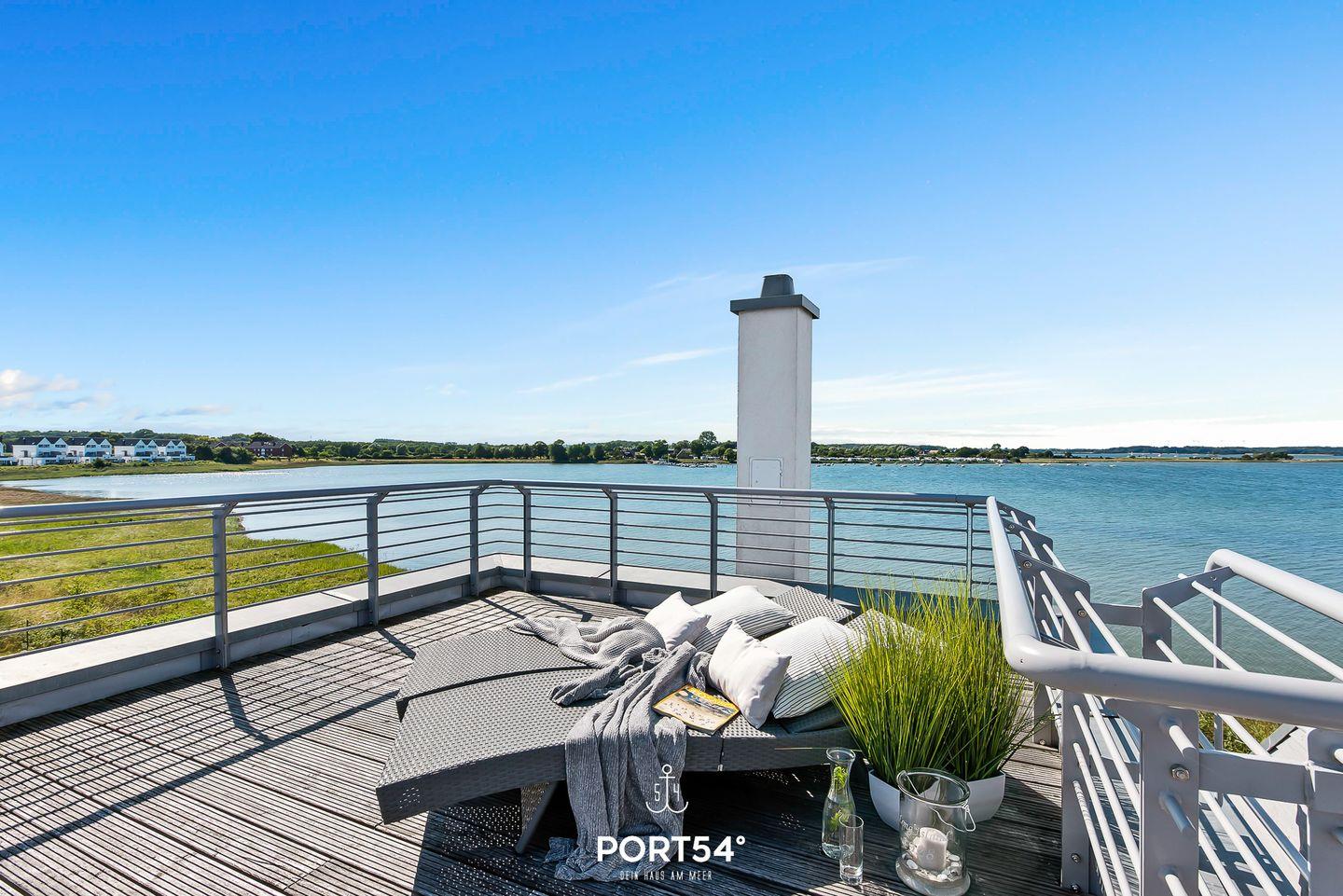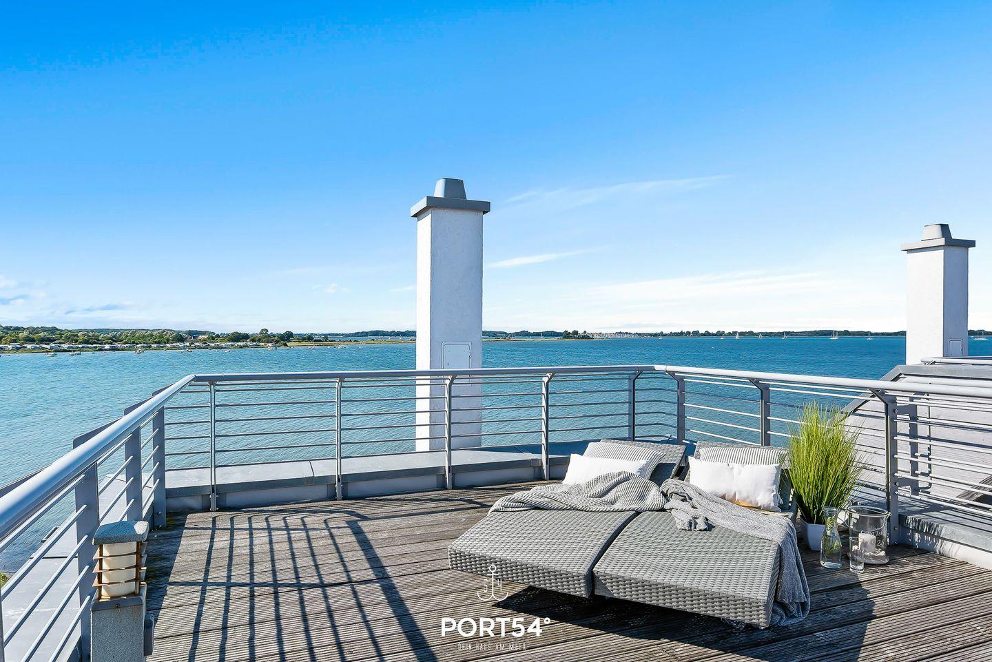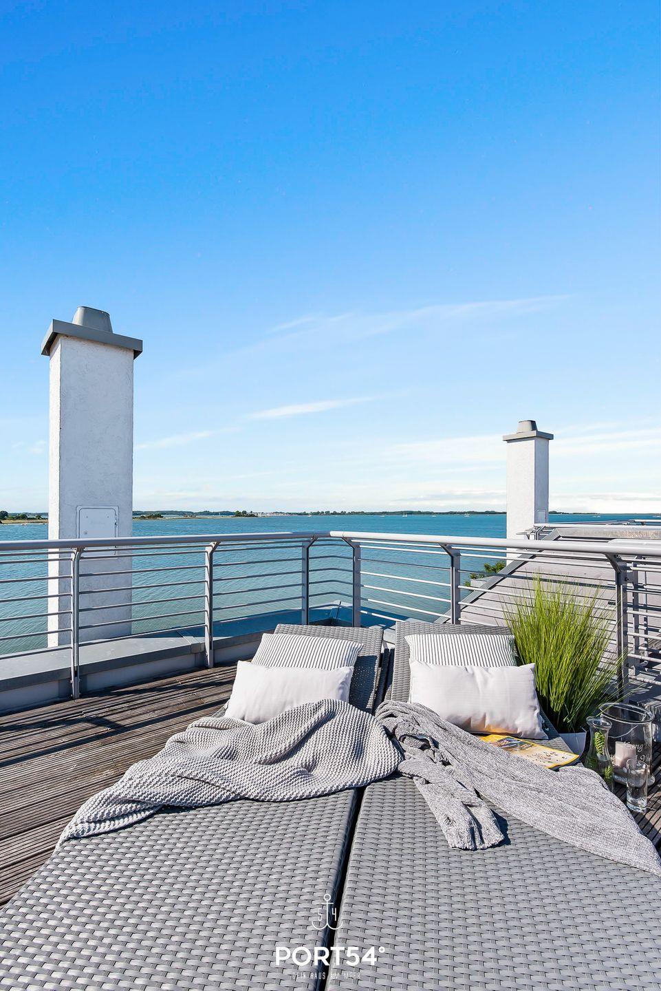 Ein weiteres Highlight ist die ca. 25 m² große Dachterrasse, die zum Sonnenbaden einlädt oder dazu, den Sonnenuntergang bei einem atemberaubenden 360°-Blick auf die Schlei, ihre Mündung sowie den Hafen des Resorts zu genießen.