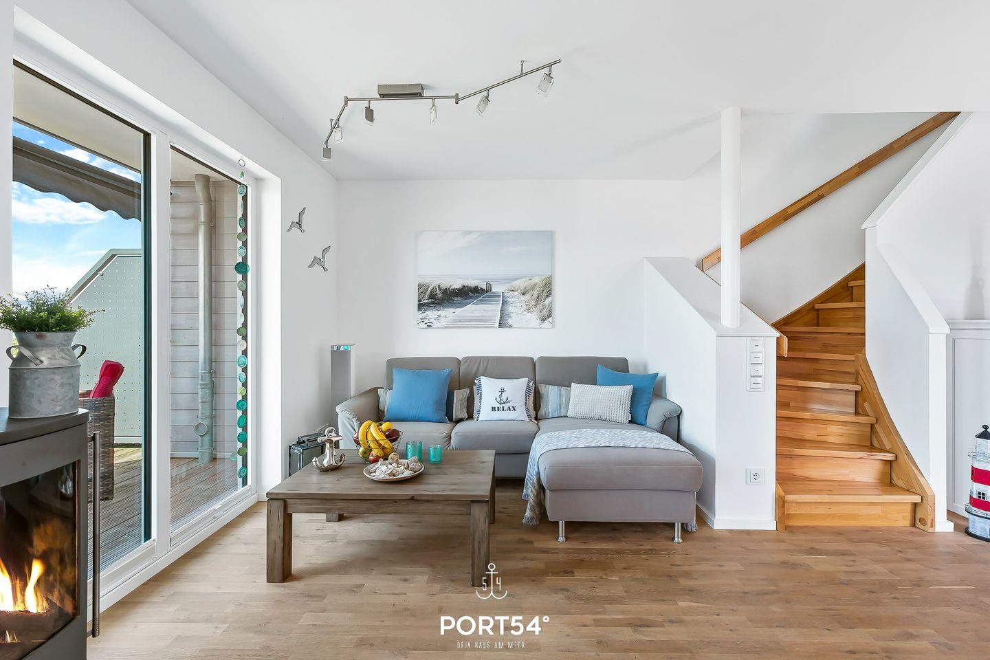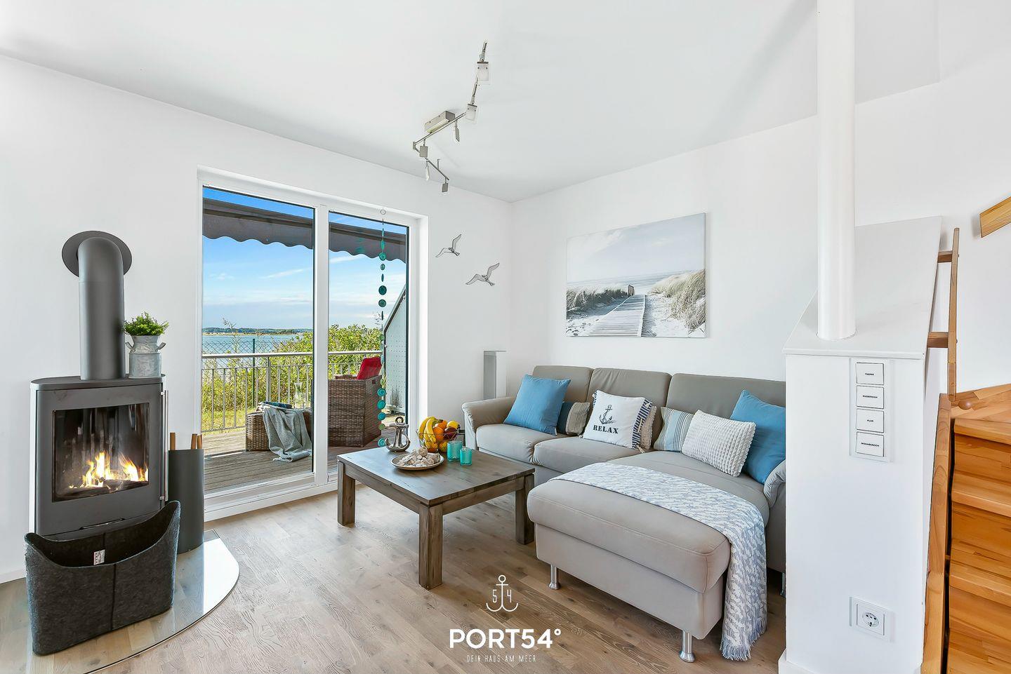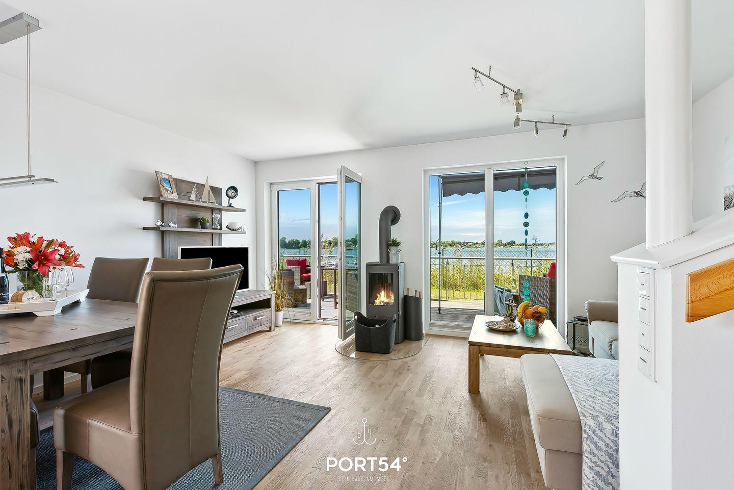 Der zentrale Punkt des Hauses ist der lichtdurchflutete, offene Wohn- und Essbereich mit Kamin, einer gemütlichen Sitzlandschaft, einem Esstisch für fünf Personen sowie dem direkten Zugang zu einer Terrasse. Durch die bodentiefen Fenster genießt Du einen wunderschönen Blick über die Schlei-Landschaft.